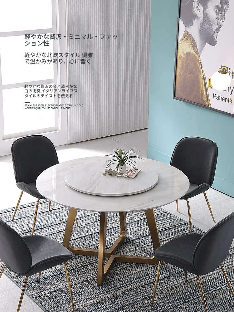 北欧風のラグジュアリー金属大理石丸型ダイニングテーブル&チェアセット、回転式、4~6人用、シンプルでモダンな小型住宅に最適な食卓・商談用テーブル!