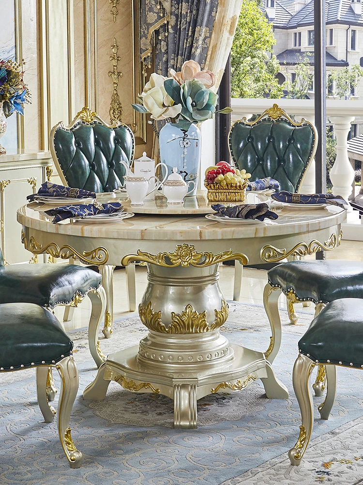 ヨーロピアンスタイルの丸型ダイニングテーブル、アメリカンウッド製の大理石仕上げ。フレンチシックな軽奢華スタイルのダイニング家具、真皮製の彫刻入り豪華ダイニングチェアで、特別な食卓を演出します。
