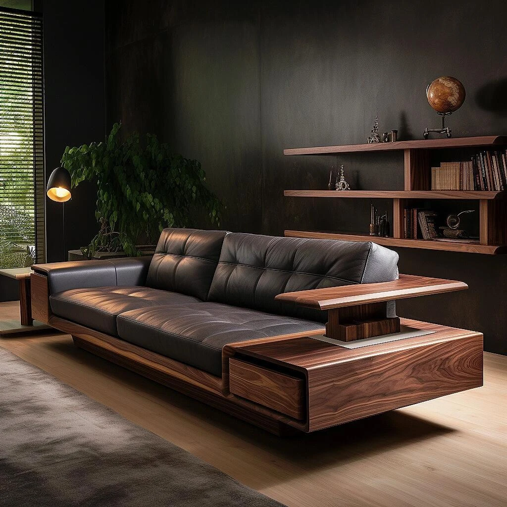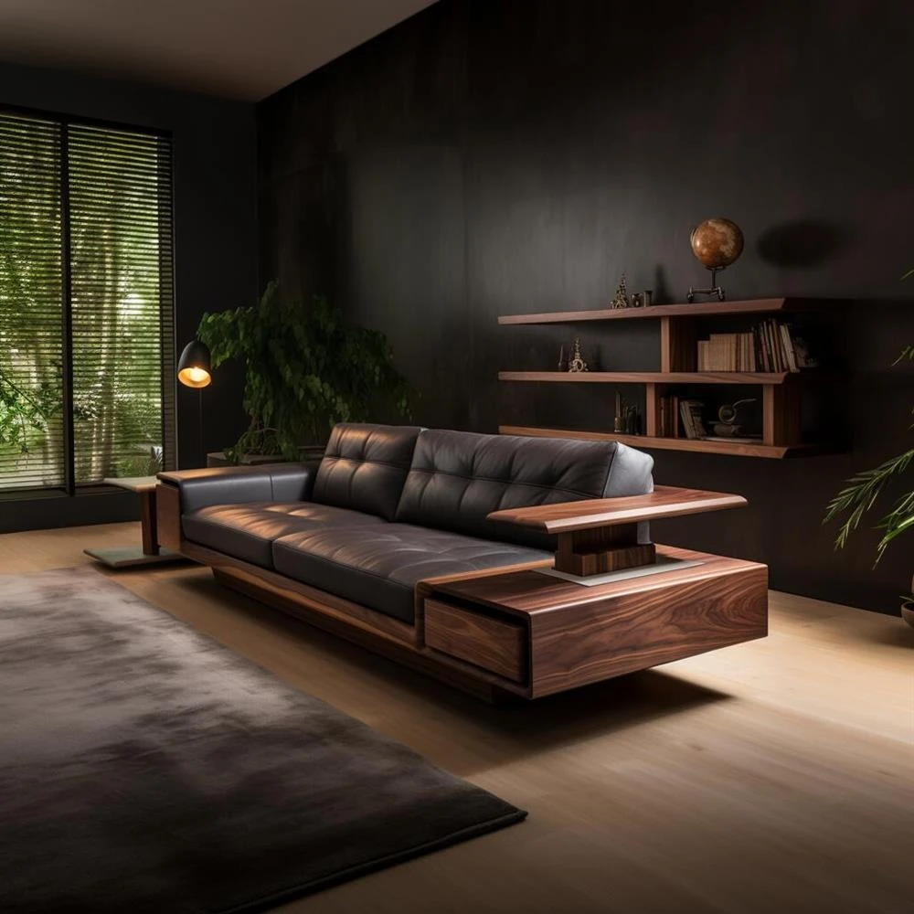 Elegant Black Tofu Block Sofa with Walnut Wood - High-End Chinese Style Three-Seat Solid Wood Sofa for a Modern Minimalist Living Room