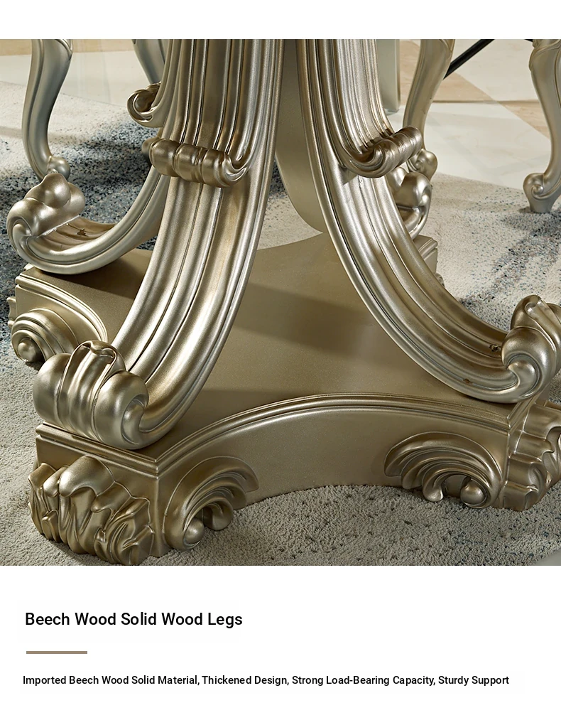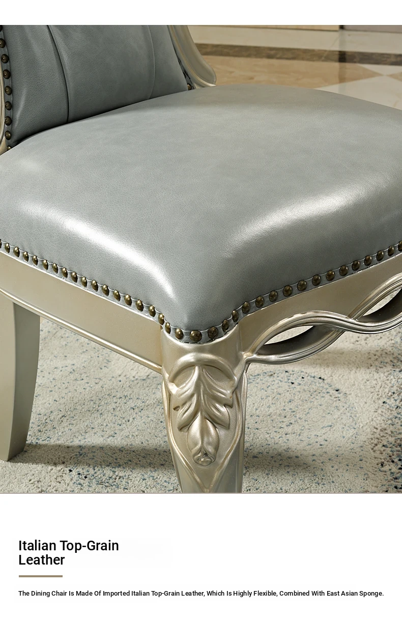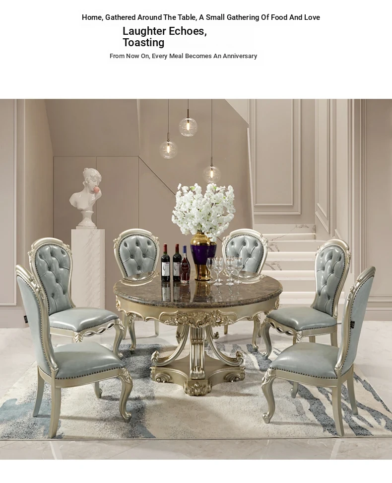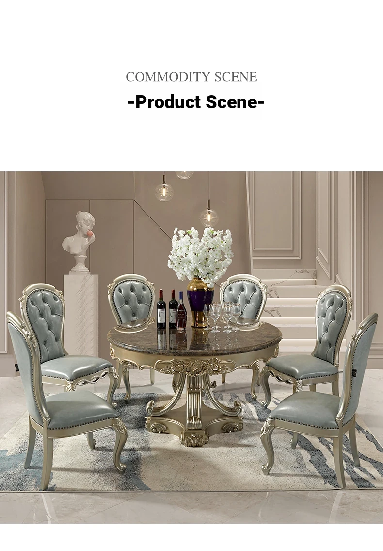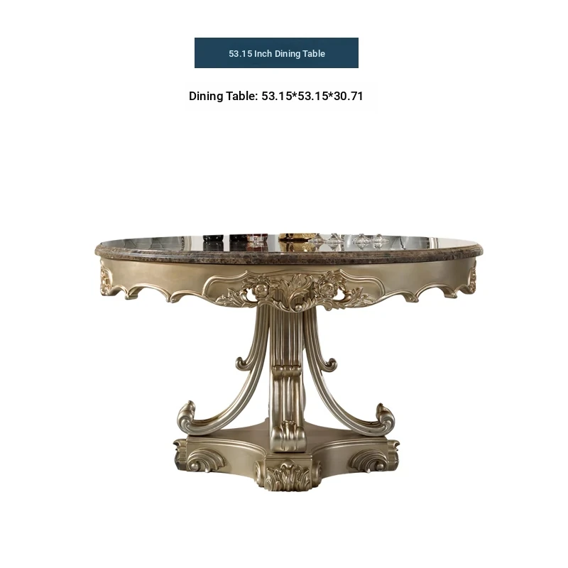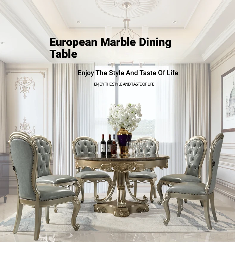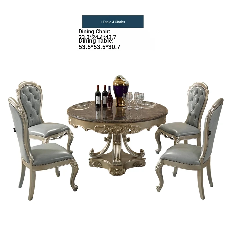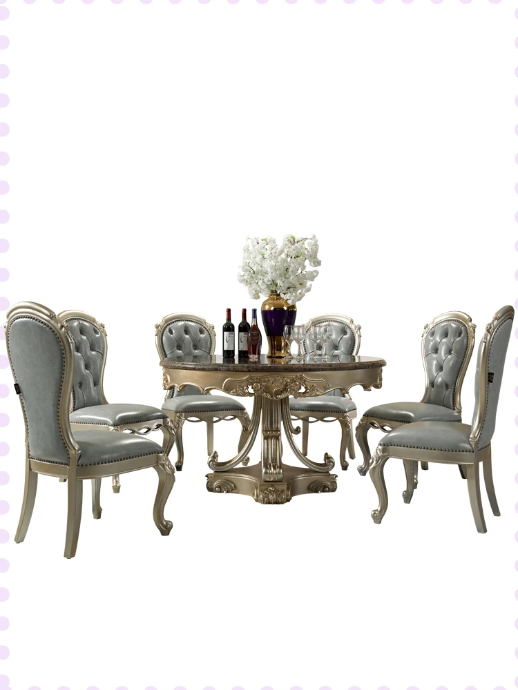 Elegant European Round Dining Table with Solid Wood and Marble Top, Luxurious French-style Furniture Set with Genuine Leather Chairs and Exquisite Carvings - Perfect for Upscale Dining Experiences