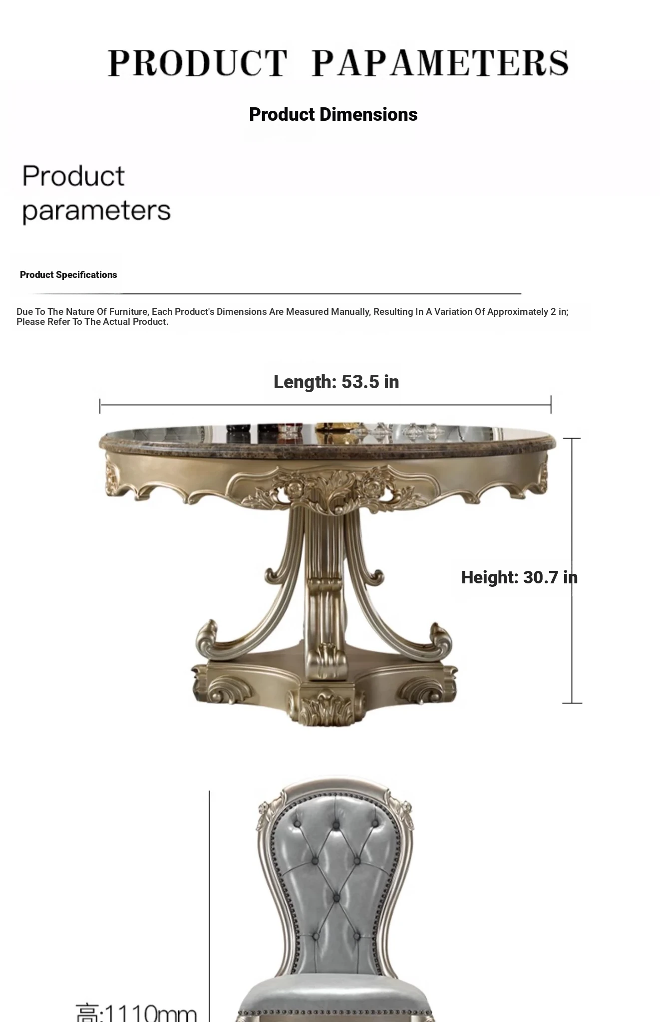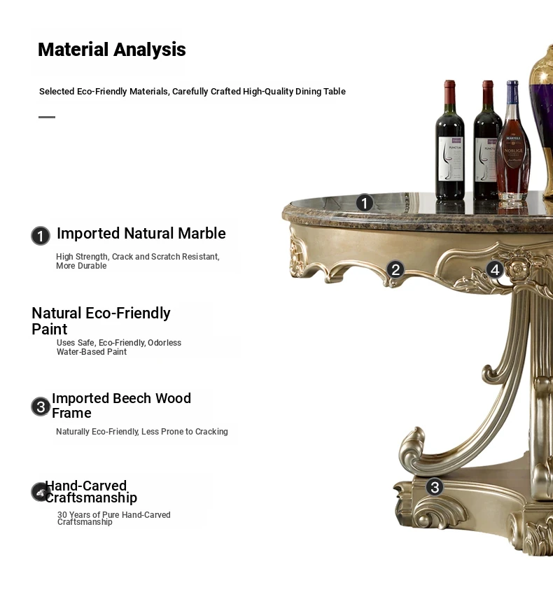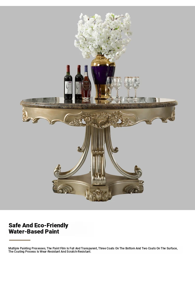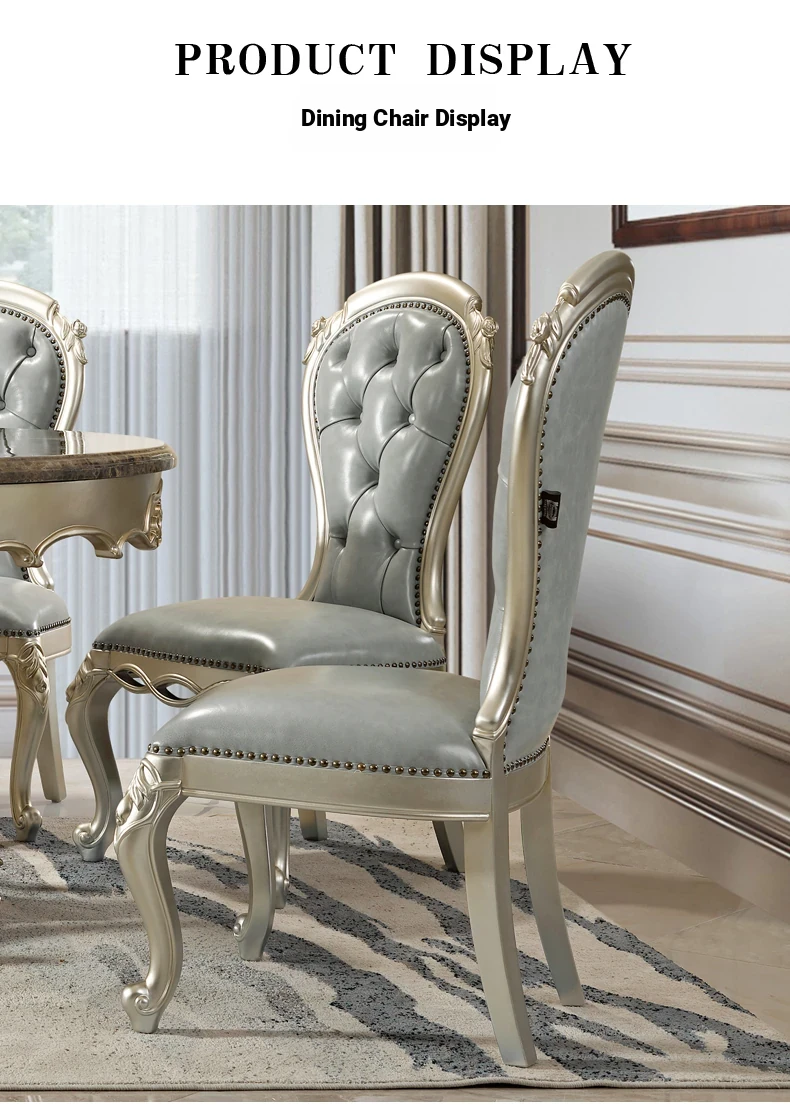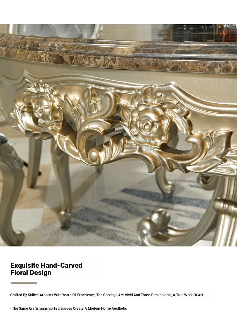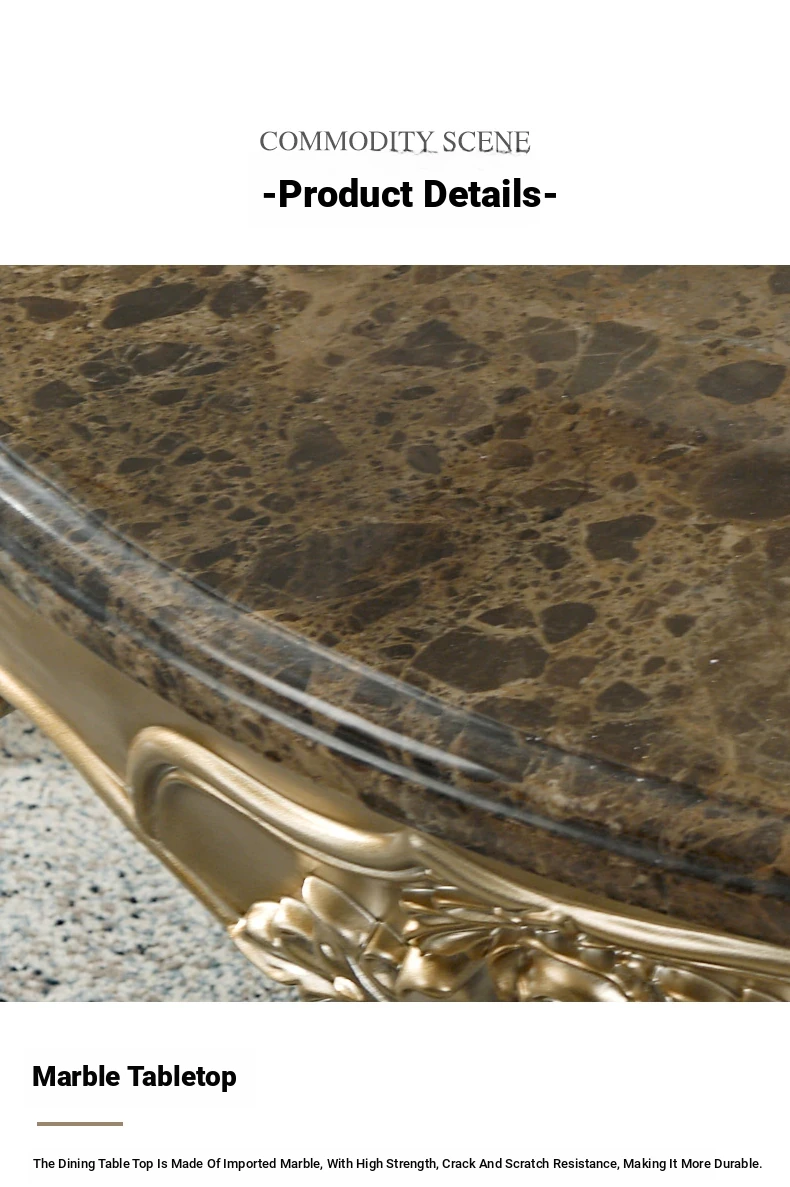 Elegant European Round Dining Table with Solid Wood and Marble Top, Luxurious French-style Furniture Set with Genuine Leather Chairs and Exquisite Carvings - Perfect for Upscale Dining Experiences