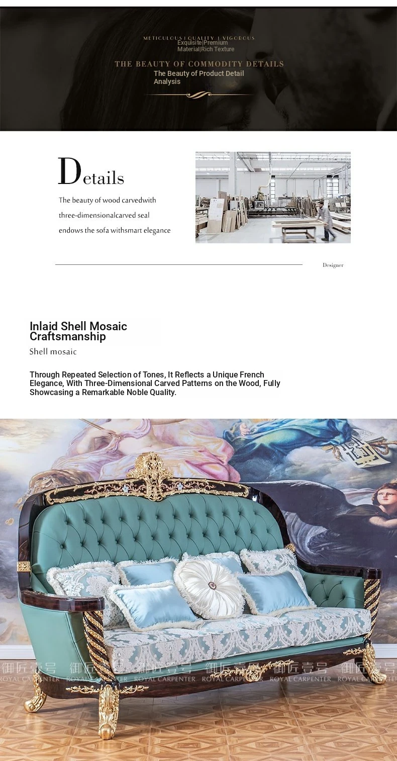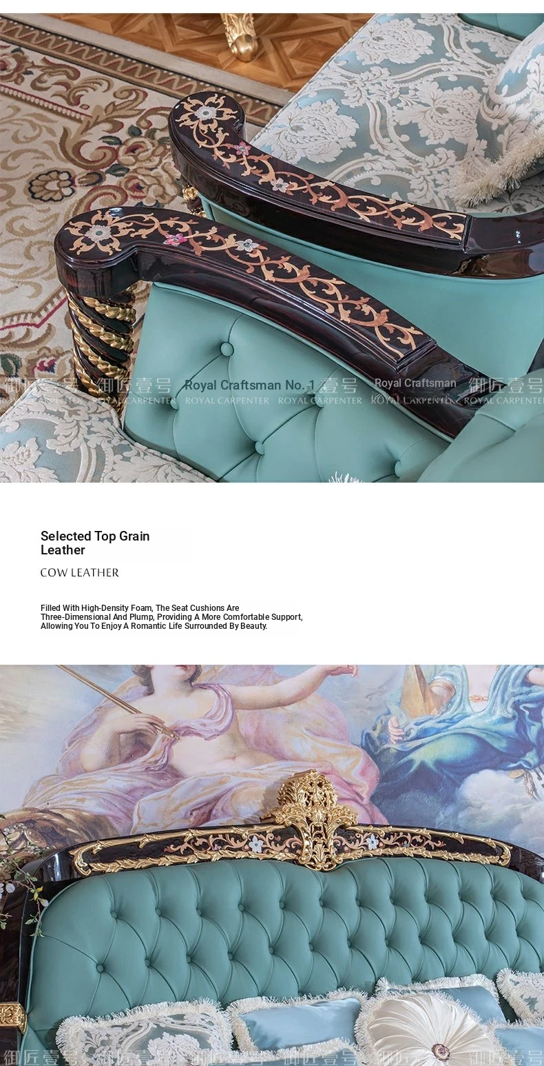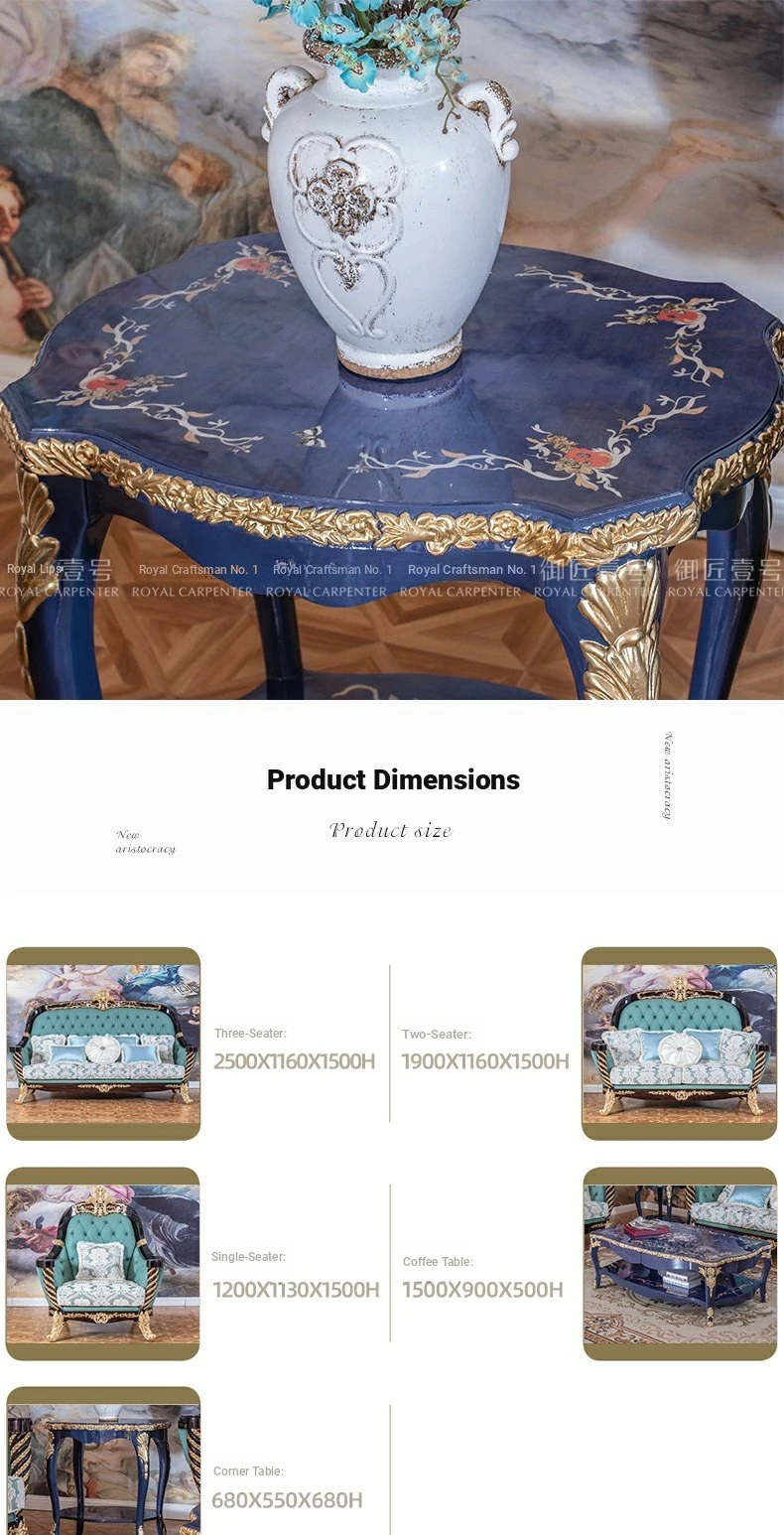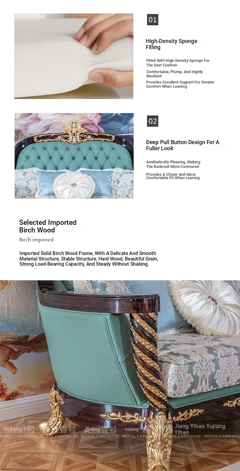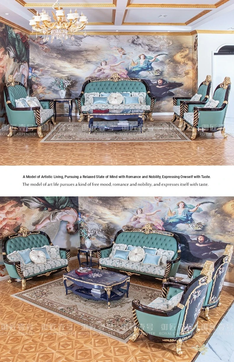 Elegant French Style Fabric Sofa Set with Solid Wood Carvings and Leather Upholstery – Perfect for Spacious Living Rooms, Combining Comfort and Luxury in Your Home Décor.