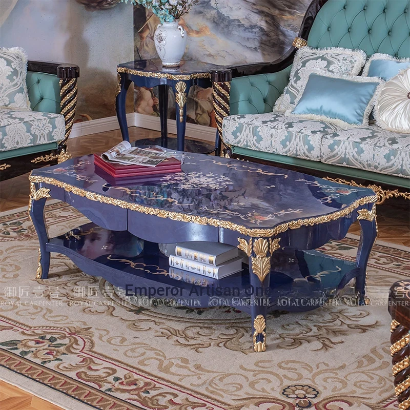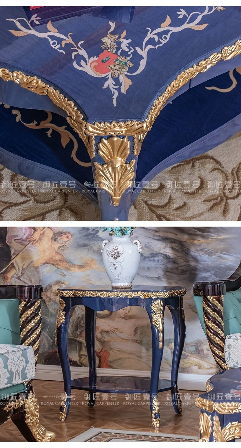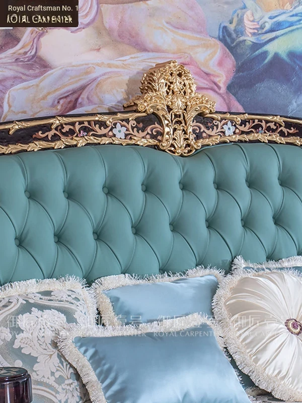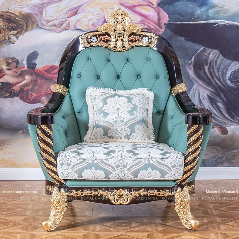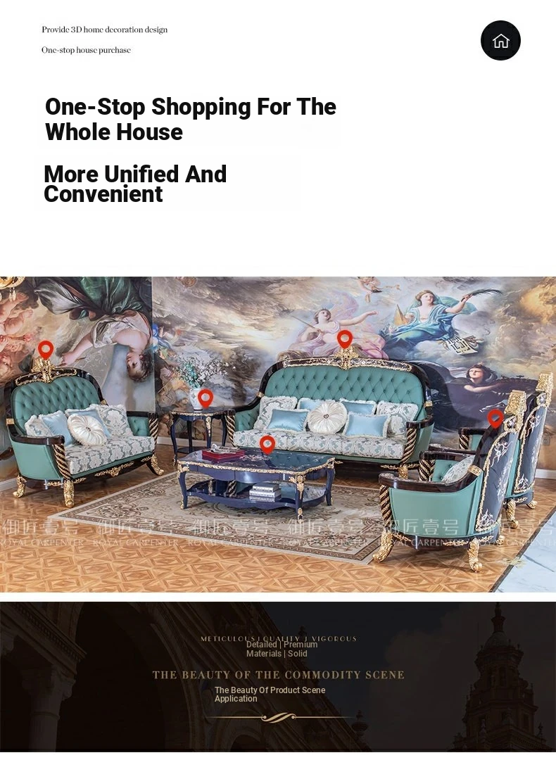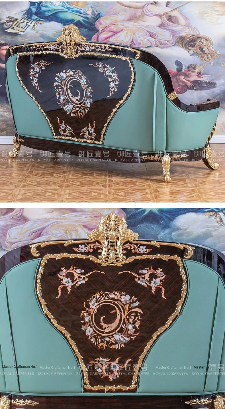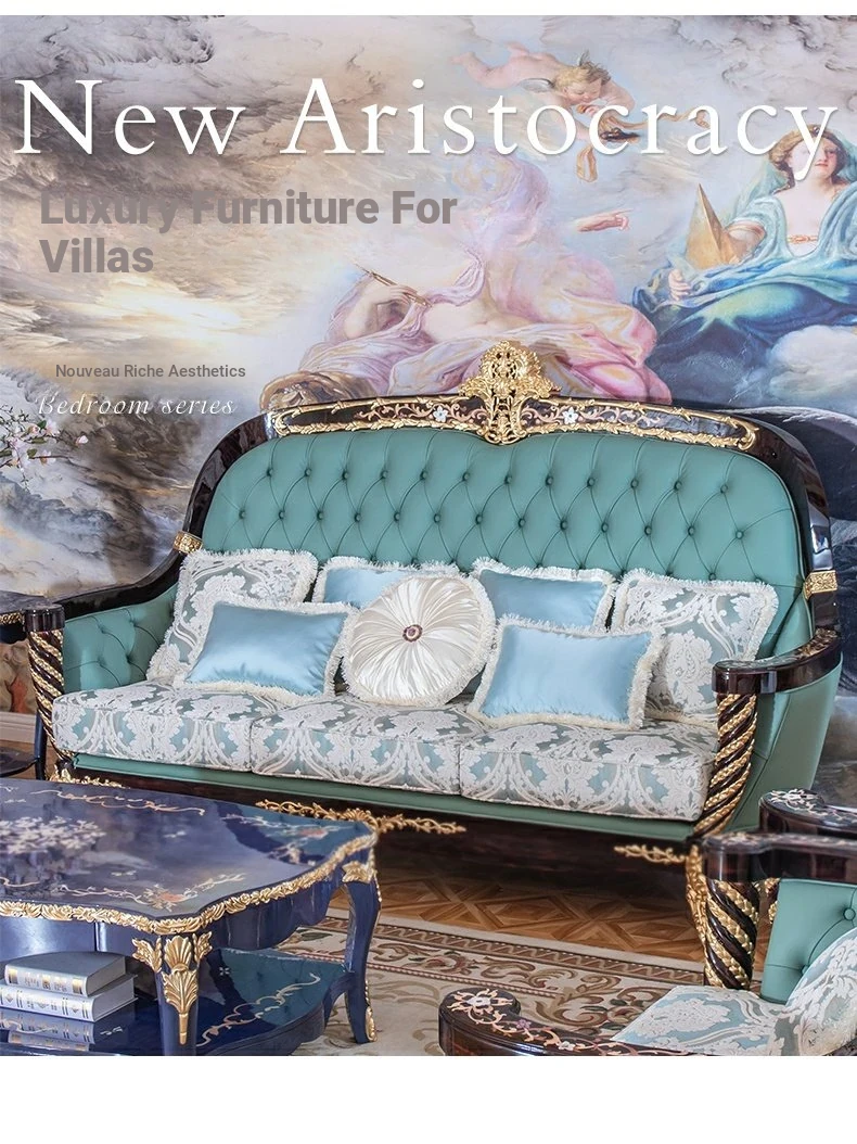 Elegant French Style Fabric Sofa Set with Solid Wood Carvings and Leather Upholstery – Perfect for Spacious Living Rooms, Combining Comfort and Luxury in Your Home Décor.