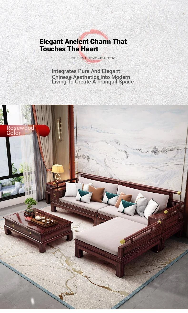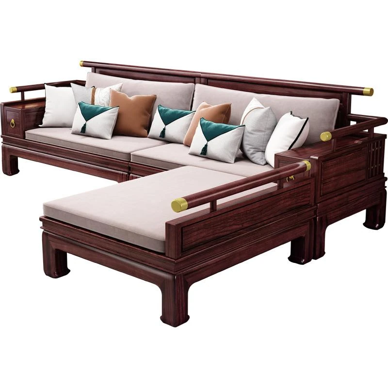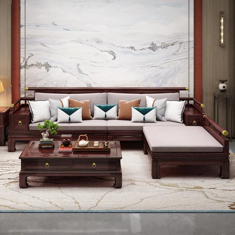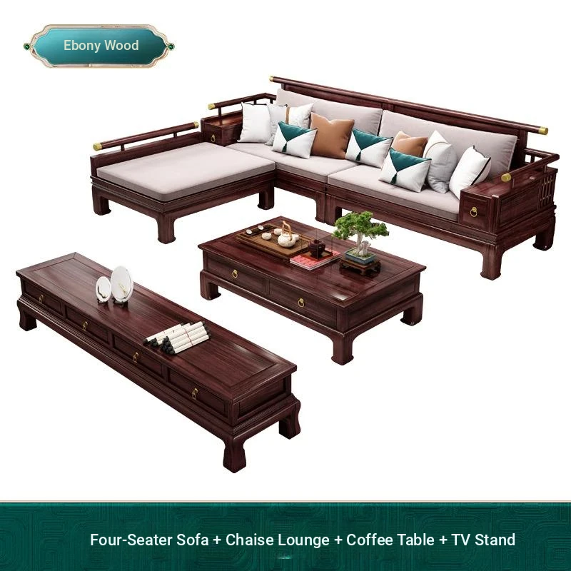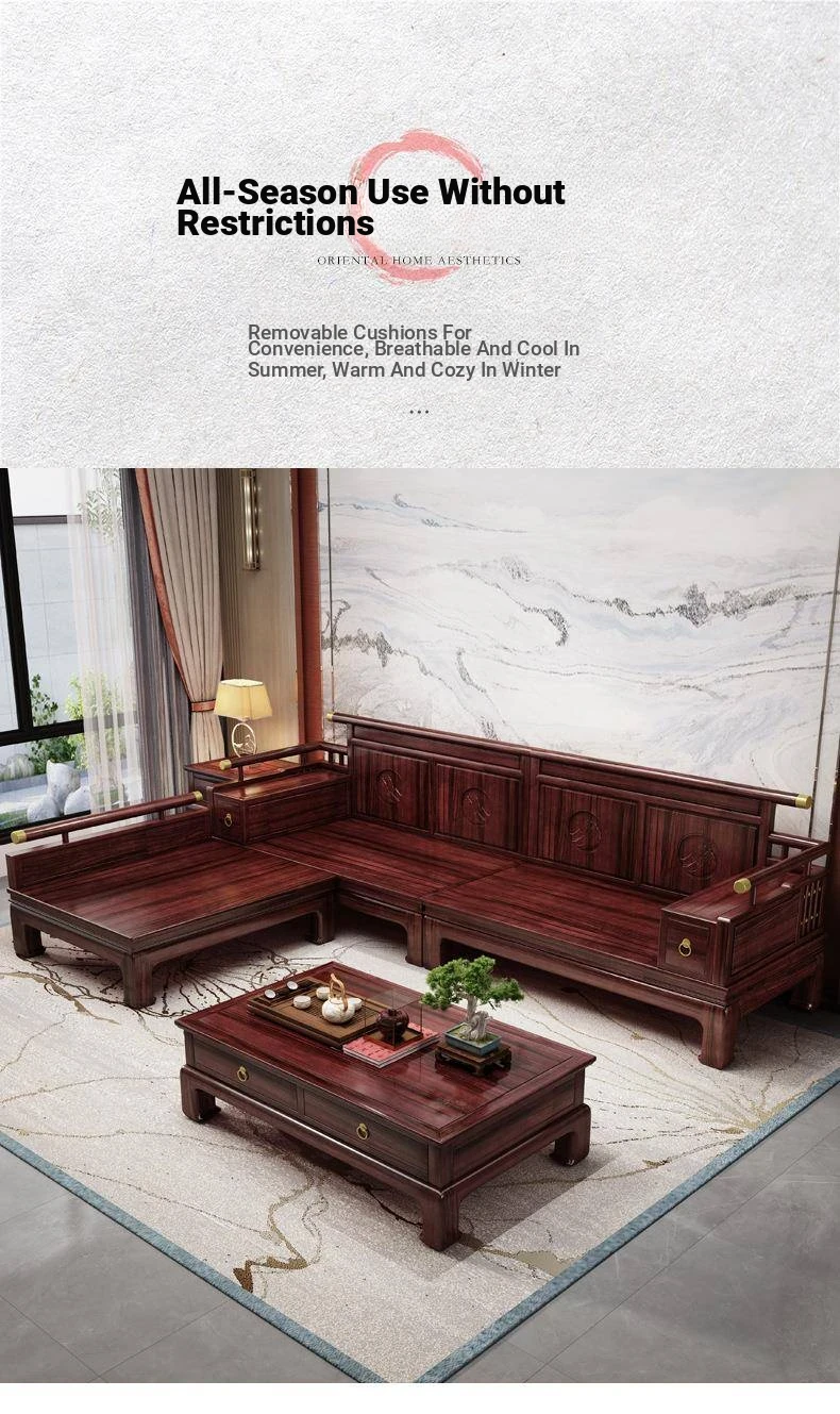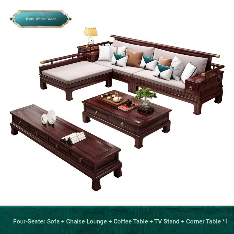 Elegant New Chinese Style Black Gold Wood Solid Corner Sofa with Chaise - Versatile for Winter and Summer, Perfect for Small Spaces, Classical Faux Wood Living Room Furniture
