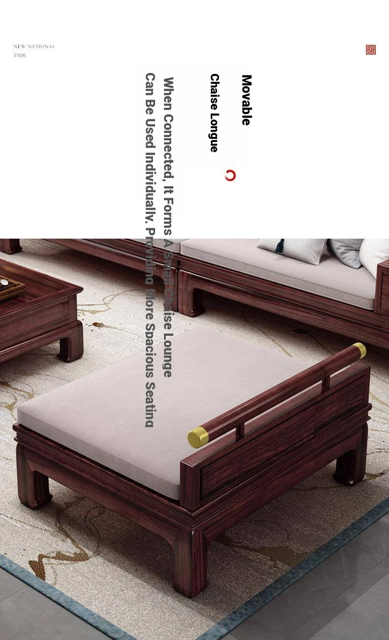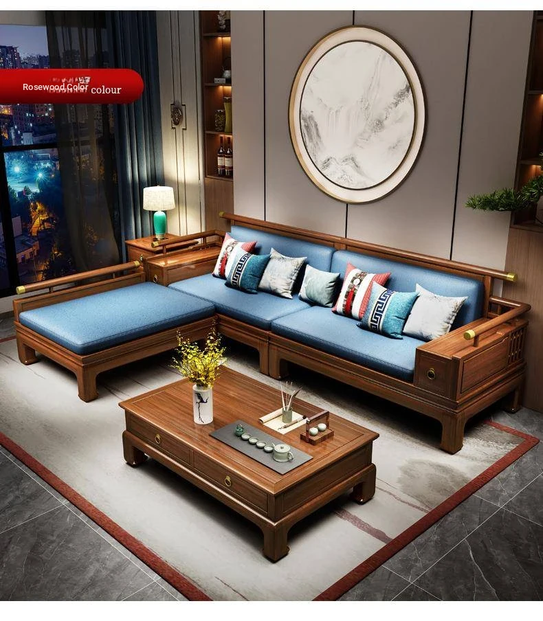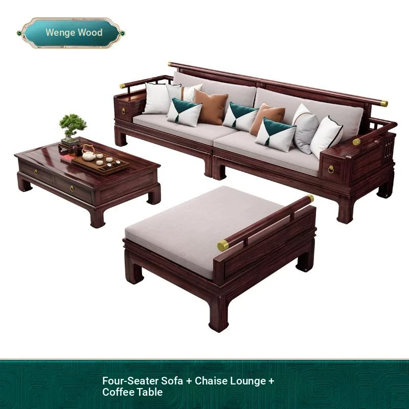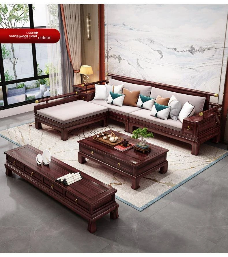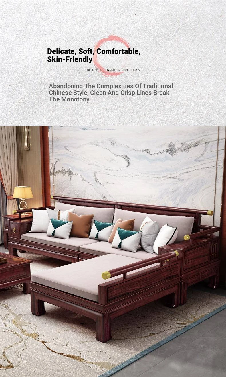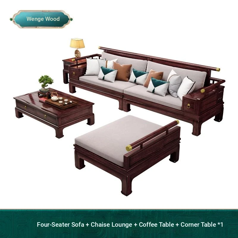 Elegant New Chinese Style Black Gold Wood Solid Corner Sofa with Chaise - Versatile for Winter and Summer, Perfect for Small Spaces, Classical Faux Wood Living Room Furniture