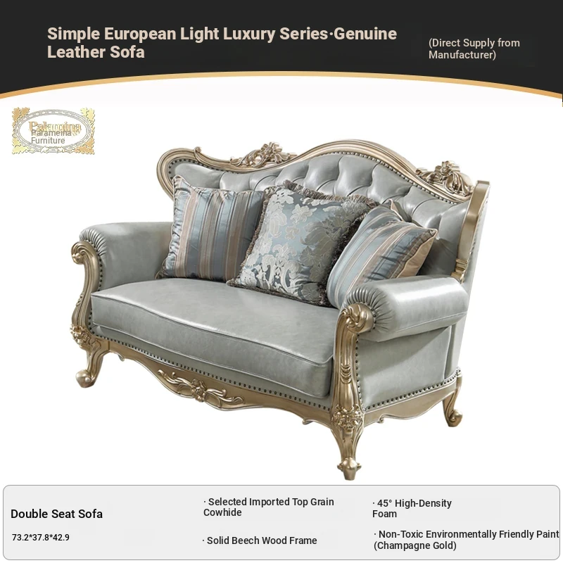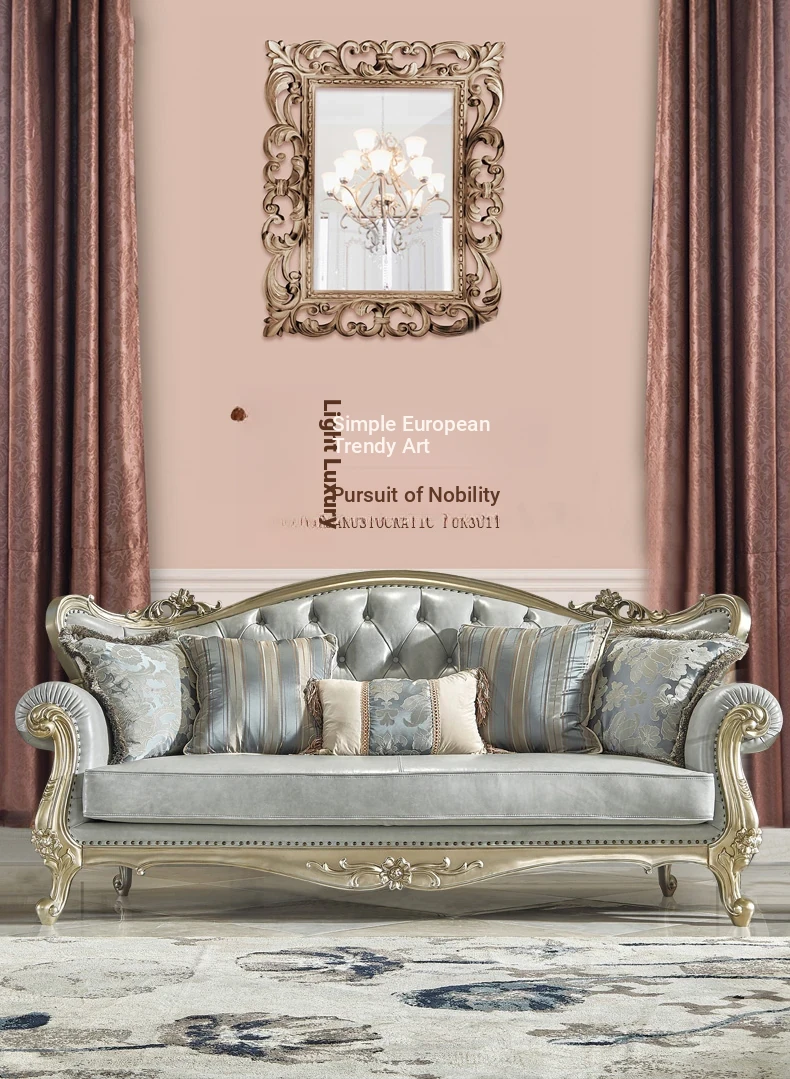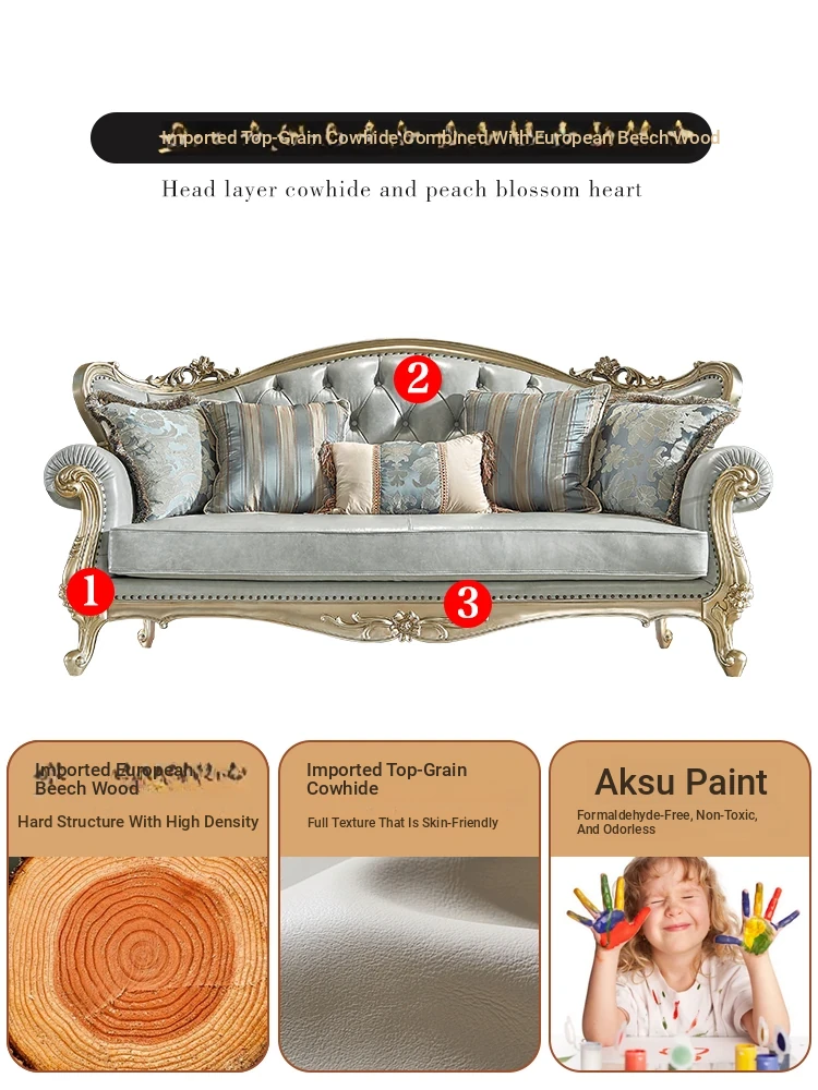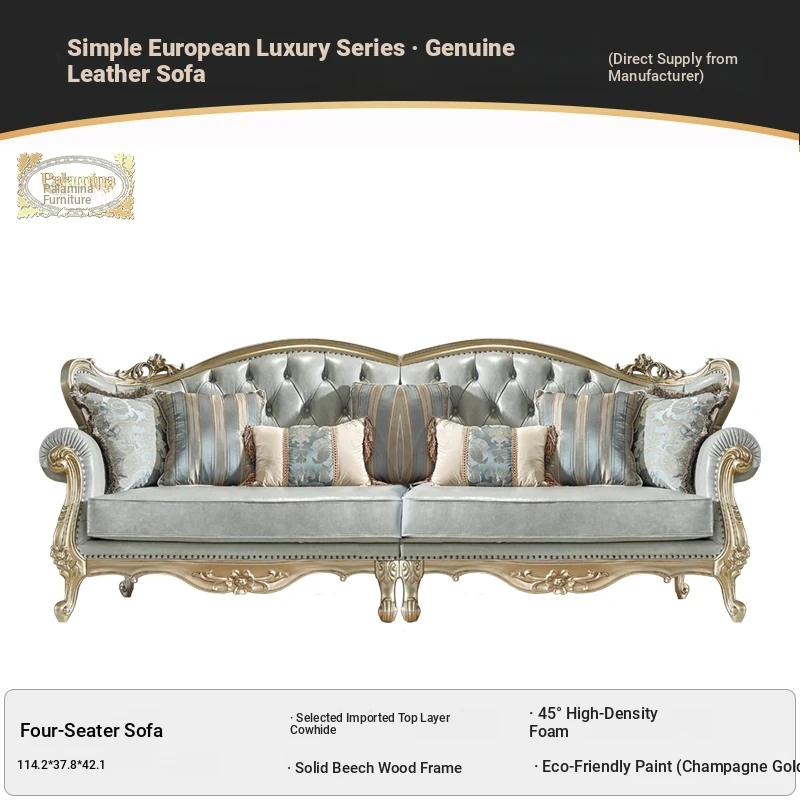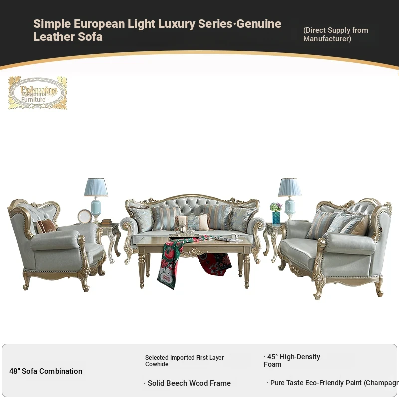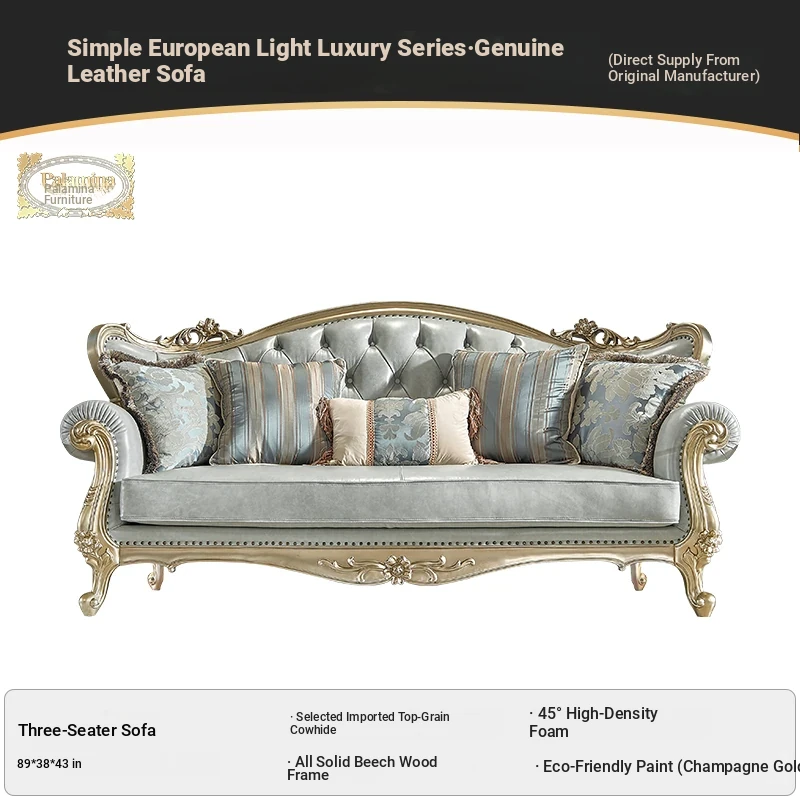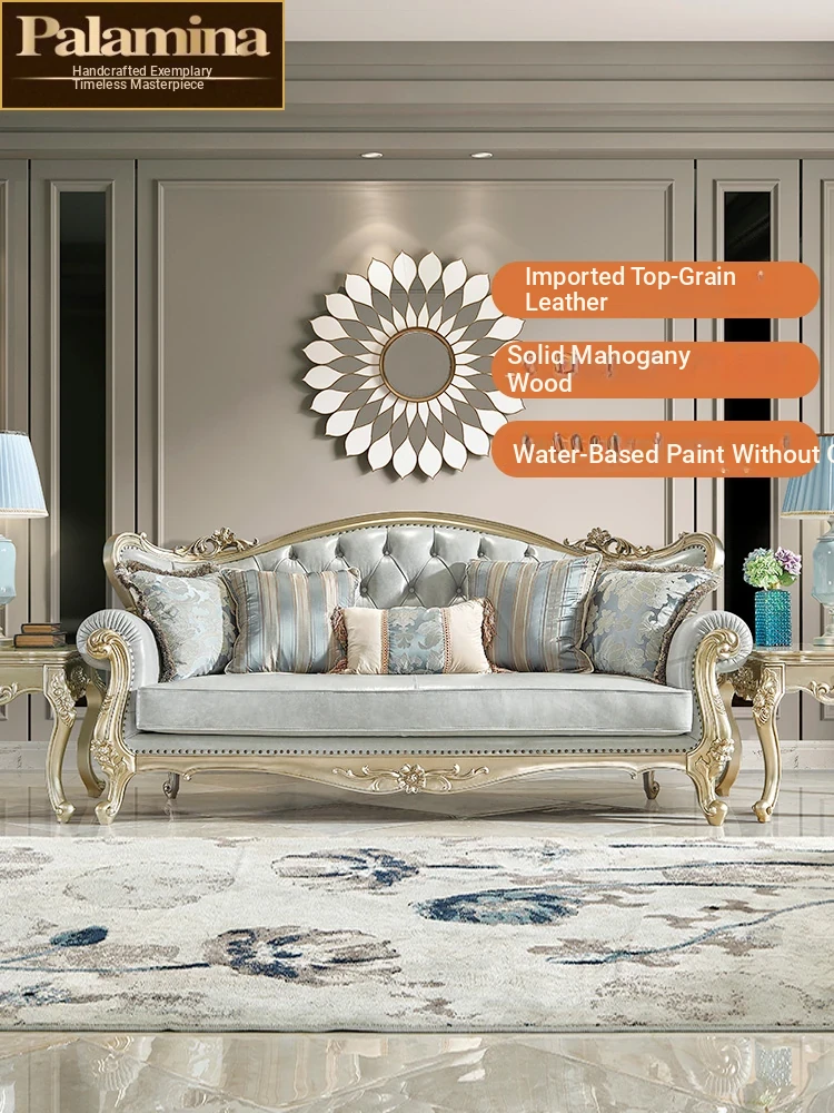 European Style Genuine Leather Sofa - American Light Luxury, Top-Grain Cowhide, French Full Solid Wood, 3-Seater Combination Living Room Furniture - Luxurious Comfort for Your Home