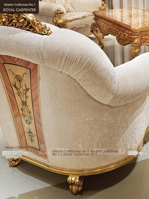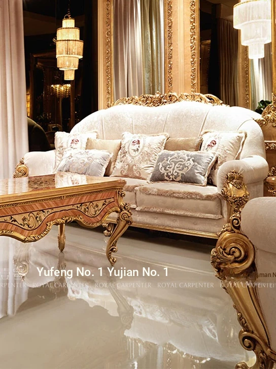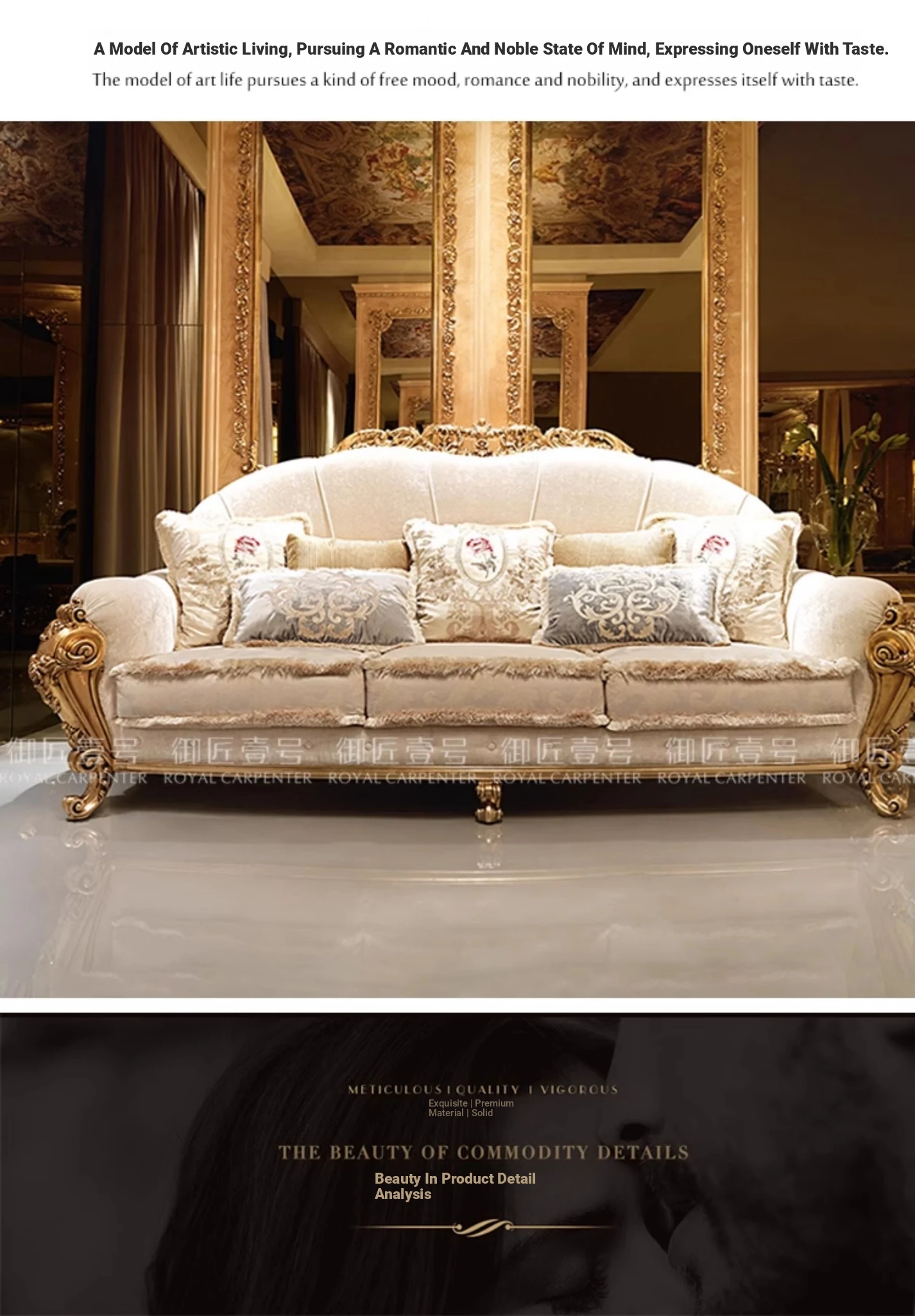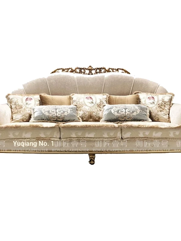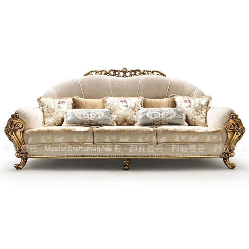 Luxurious European-Style Solid Wood Carved Golden Fabric Sofa Set for Large High-End Villas - Elegant French Living Room Furniture
