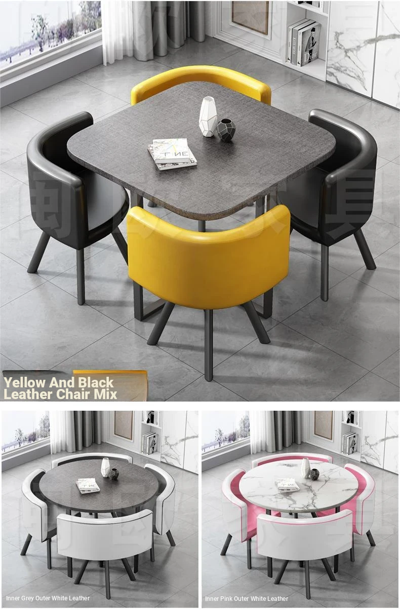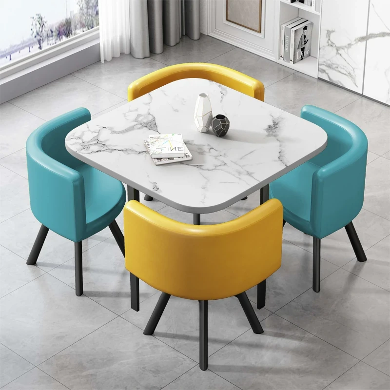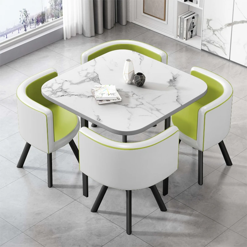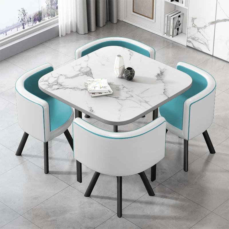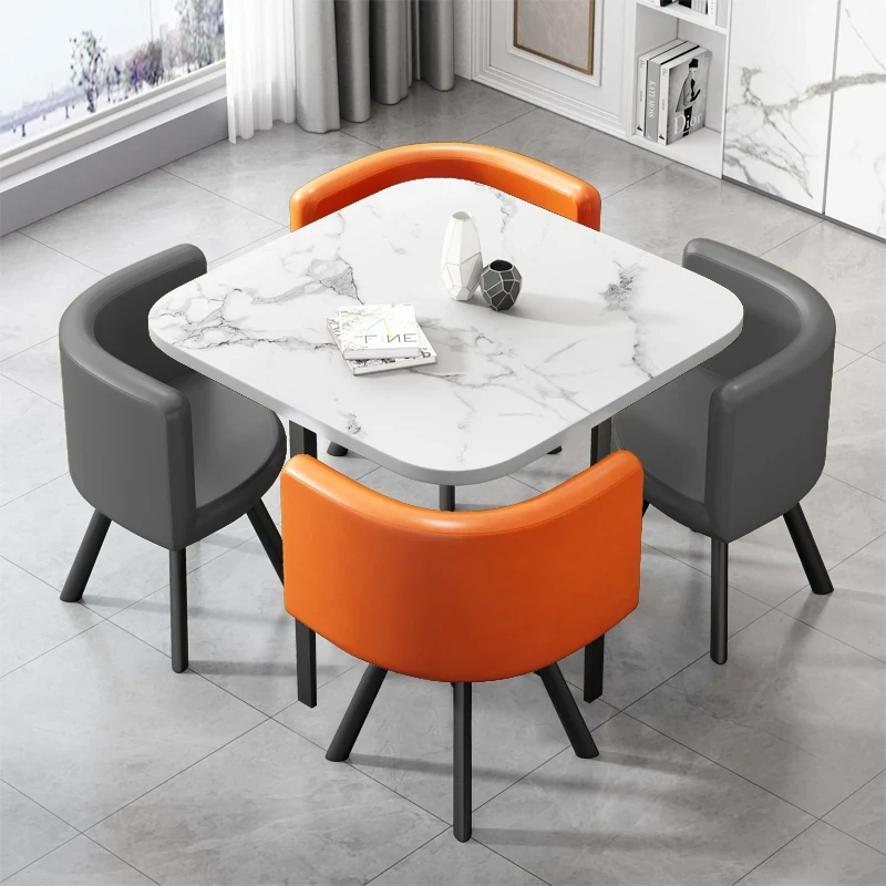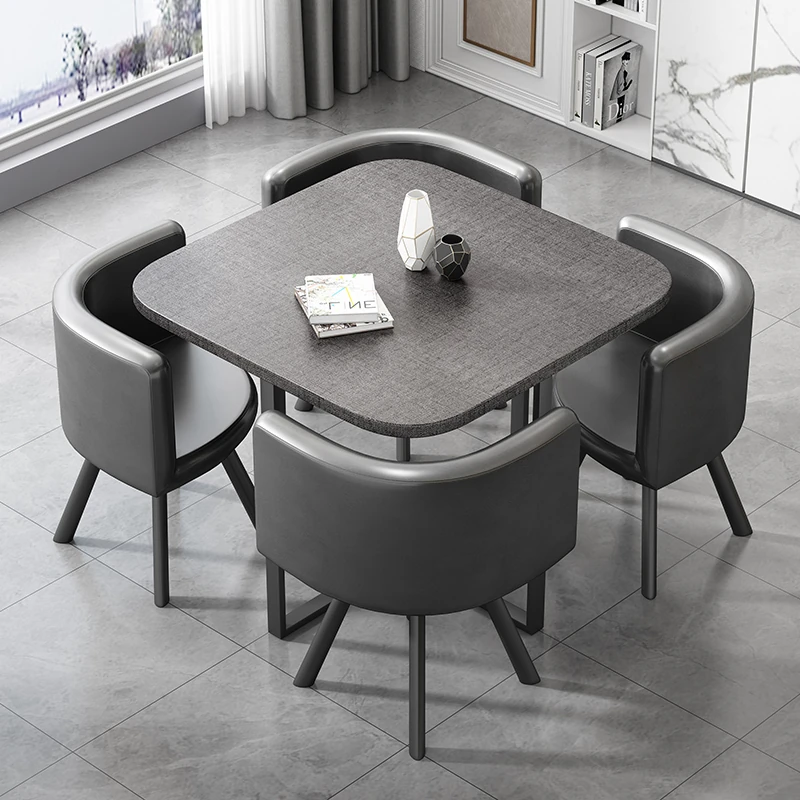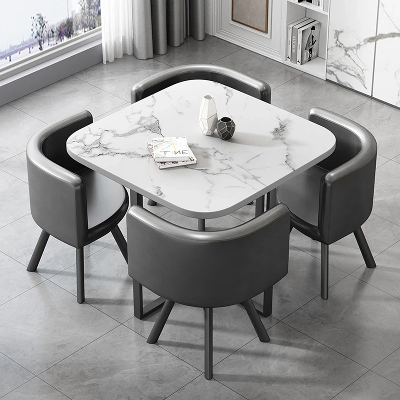 Imitation stone grain square + gray leather chair 1 table 4 chairs