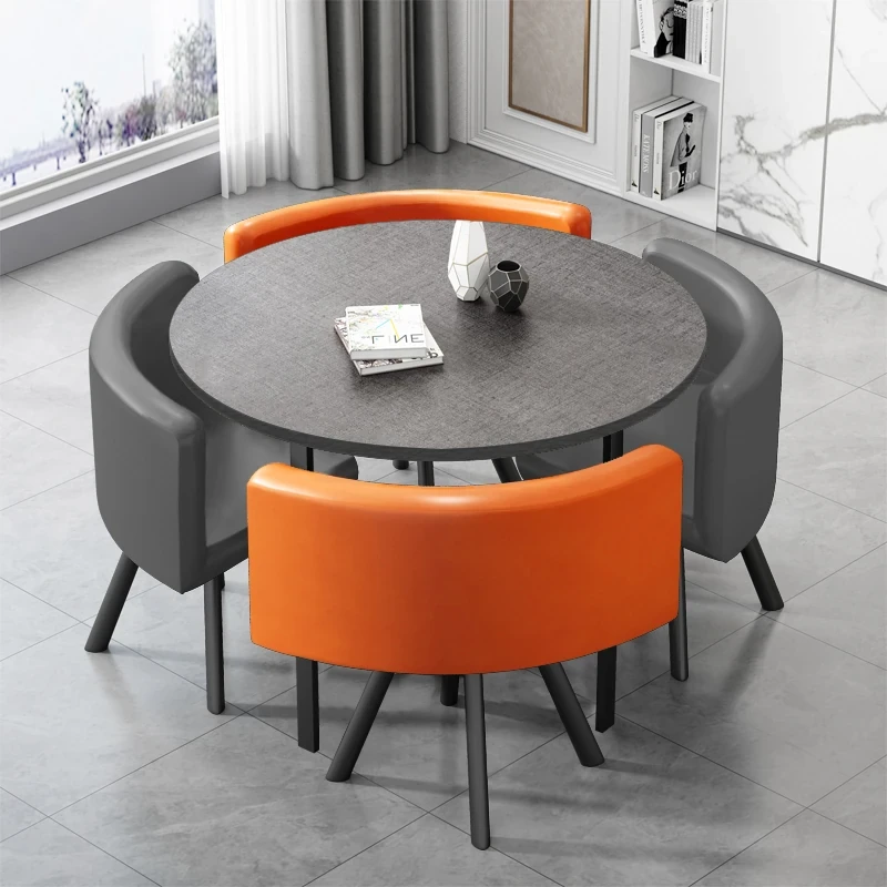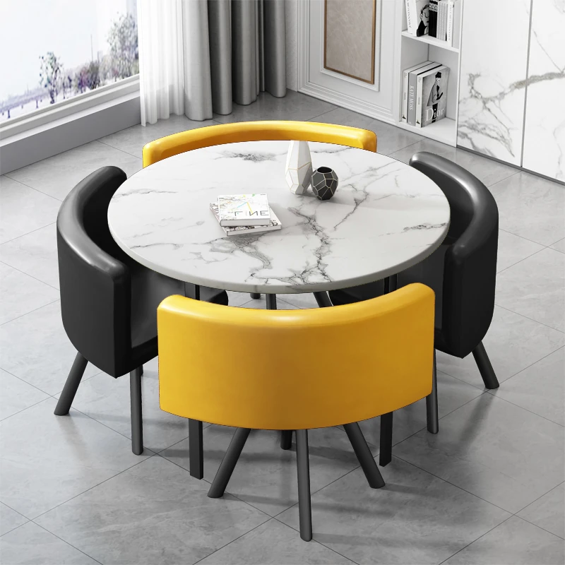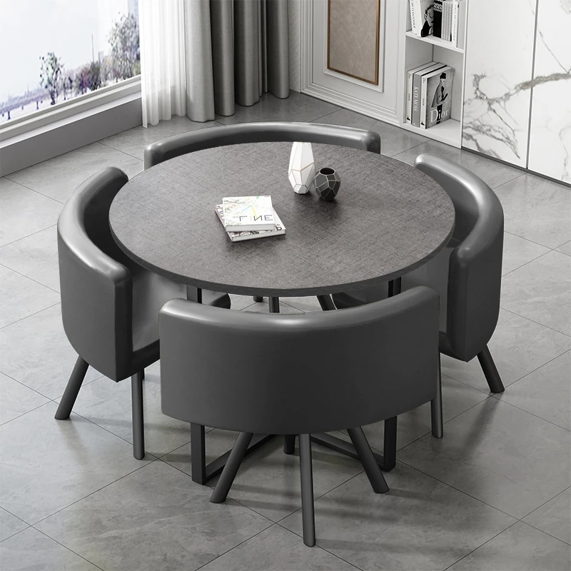 Imitation stone grain round + gray leather chair 1 table 4 chairs