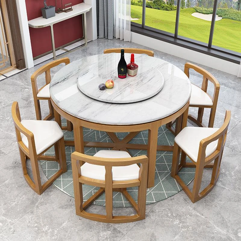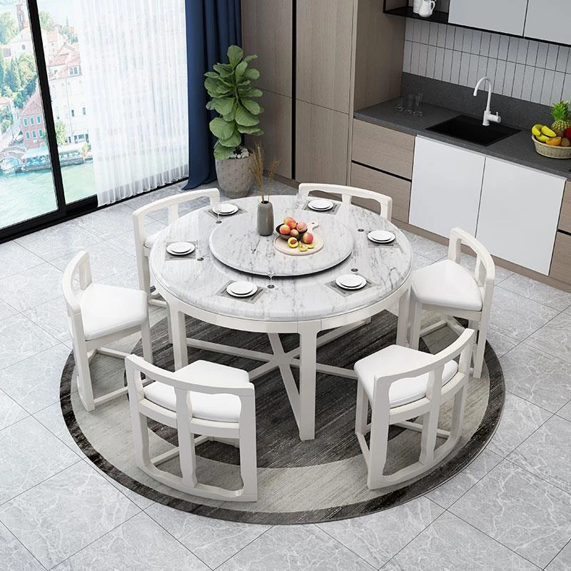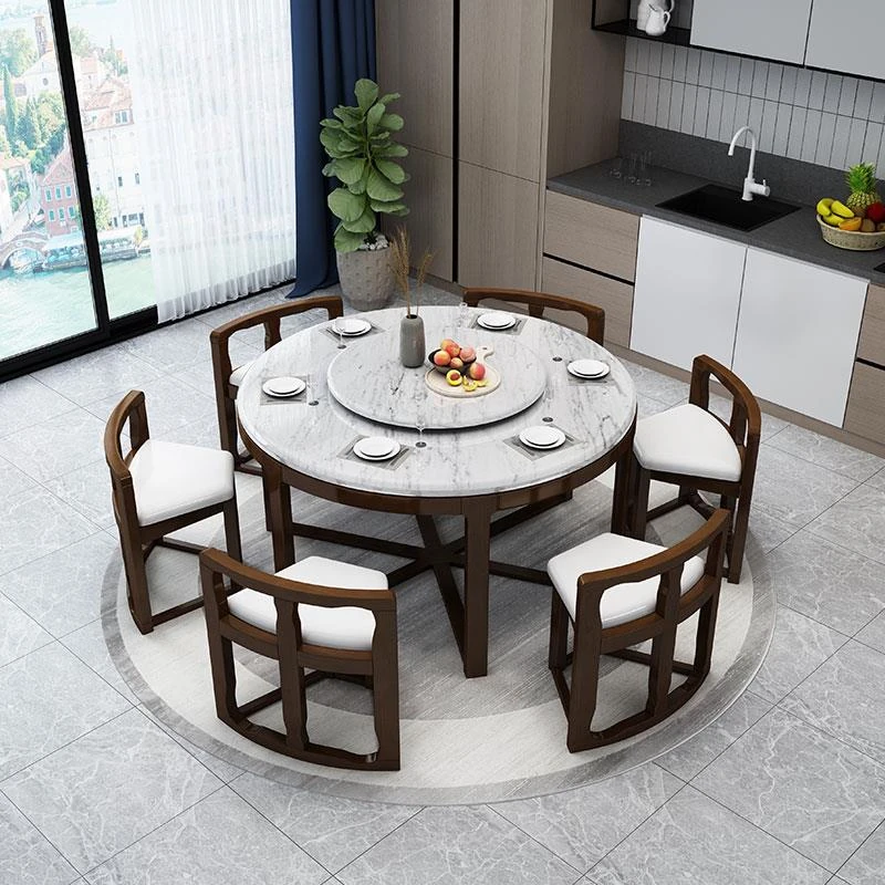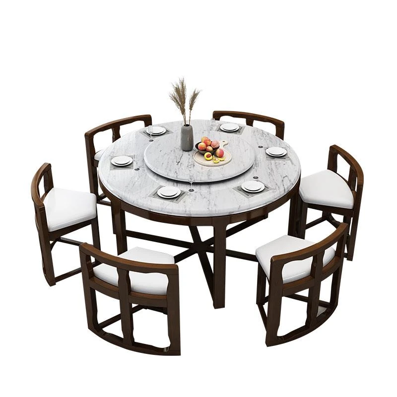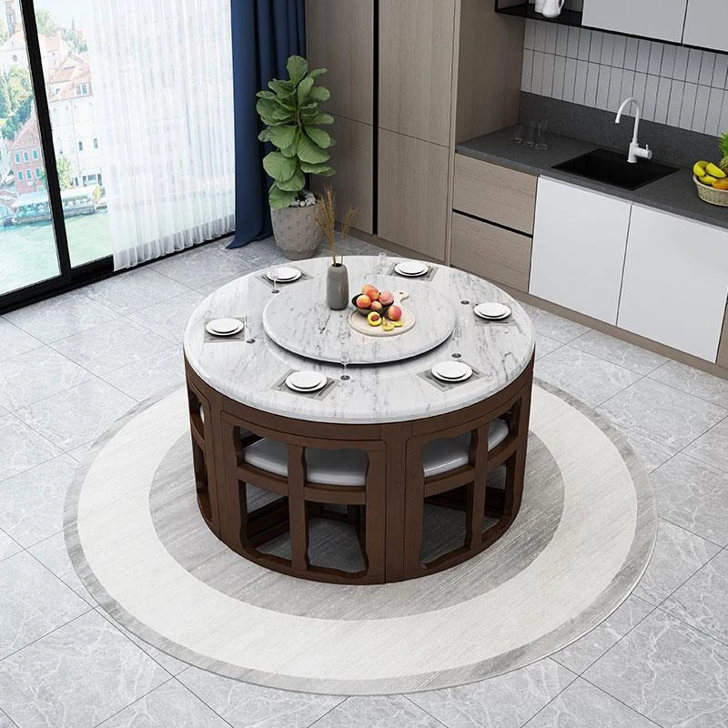 Modern Minimalist Solid Wood Dining Table and Chair Set for Small Spaces - Round Design with Hidden Rotating Plate, Induction Cooker, and Marble Finish