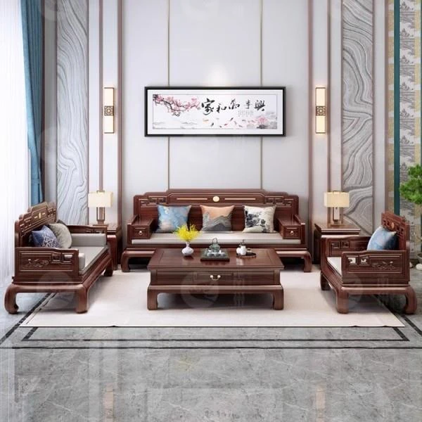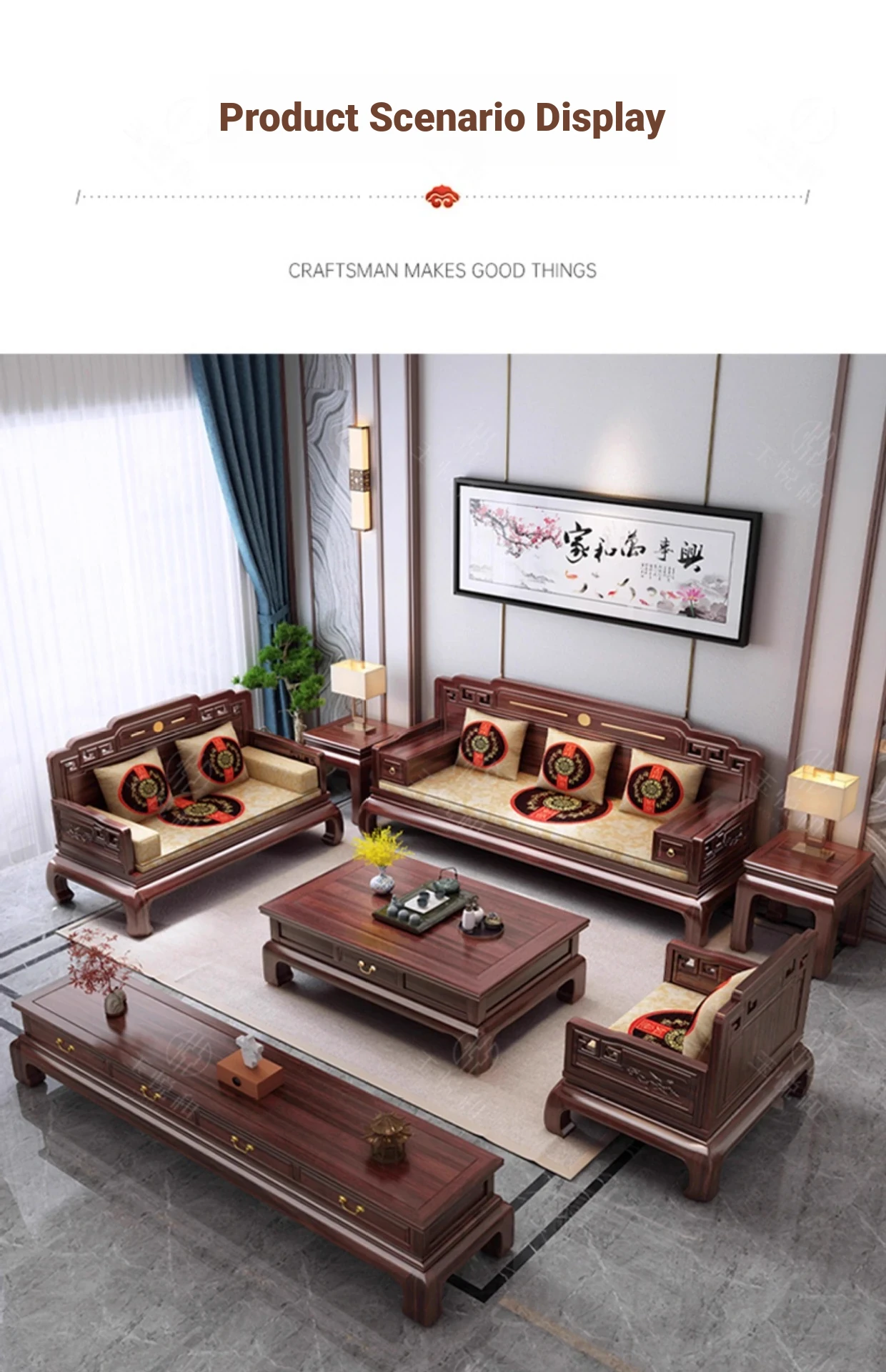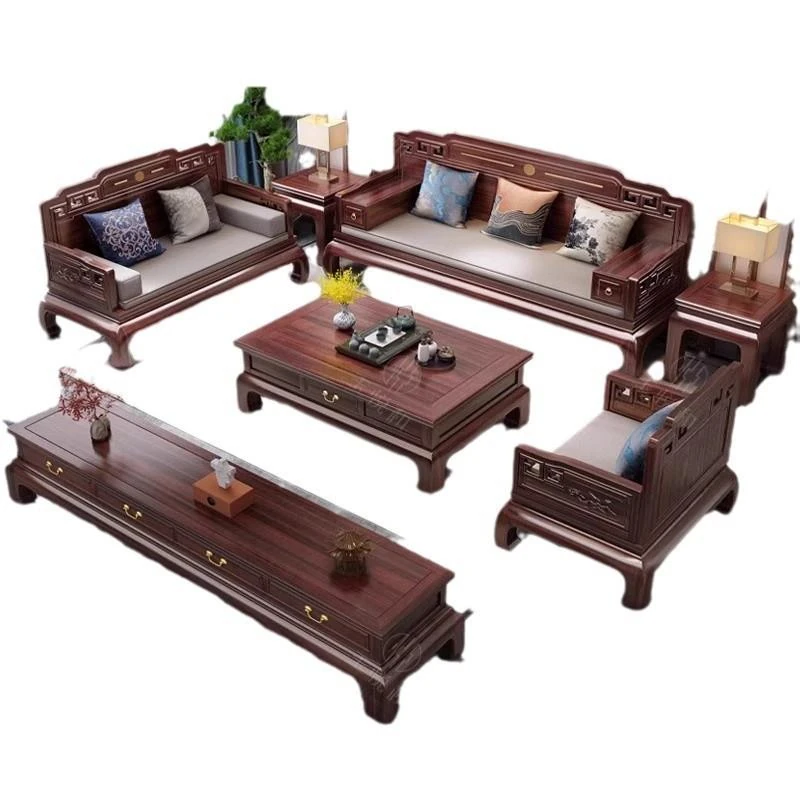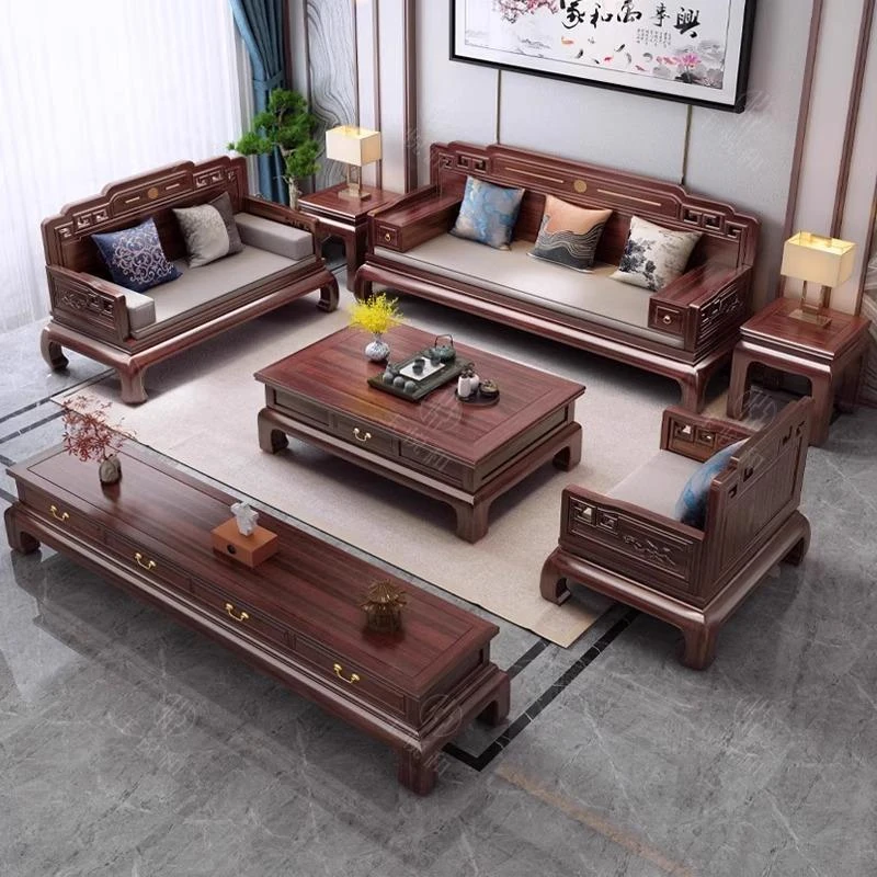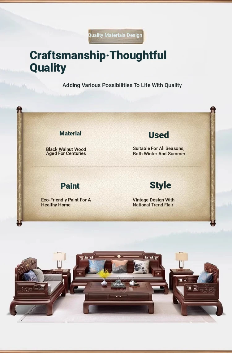 Solid Black Walnut Sofa Set - New Chinese Style Complete Living Room Furniture with Coffee Table and TV Cabinet for Spacious Homes - Factory Direct!