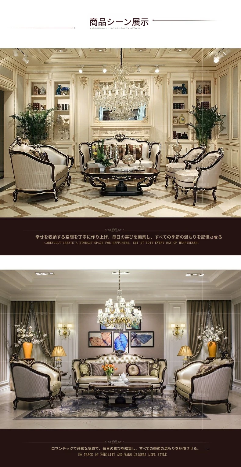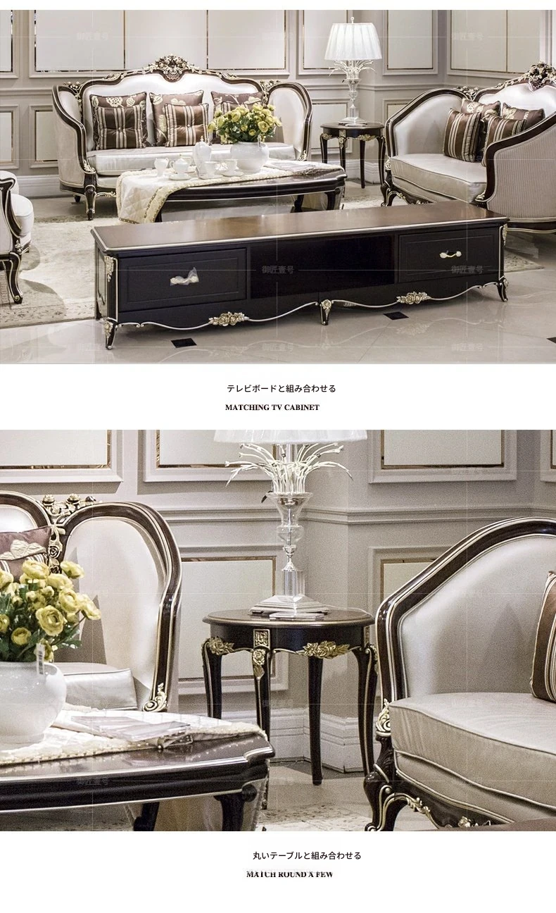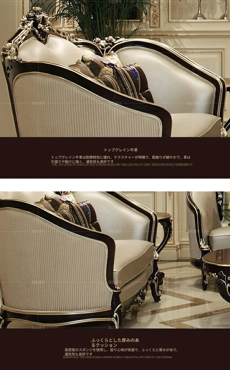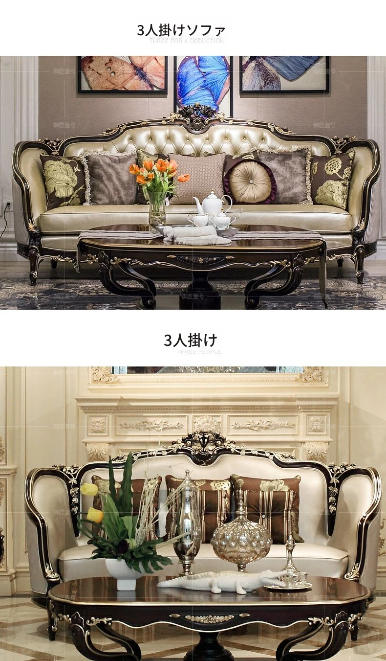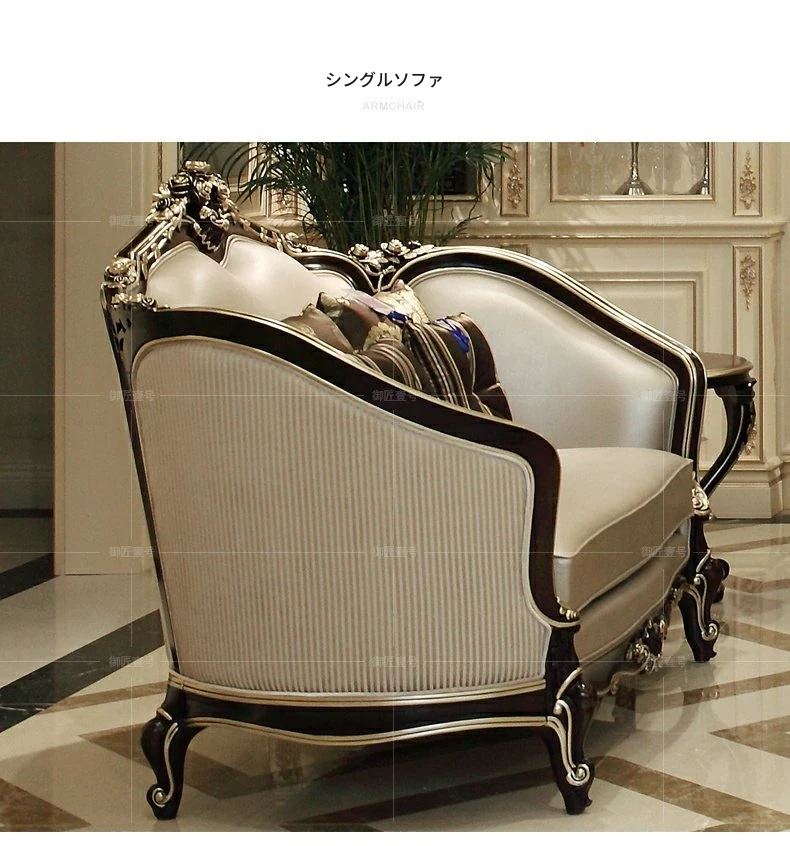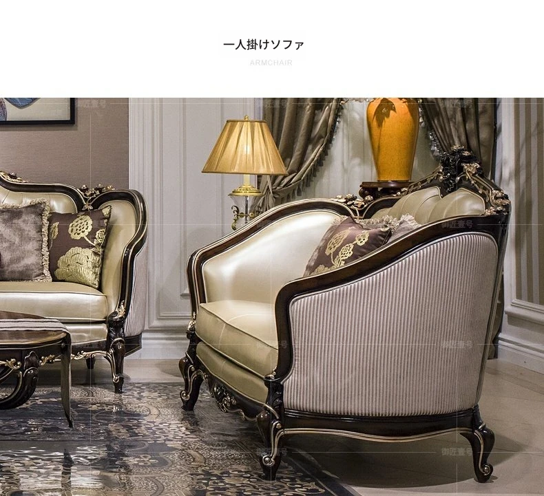 御匠壹号 新古典スタイルのリビング家具 - 高級彫刻入りシャンパンシルバーの無垢材ソファ & 本革ソファセットで贅沢な空間を演出!