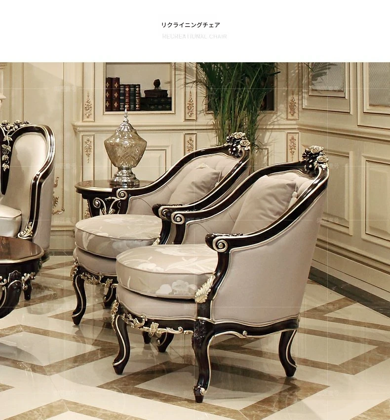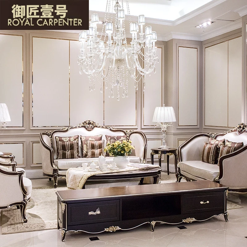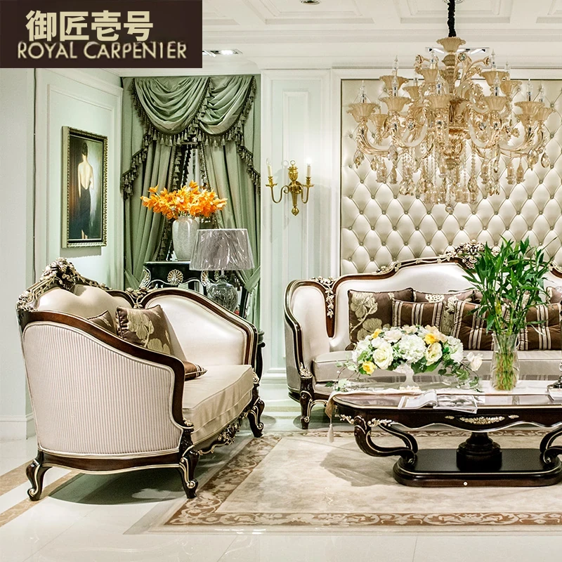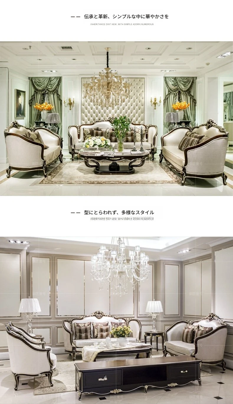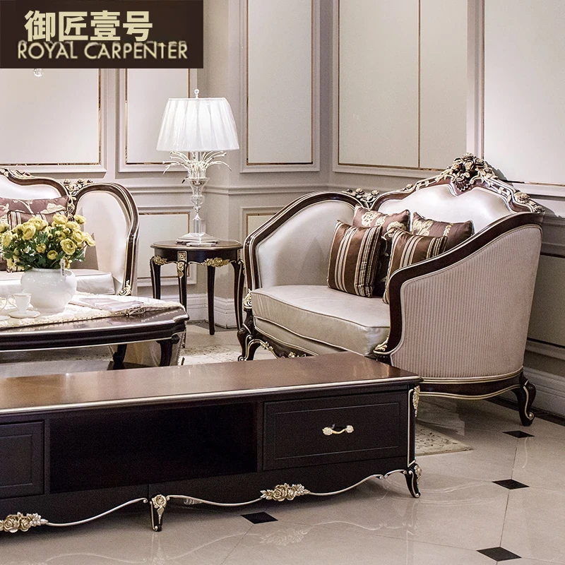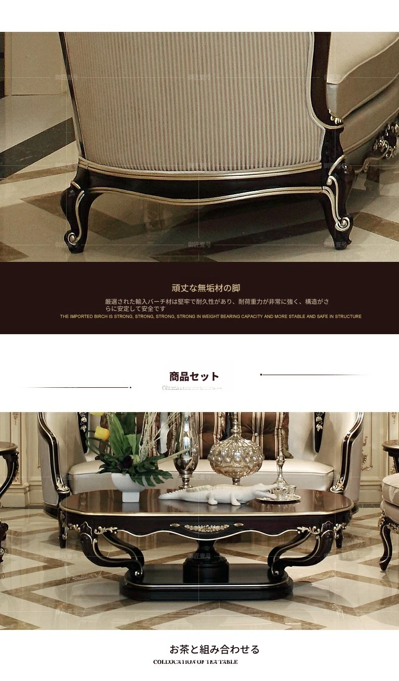 御匠壹号 新古典スタイルのリビング家具 - 高級彫刻入りシャンパンシルバーの無垢材ソファ & 本革ソファセットで贅沢な空間を演出!