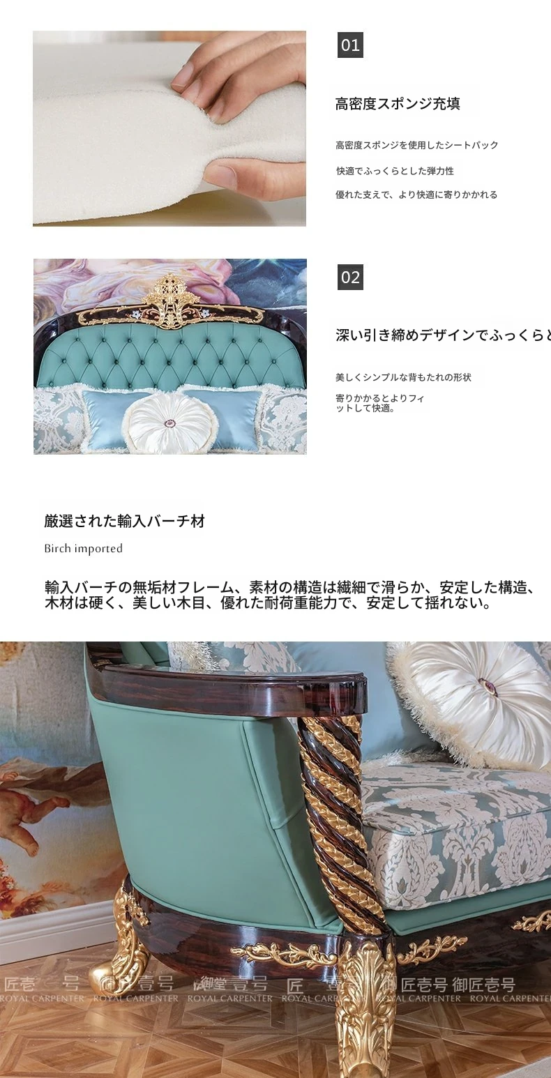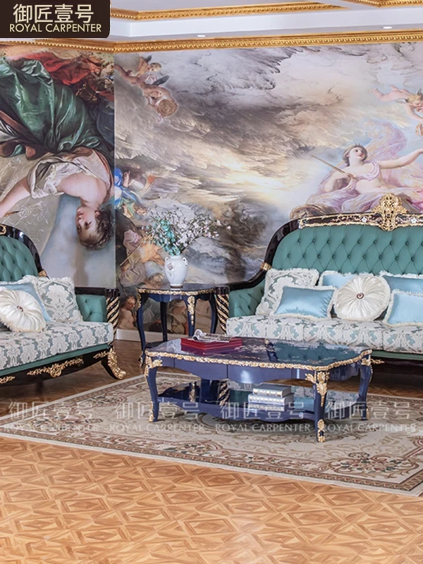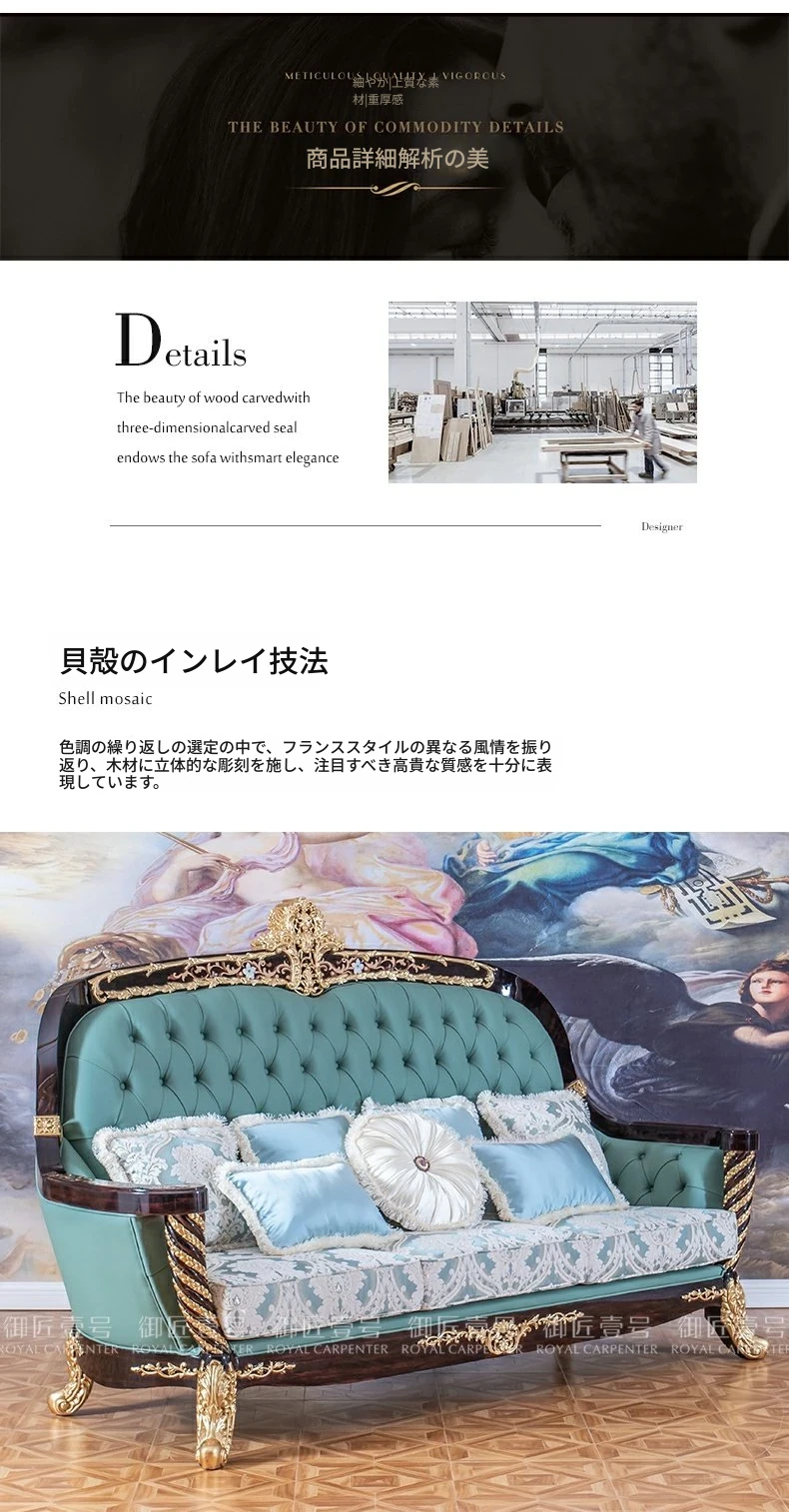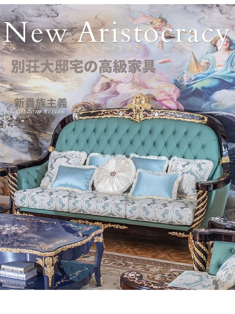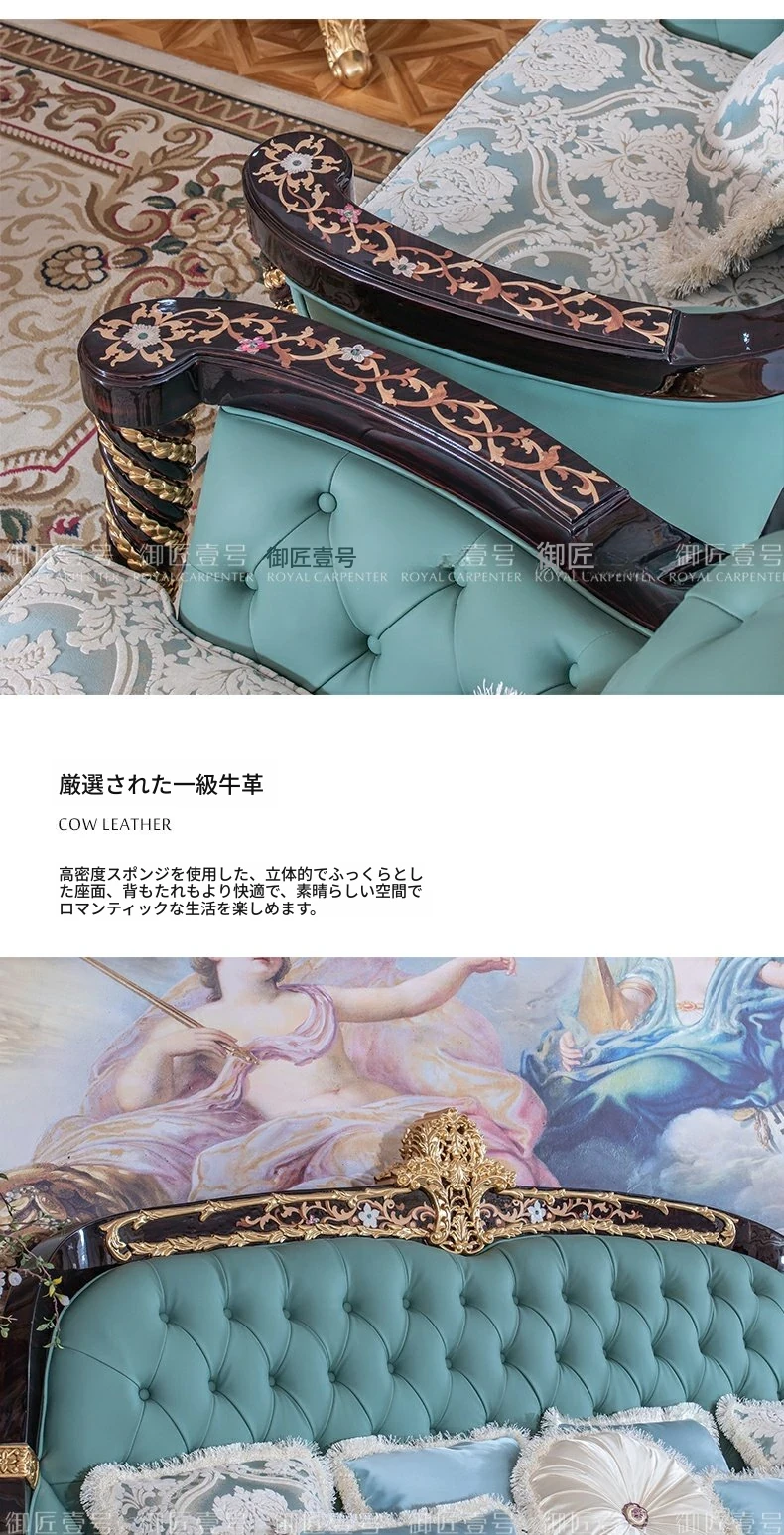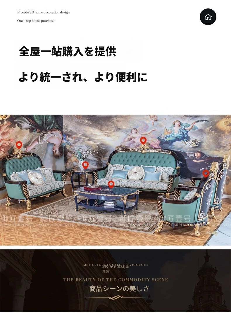 フランス風の高級布製ソファー、実木彫刻と本革のコンビネーション、大型リビングに最適な家具セット。優雅なデザインで、居心地の良い空間を演出します!