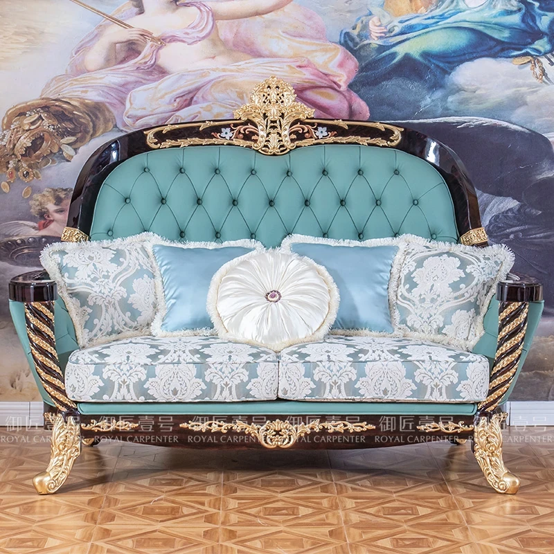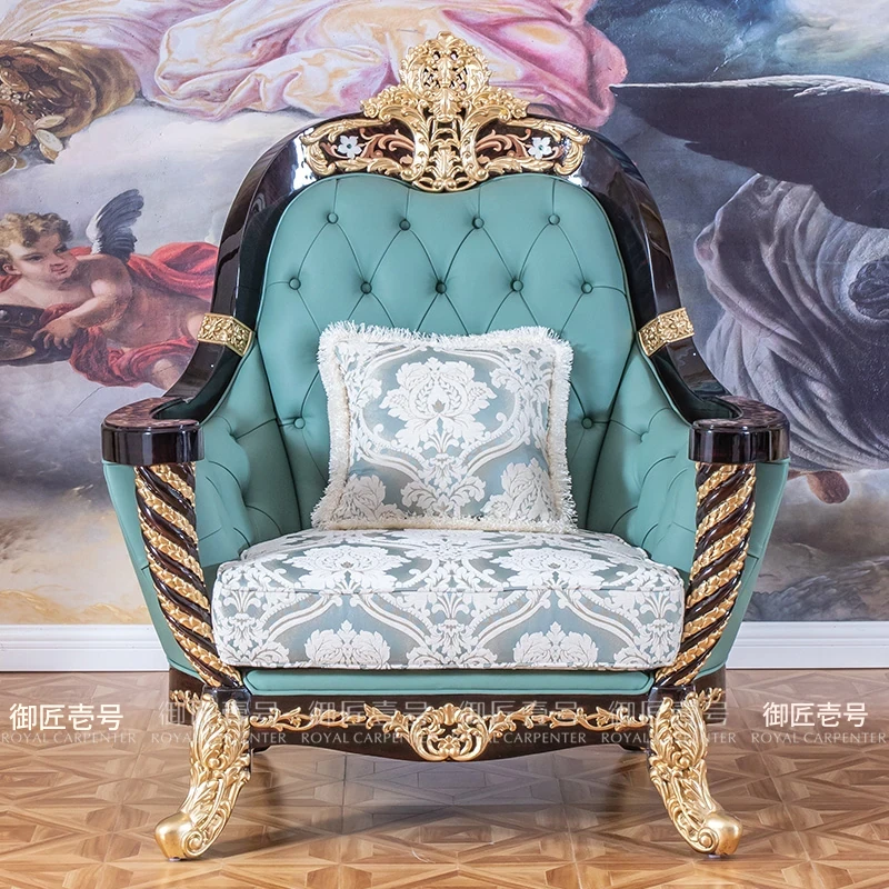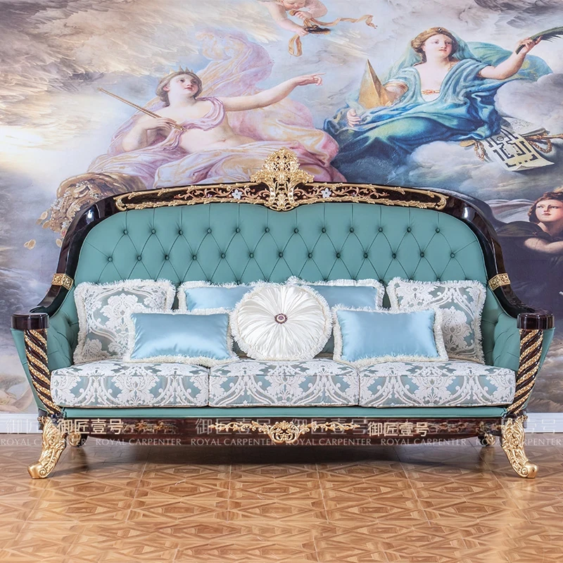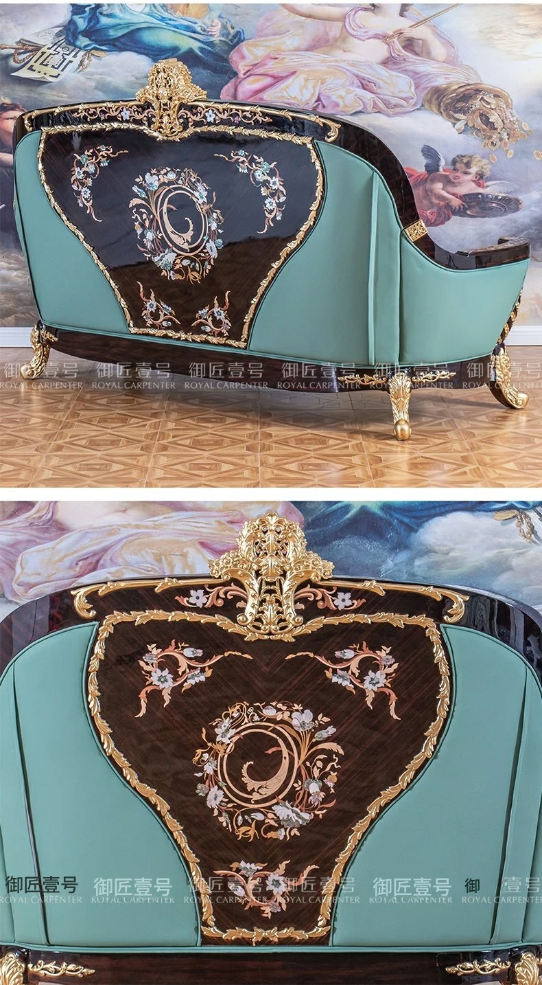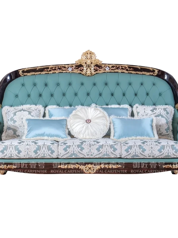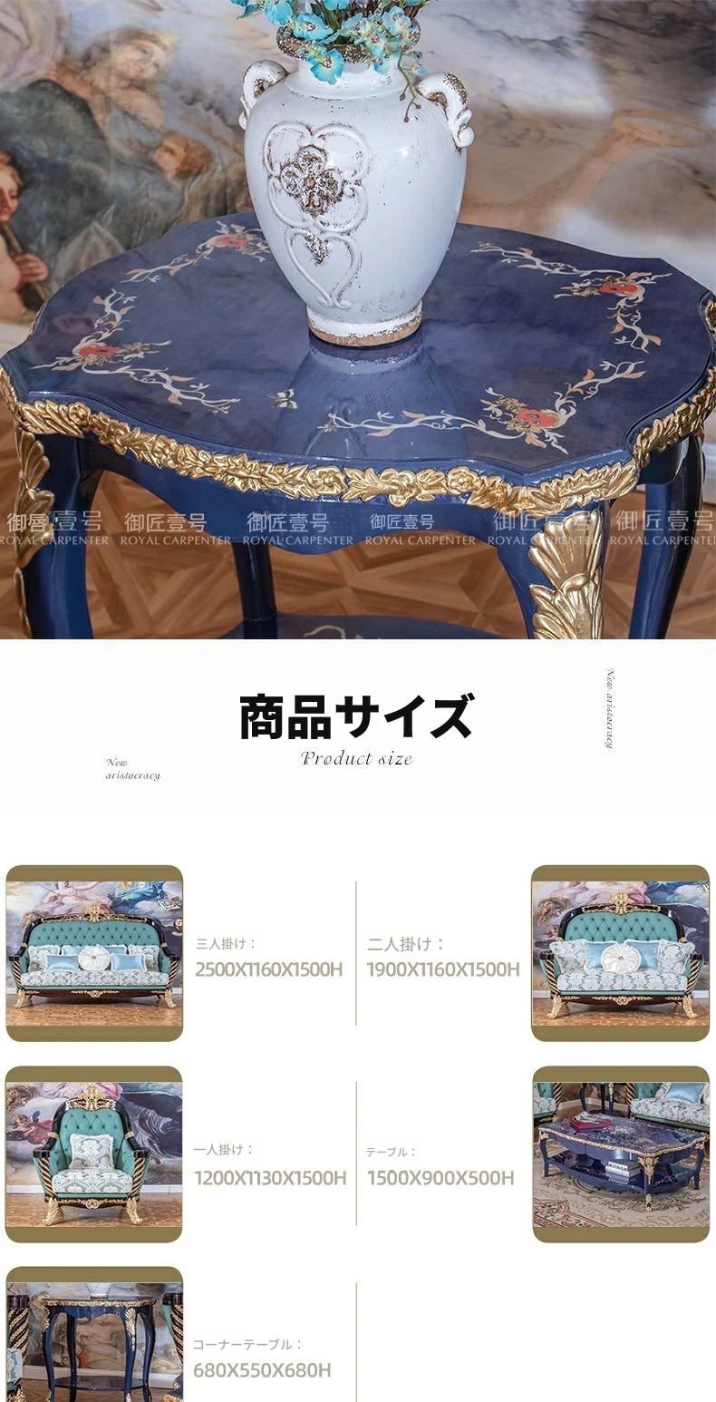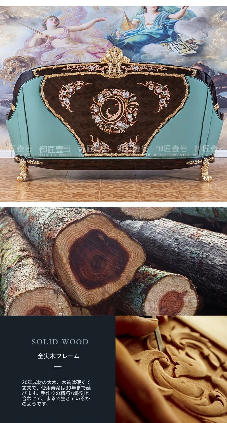 フランス風の高級布製ソファー、実木彫刻と本革のコンビネーション、大型リビングに最適な家具セット。優雅なデザインで、居心地の良い空間を演出します!