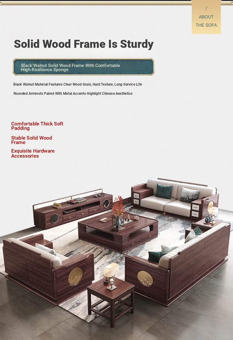 Elegant Modern Chinese Solid Wood Black Gold Sofa Set – Minimalist Living Room Furniture with Storage for Villas and Homes – Luxurious and Functional Design