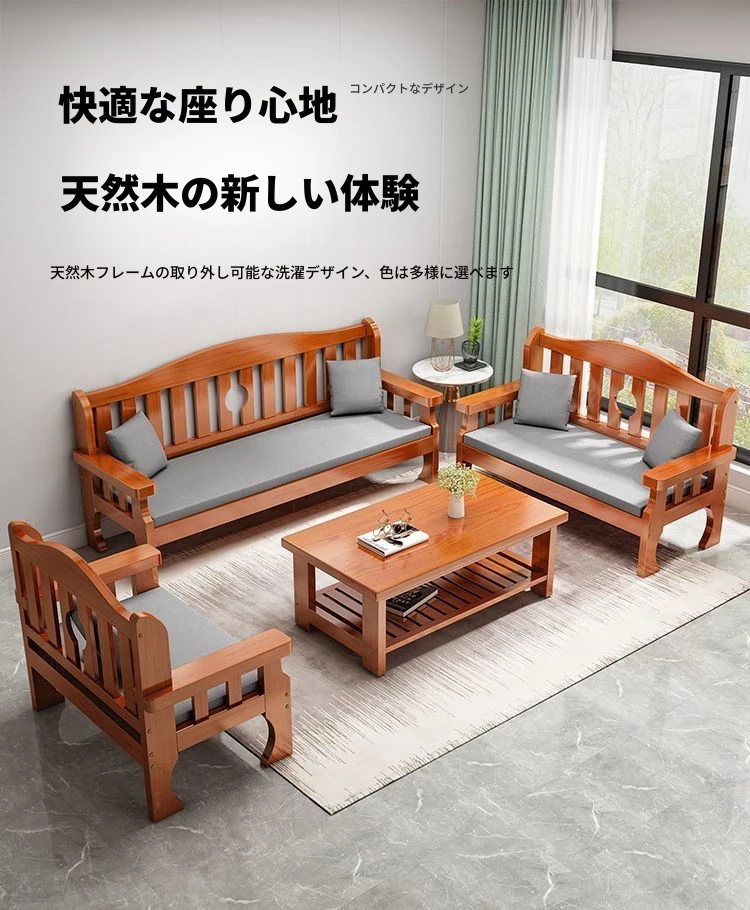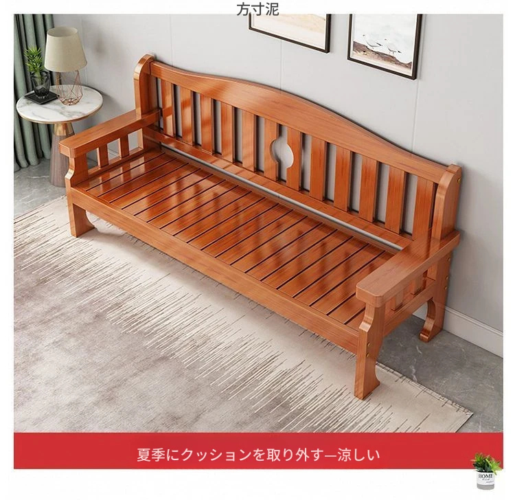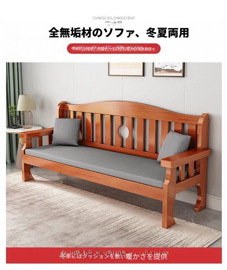 木の温もりを感じる新中式デザインのソファー - 3人掛け、コンパクトサイズで小さなお部屋にもぴったり!伝統的なスタイルと現代の快適さを兼ね備えた、実木製の長椅子。田舎の家にも似合う、心安らぐ空間を演出します。