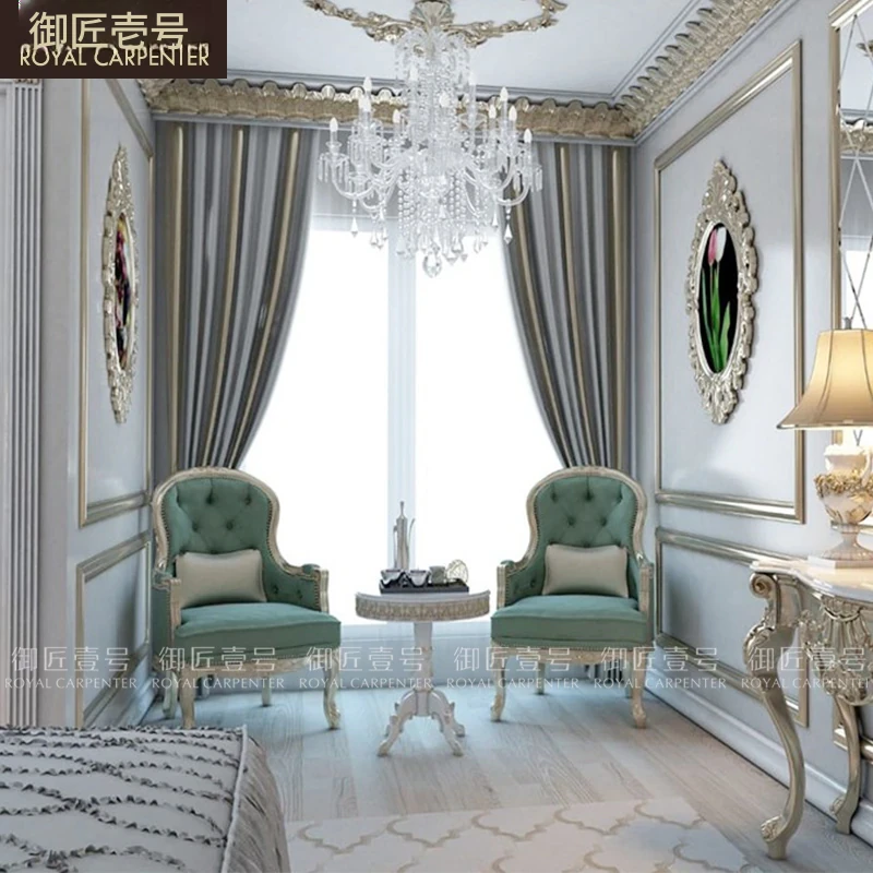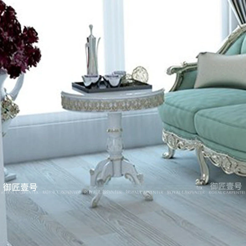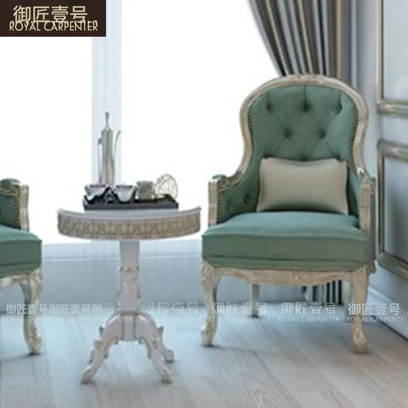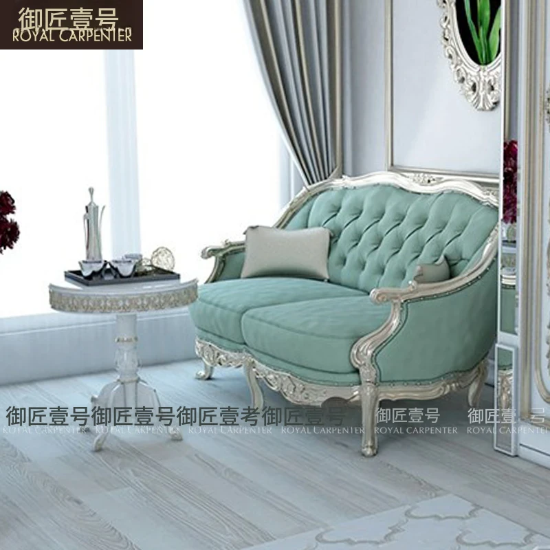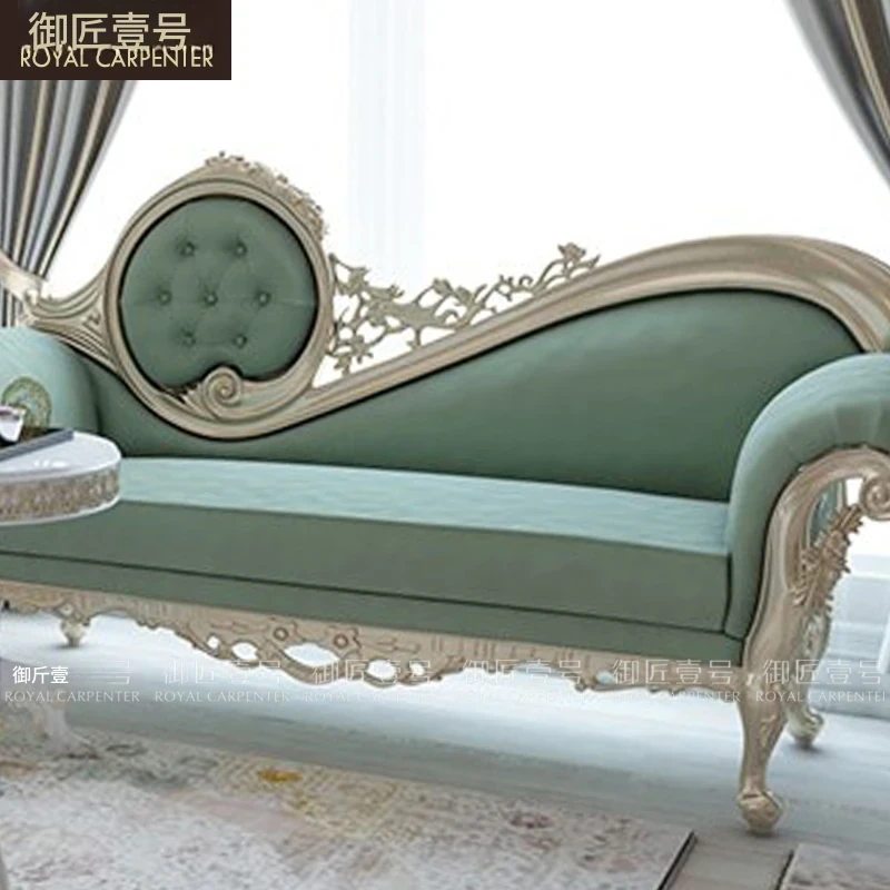 エレガントな欧風デザインの木製彫刻付きファブリックカウチ、フレンチ宮廷スタイルのリラックスソファ。デュアルシートで、優雅なひとときを提供します。おしゃれなサイドテーブル付きで、くつろぎの空間を演出!