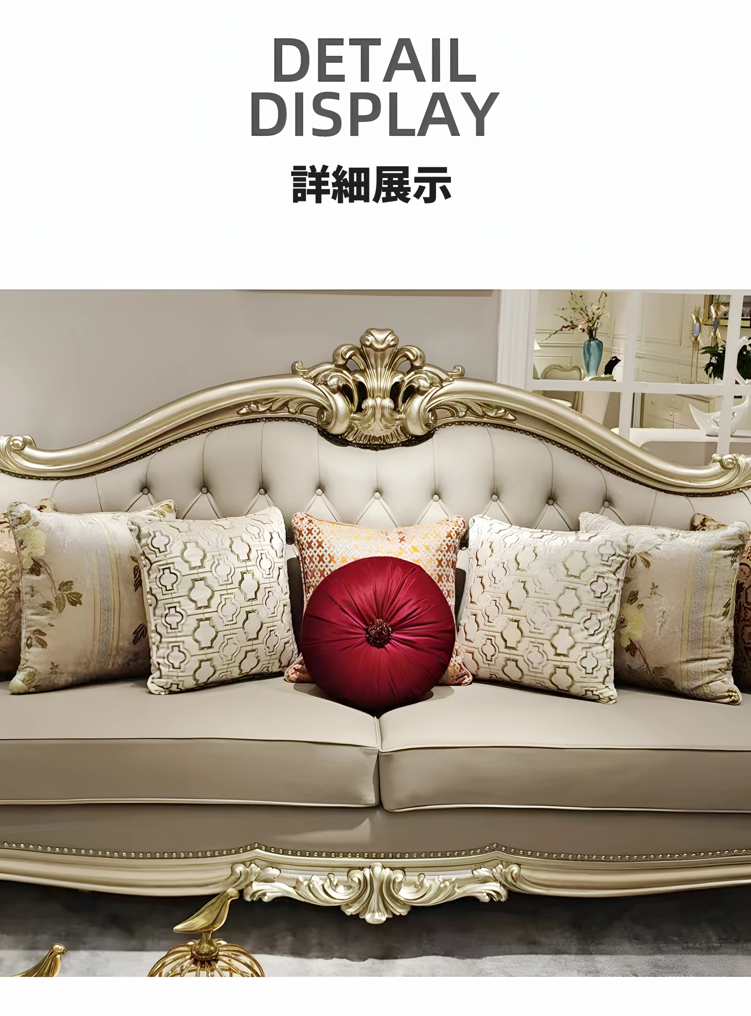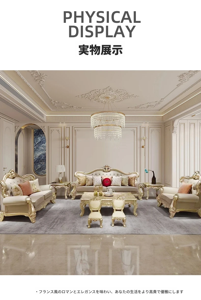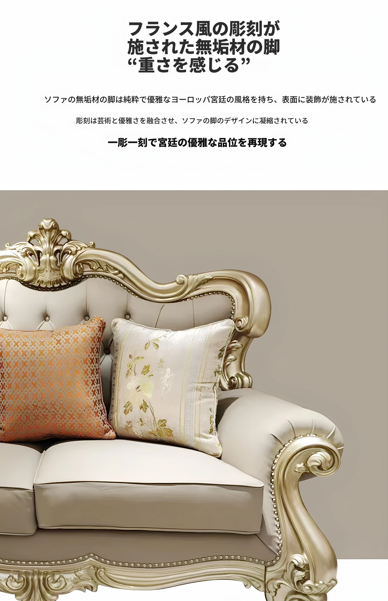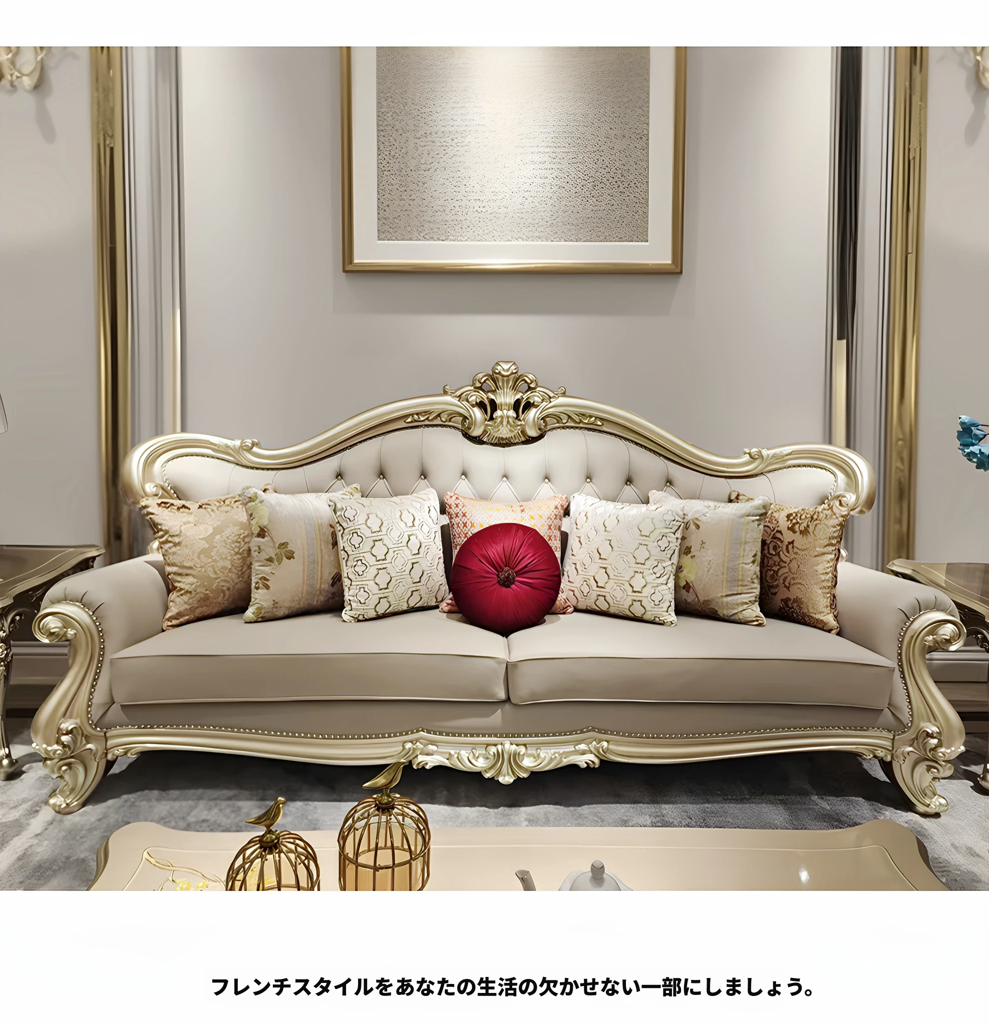 軽やかなフレンチスタイルのソファ!欧州風の本革リビングルーム用コンビネーション、アメリカンスタイルの無垢材彫刻付き最高級牛革ソファ。豪華な別荘にぴったりの逸品です!