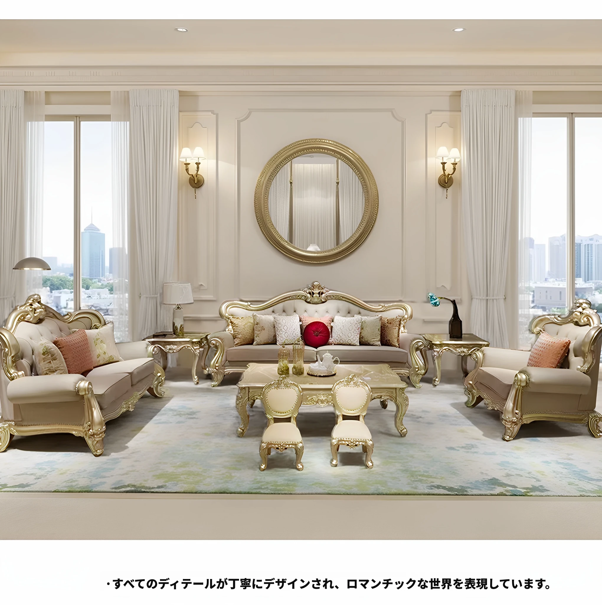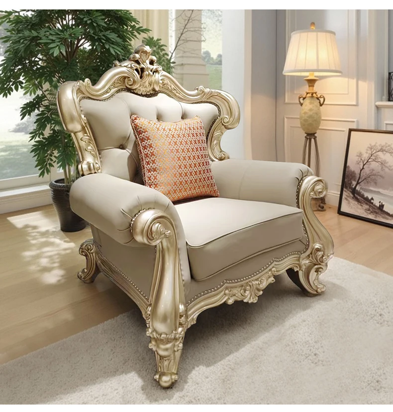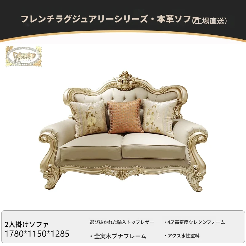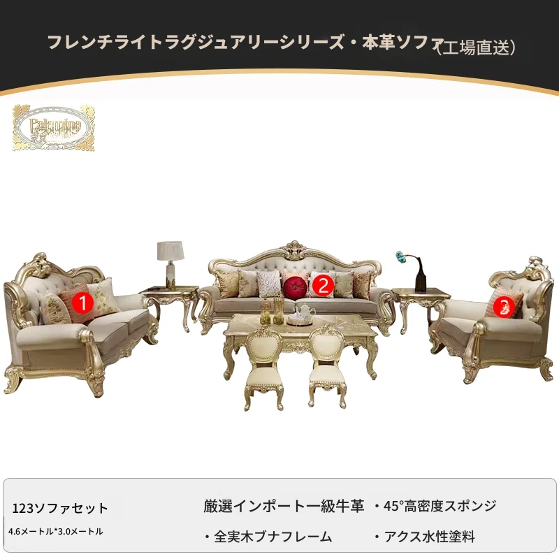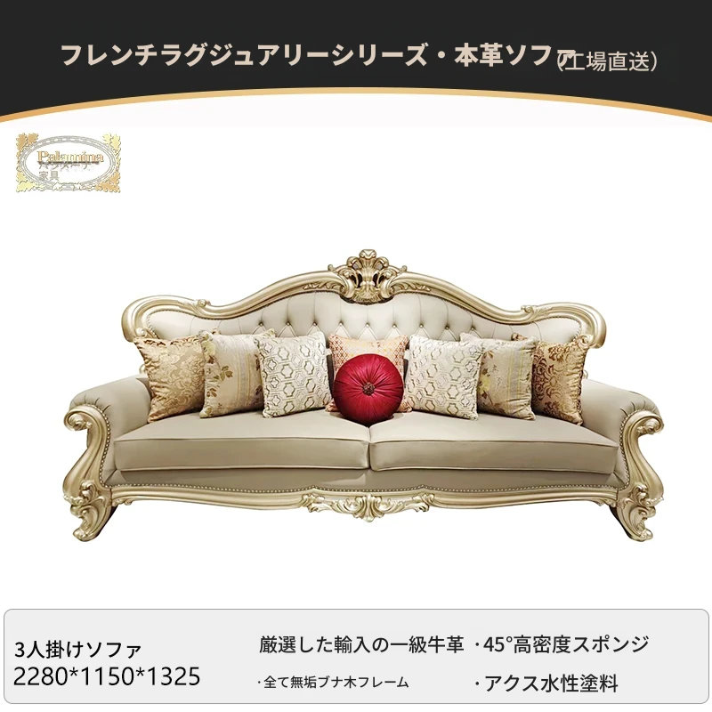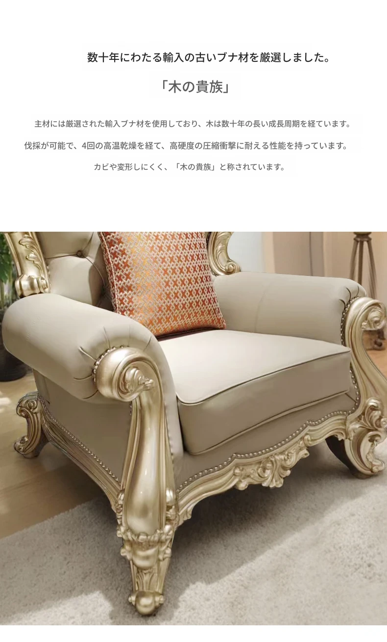 軽やかなフレンチスタイルのソファ!欧州風の本革リビングルーム用コンビネーション、アメリカンスタイルの無垢材彫刻付き最高級牛革ソファ。豪華な別荘にぴったりの逸品です!
