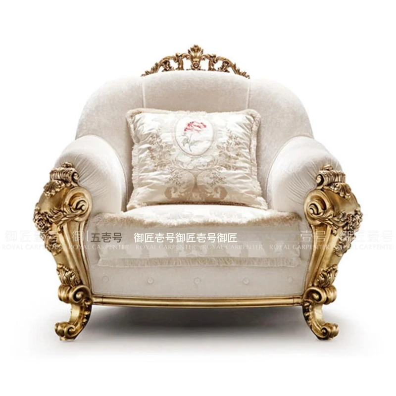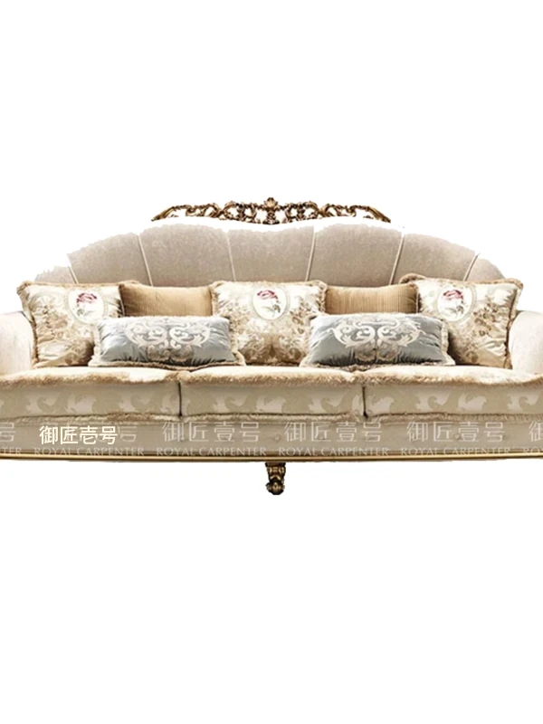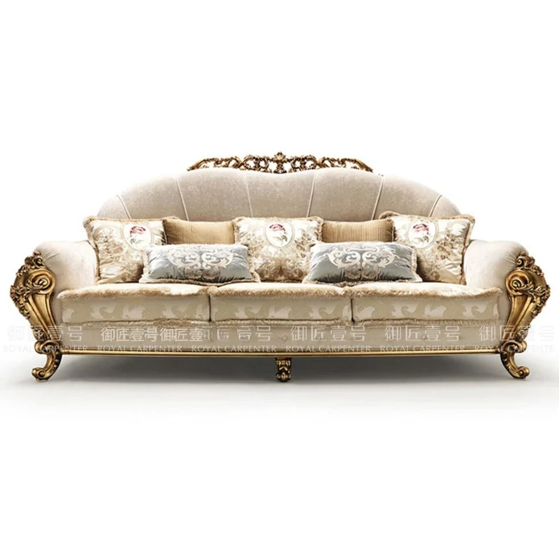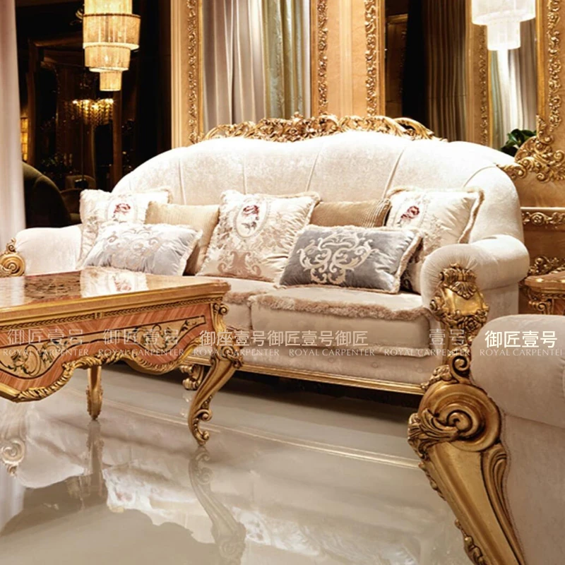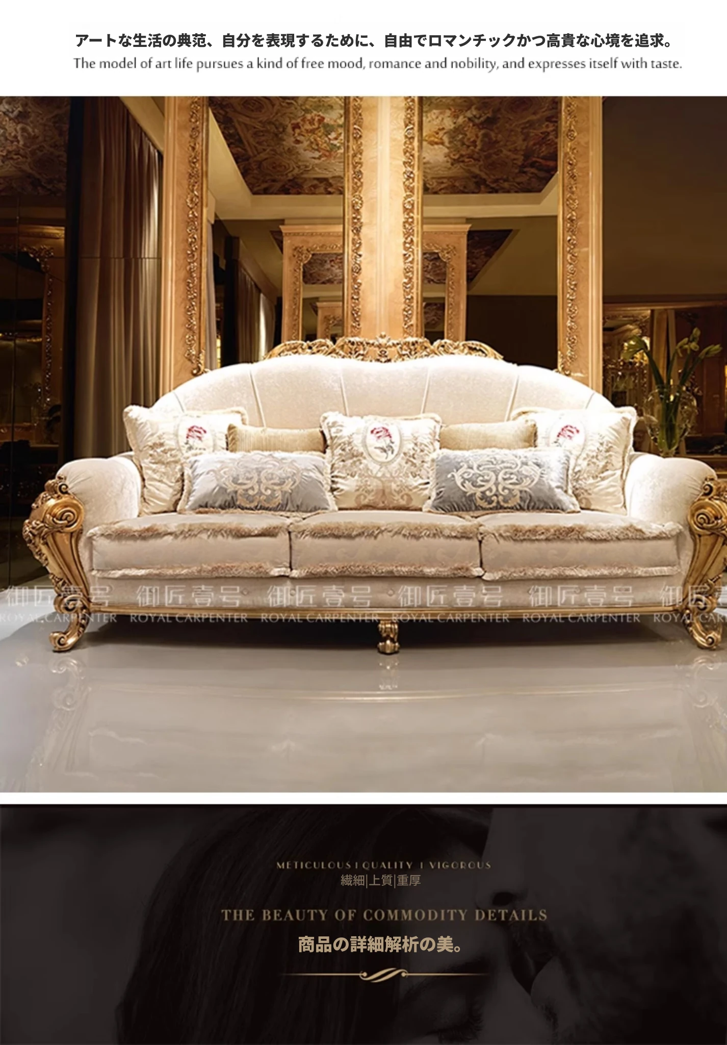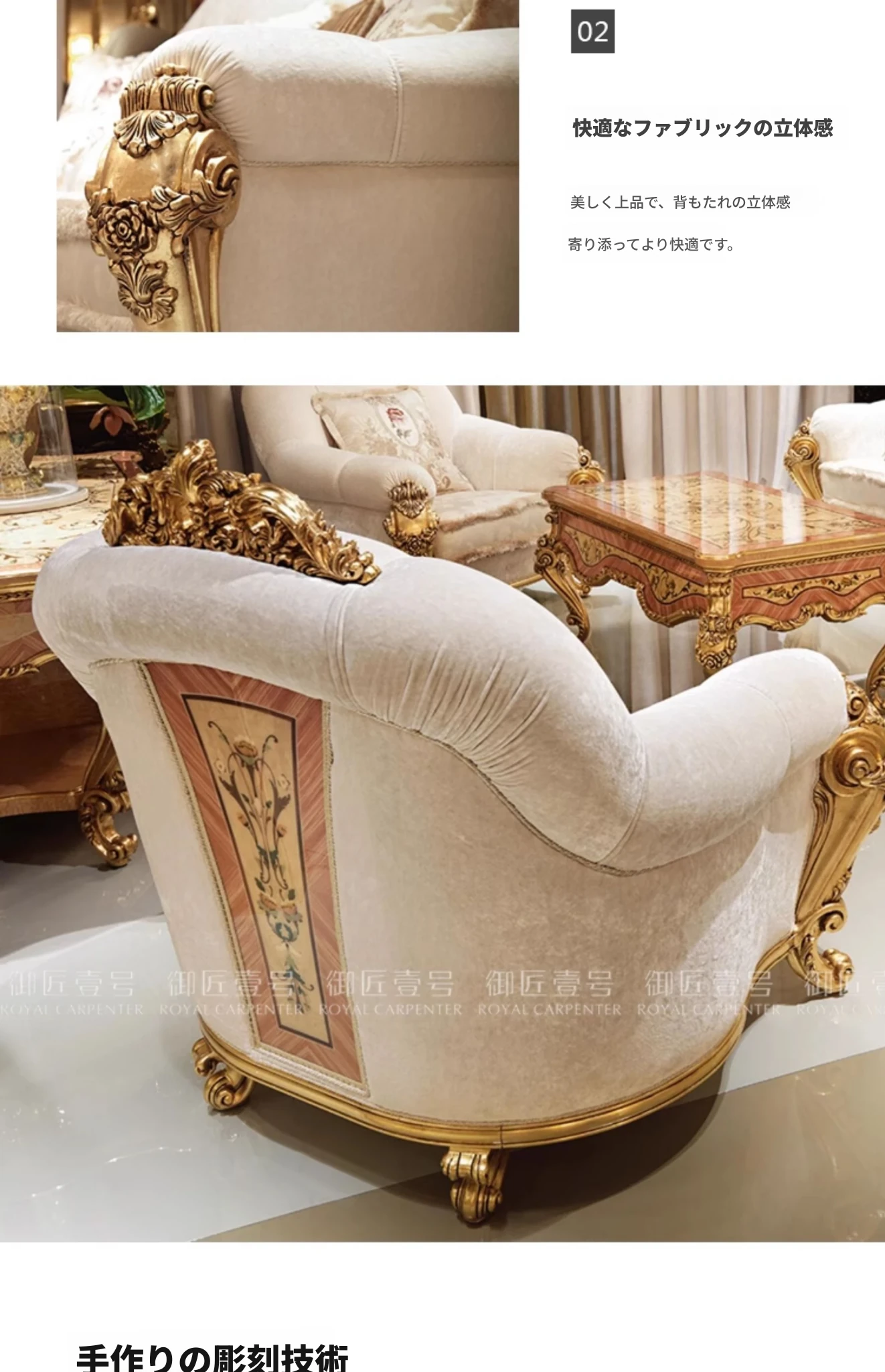 高級感溢れる欧風実木彫刻ソファセット - ゴージャスな金色ファブリック、広々とした大空間にぴったり!フランス式ヴィラのリビングに最適な豪華家具。