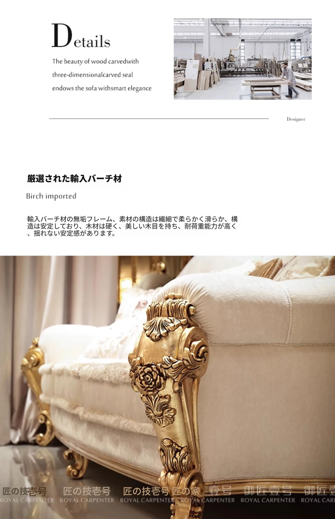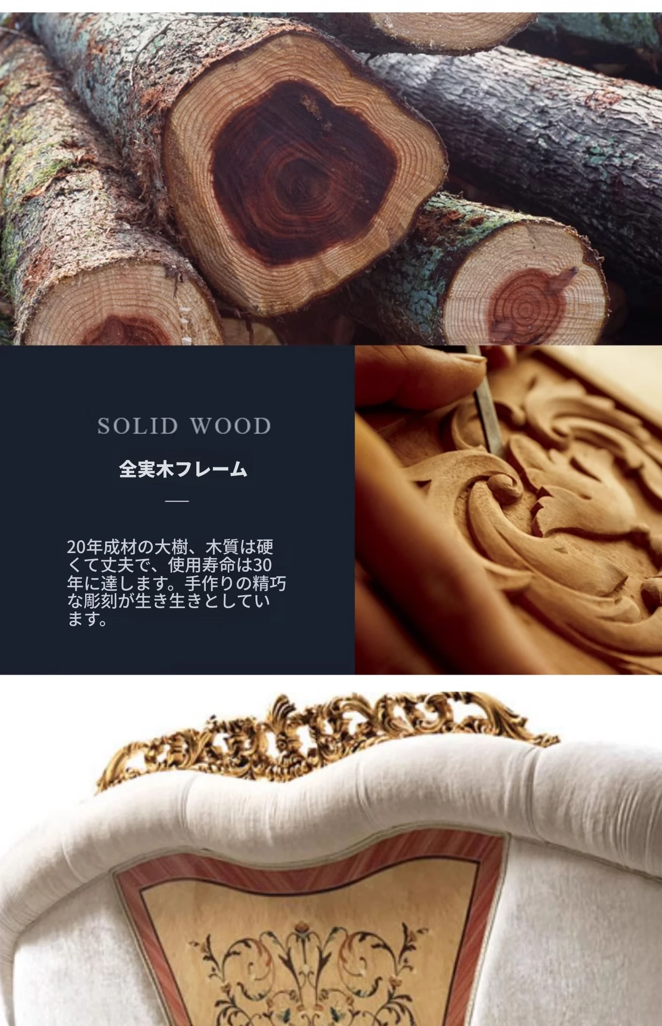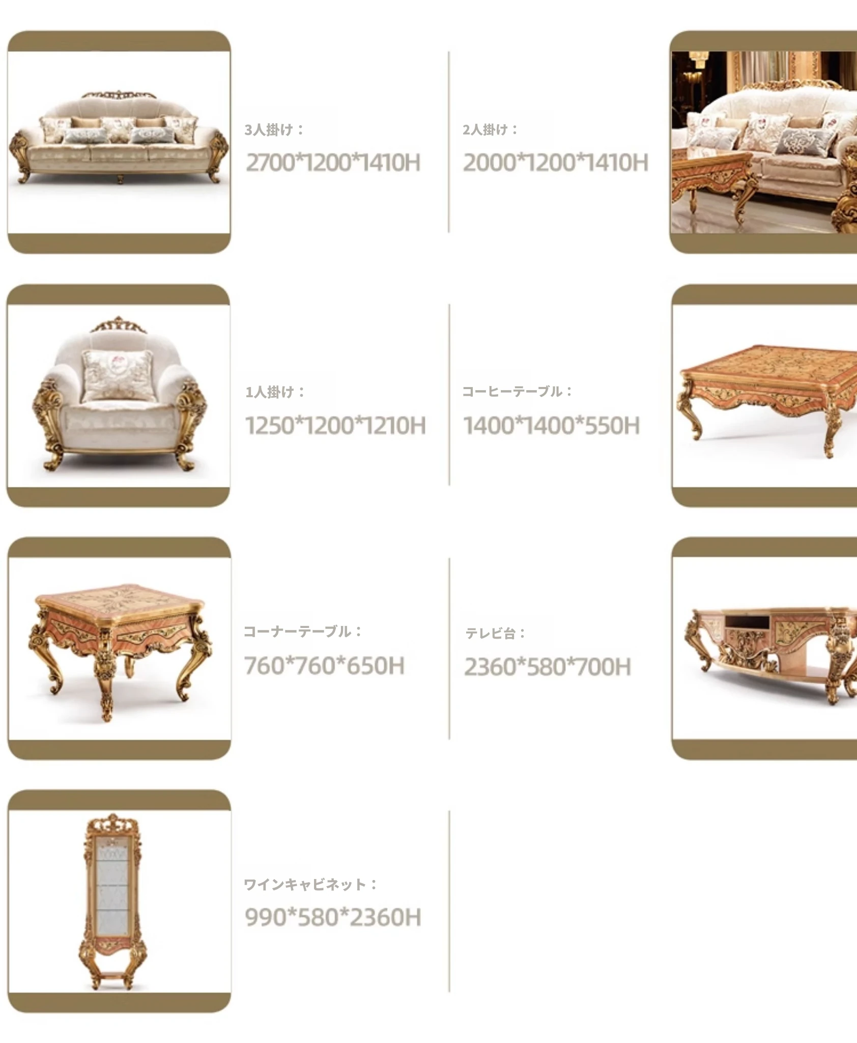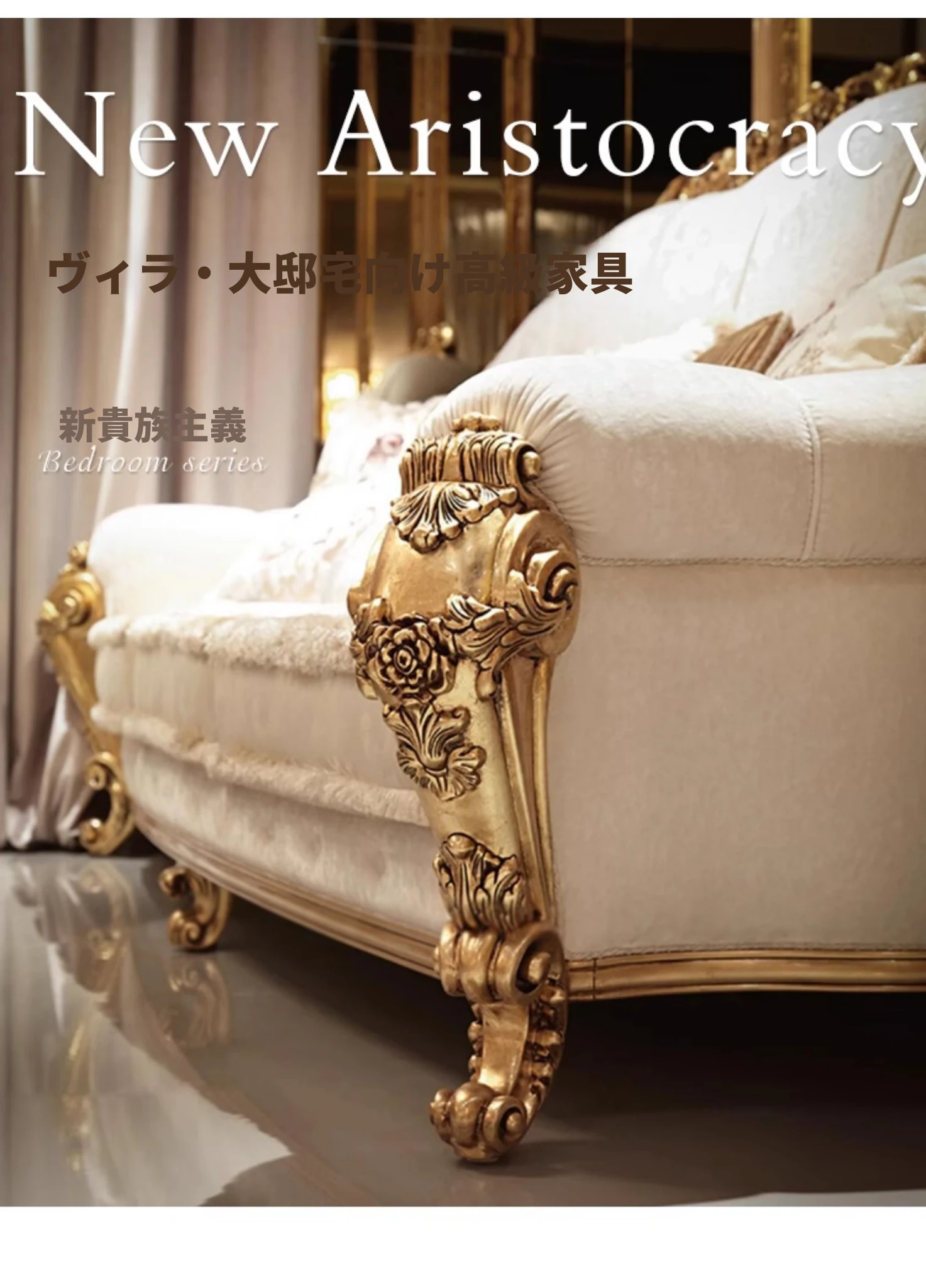 高級感溢れる欧風実木彫刻ソファセット - ゴージャスな金色ファブリック、広々とした大空間にぴったり!フランス式ヴィラのリビングに最適な豪華家具。