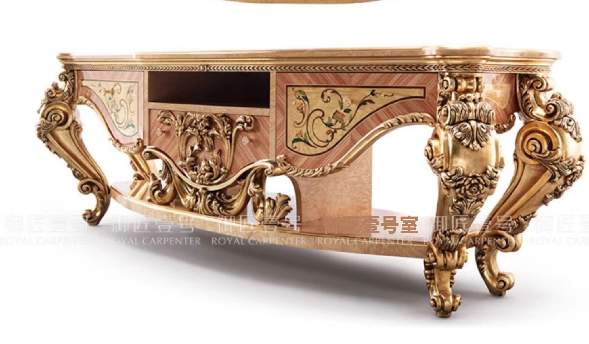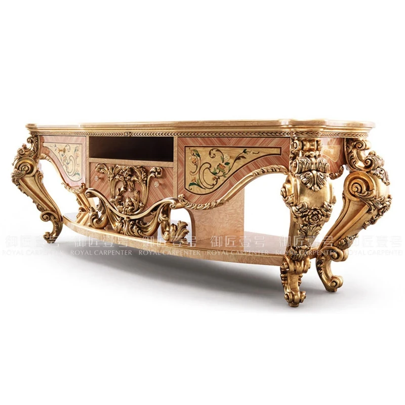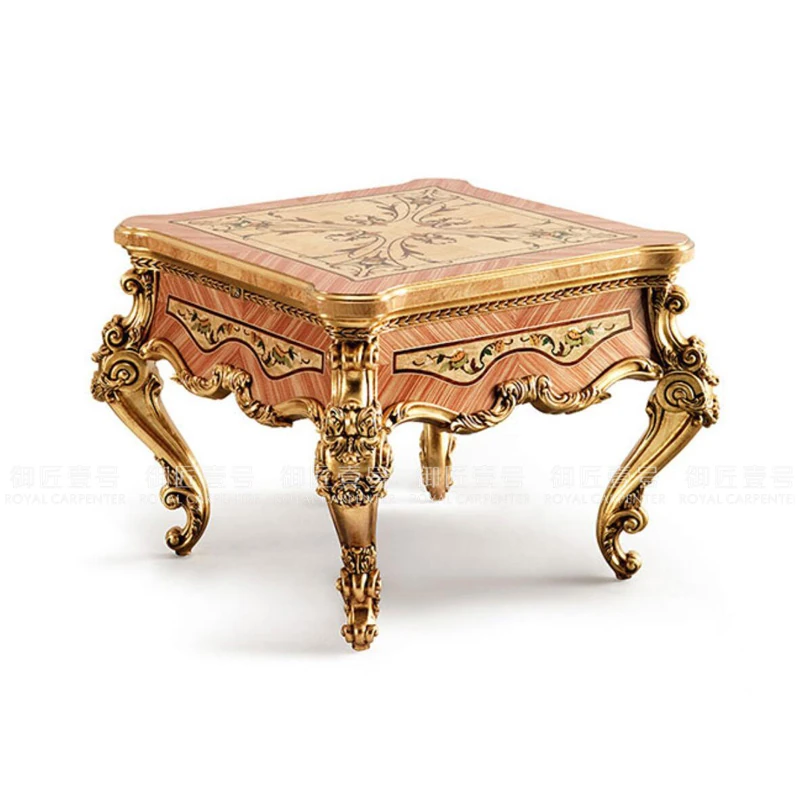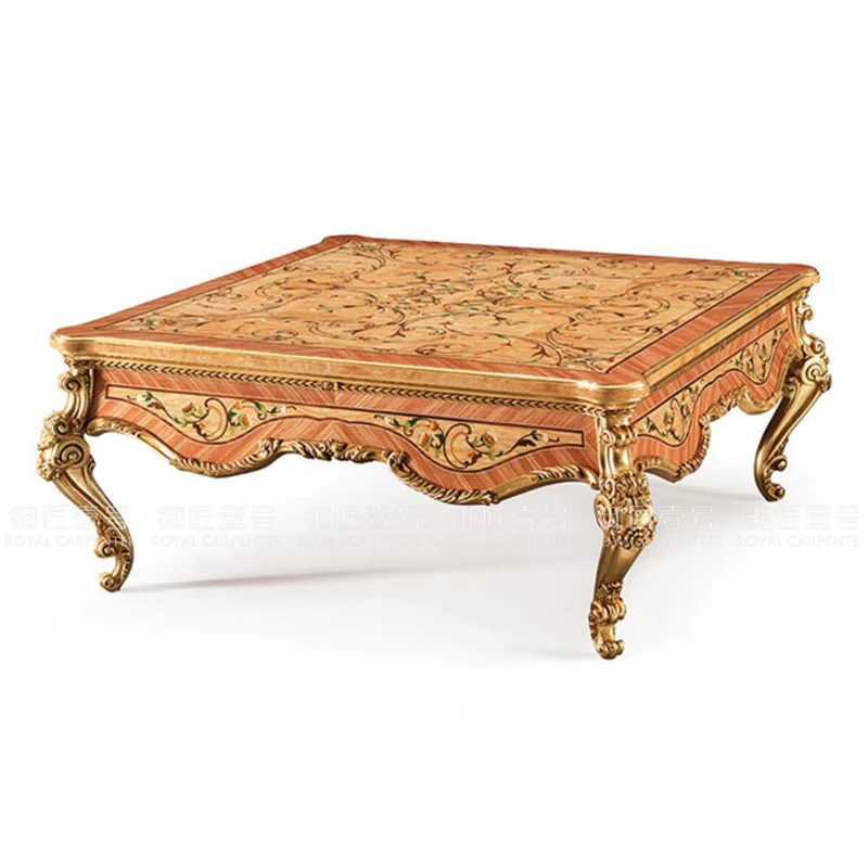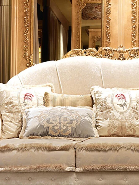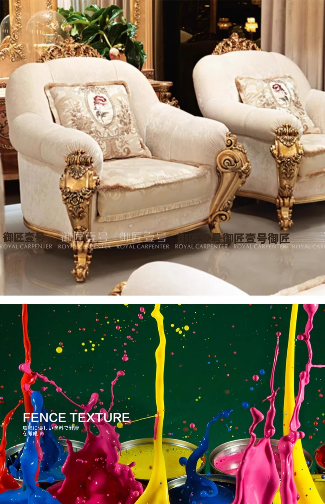 高級感溢れる欧風実木彫刻ソファセット - ゴージャスな金色ファブリック、広々とした大空間にぴったり!フランス式ヴィラのリビングに最適な豪華家具。