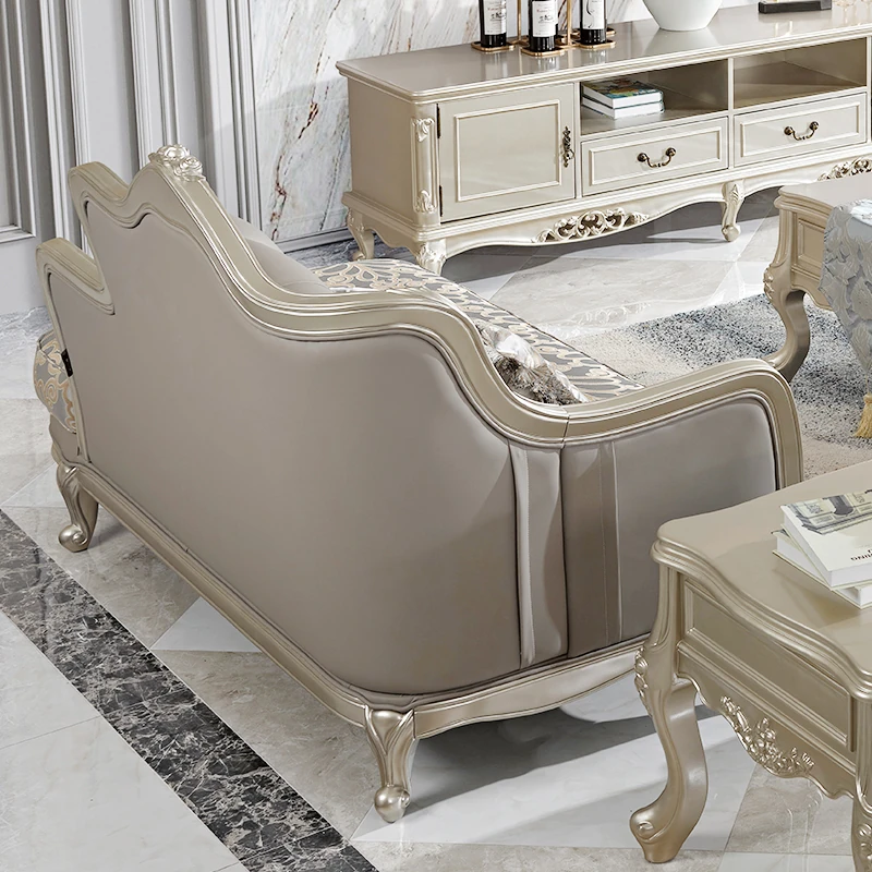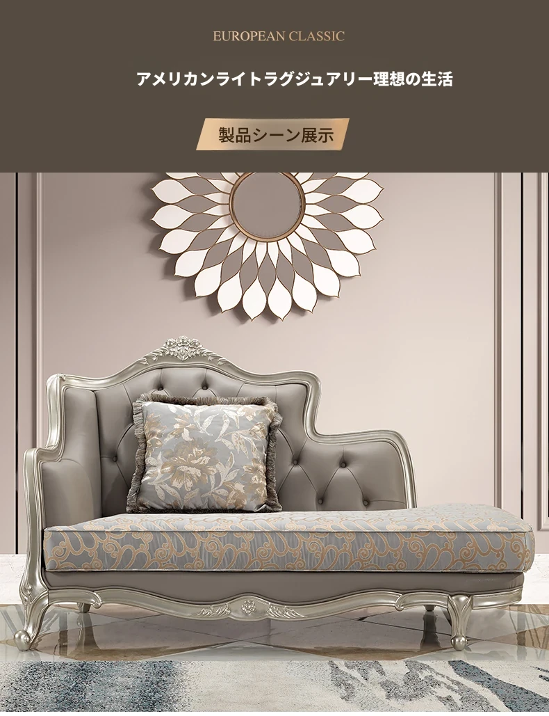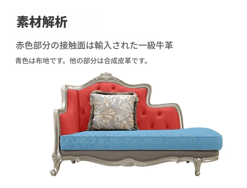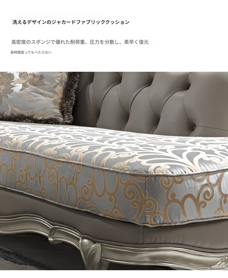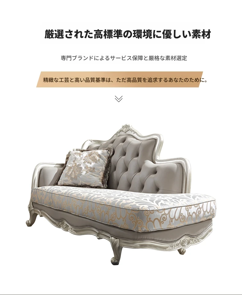 豪華感溢れるフレンチスタイルの貴妃ソファセット!アメリカンレザー使用、全て無垢材の欧風デザイン。最高級の本革と布地を贅沢に組み合わせ、優雅な彫刻が施されたリビングのアクセントにぴったりです。