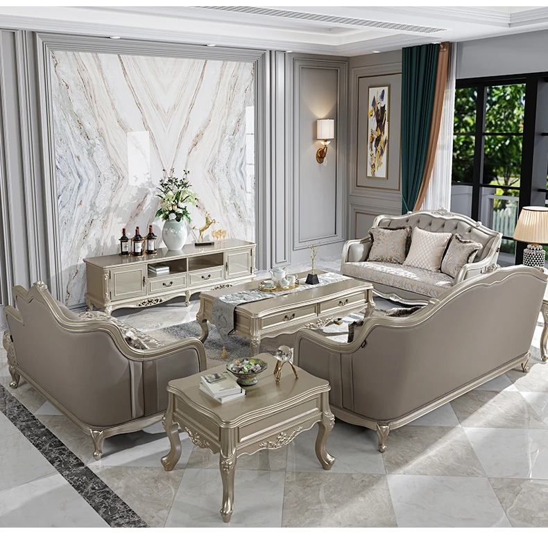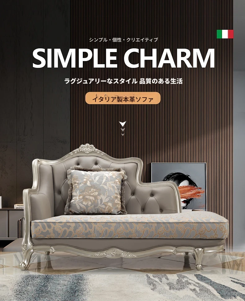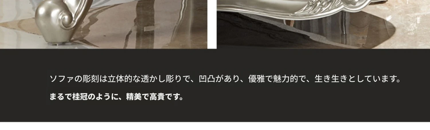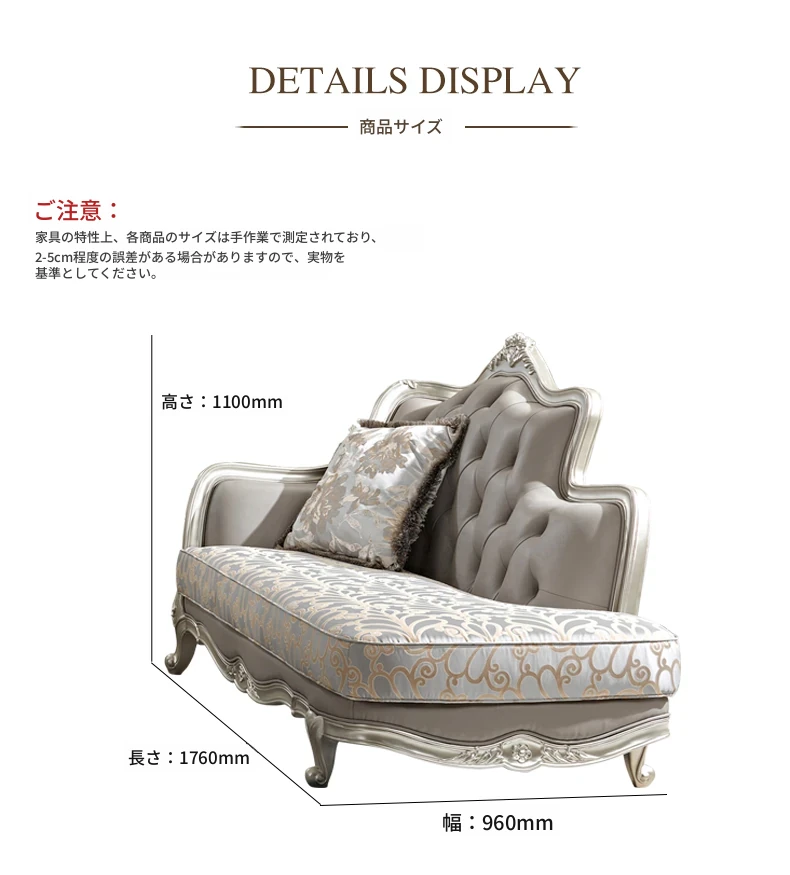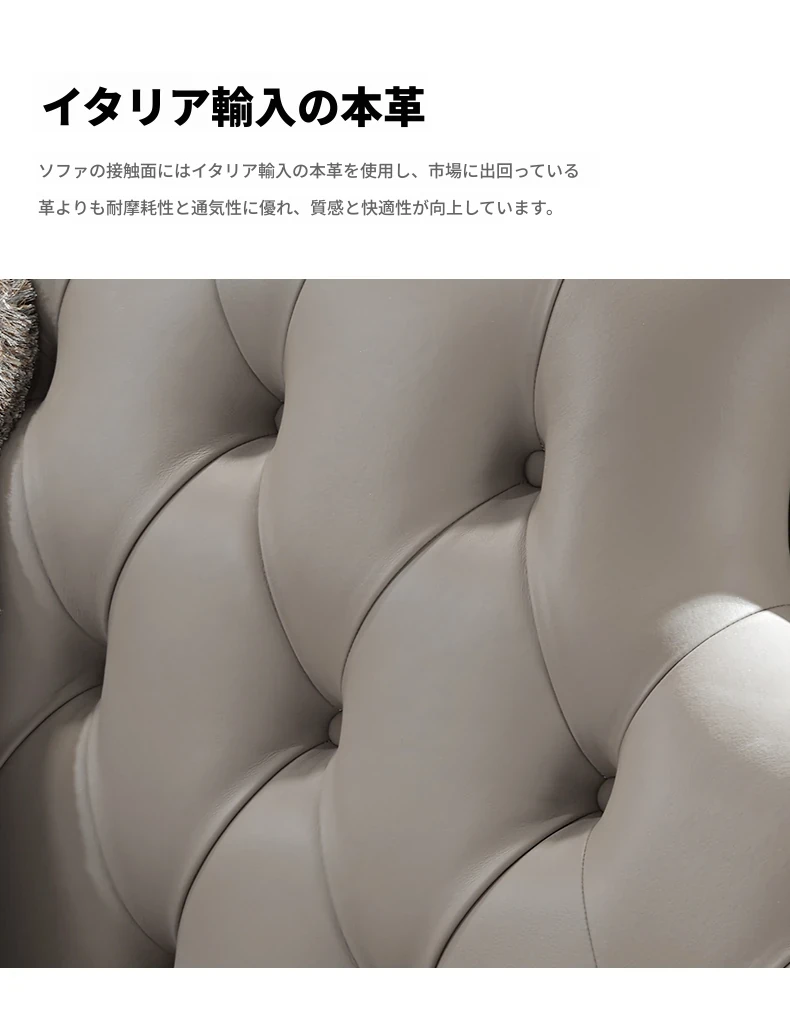 豪華感溢れるフレンチスタイルの貴妃ソファセット!アメリカンレザー使用、全て無垢材の欧風デザイン。最高級の本革と布地を贅沢に組み合わせ、優雅な彫刻が施されたリビングのアクセントにぴったりです。