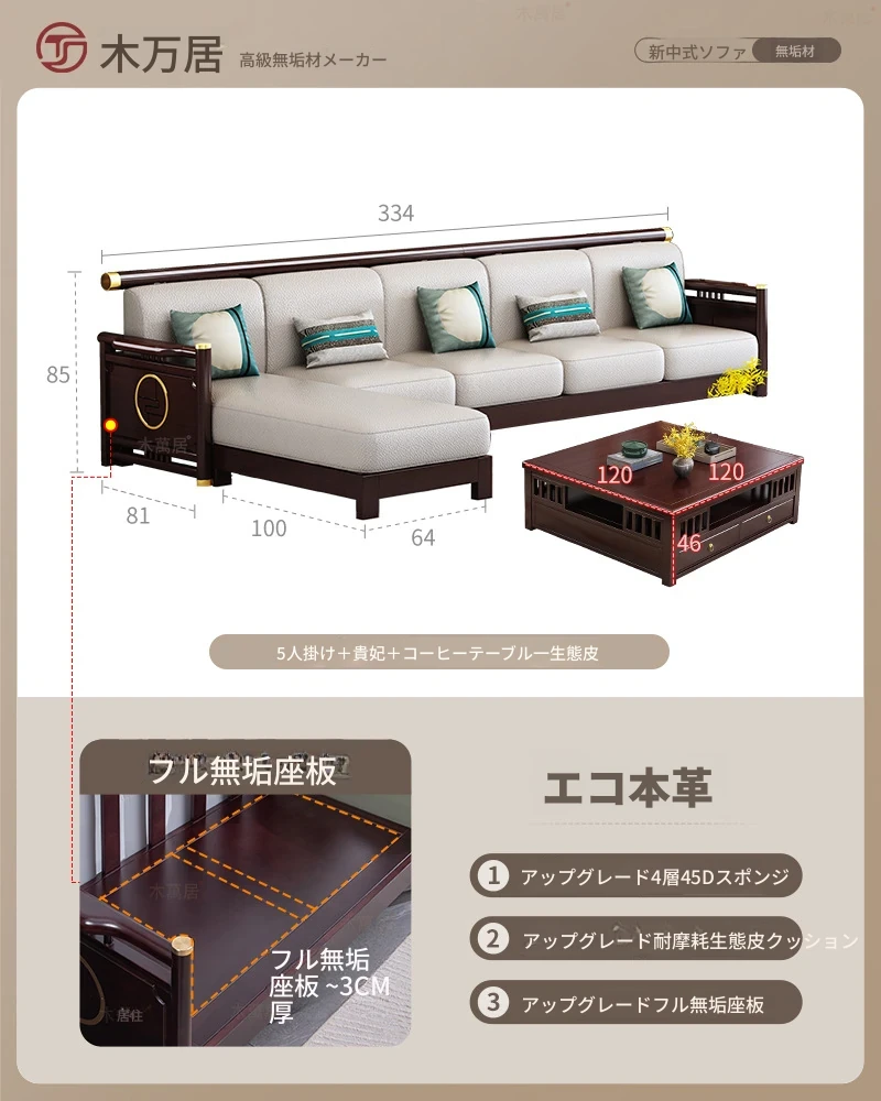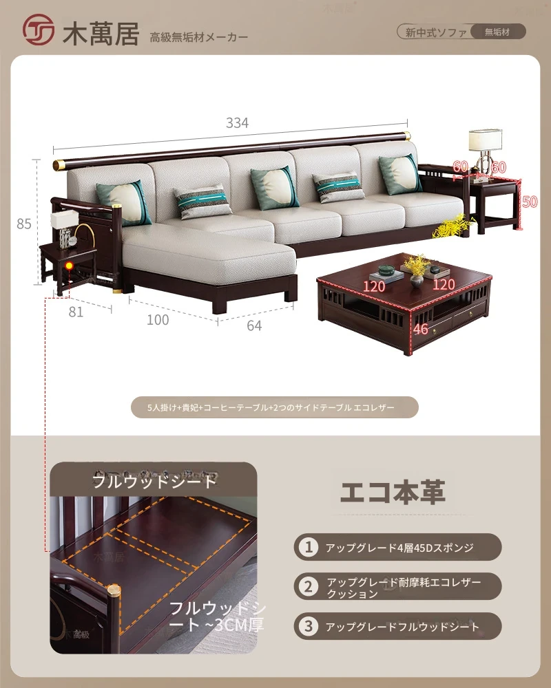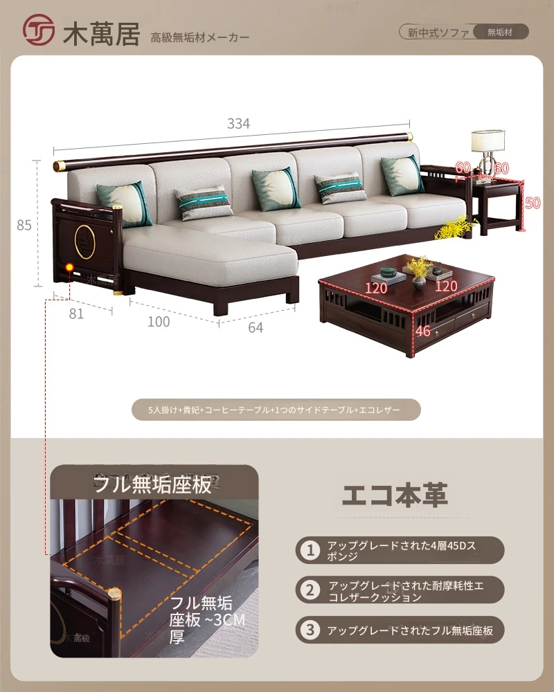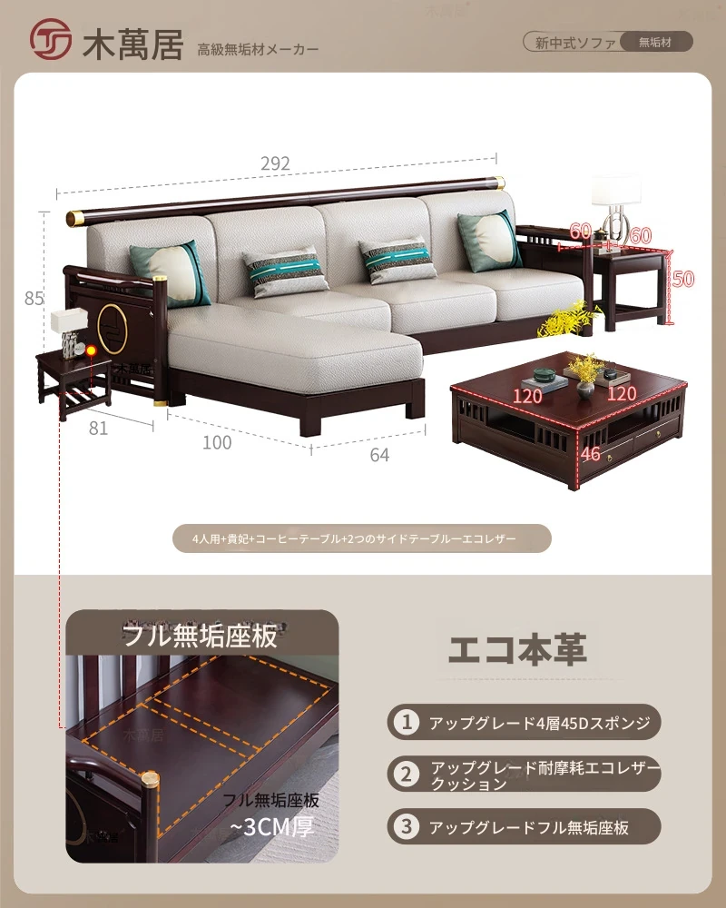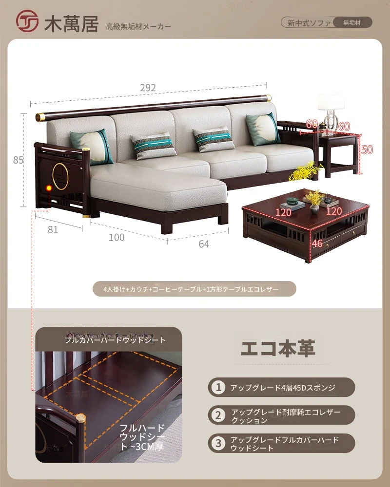 4人用+カウチ+ローテーブル+角テーブル*2【4層45Dウレタン+耐摩耗エコレザー+フル無垢板】