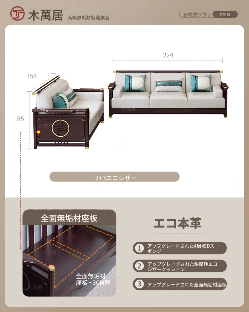 2+3+ローテーブル【4層45Dウレタン+耐摩耗エコレザー+フル無垢板】
