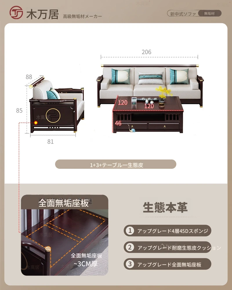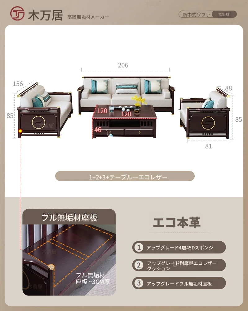 1+3+ローテーブル【4層45Dウレタン+耐摩耗エコレザー+フル無垢板】