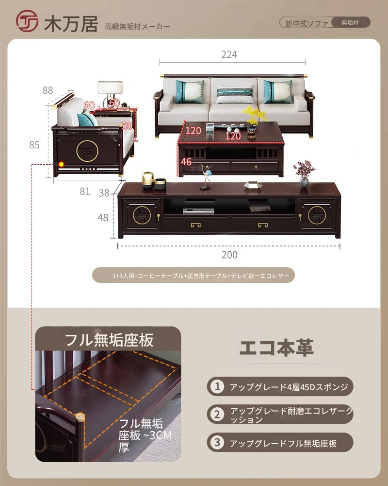 1+3+ローテーブル+角テーブル+テレビ台【4層45Dウレタン+耐摩耗エコレザー+フル無垢板】