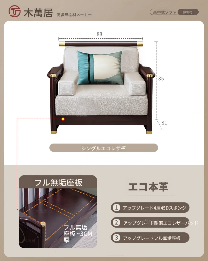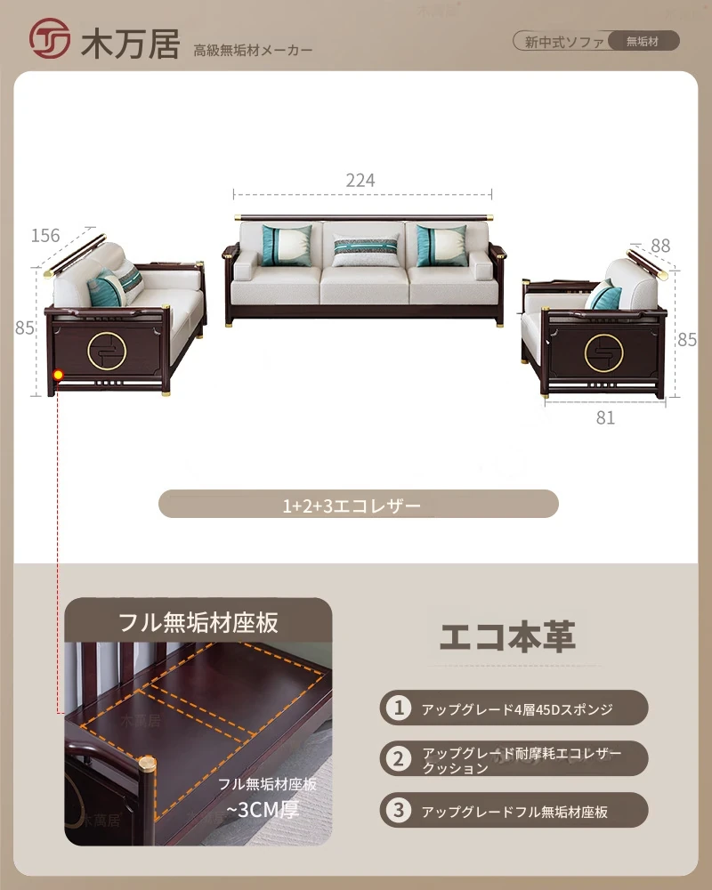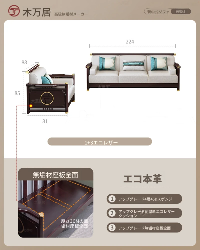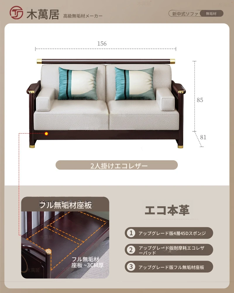 3人用【4層45Dウレタン+耐摩耗エコレザー+フル無垢板】