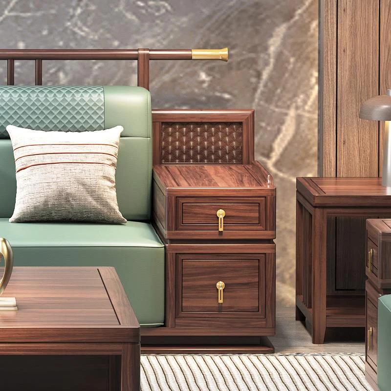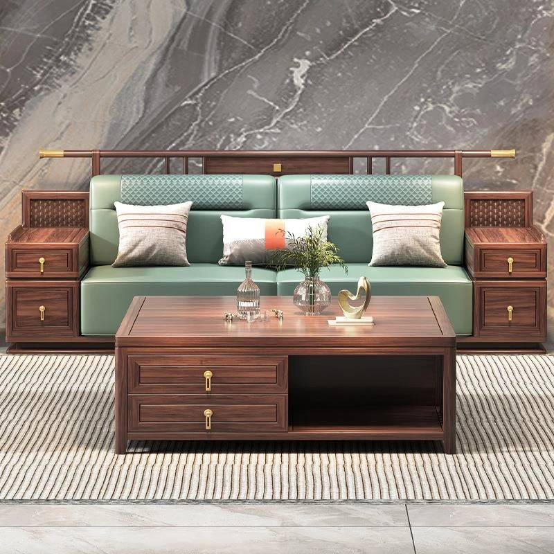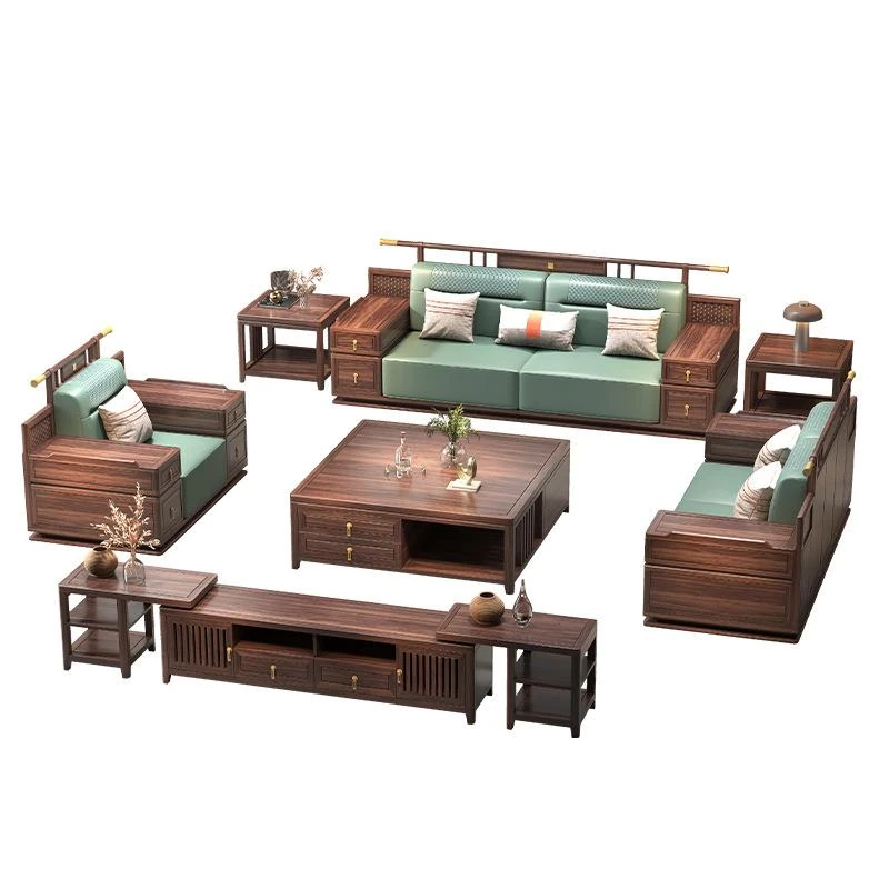 ウッディブラック新中式スタイルの無垢材ソファセット - モダンでラグジュアリー、広々としたリビングに最適!冬夏兼用、収納機能付きで、快適さと実用性を両立した家具です。