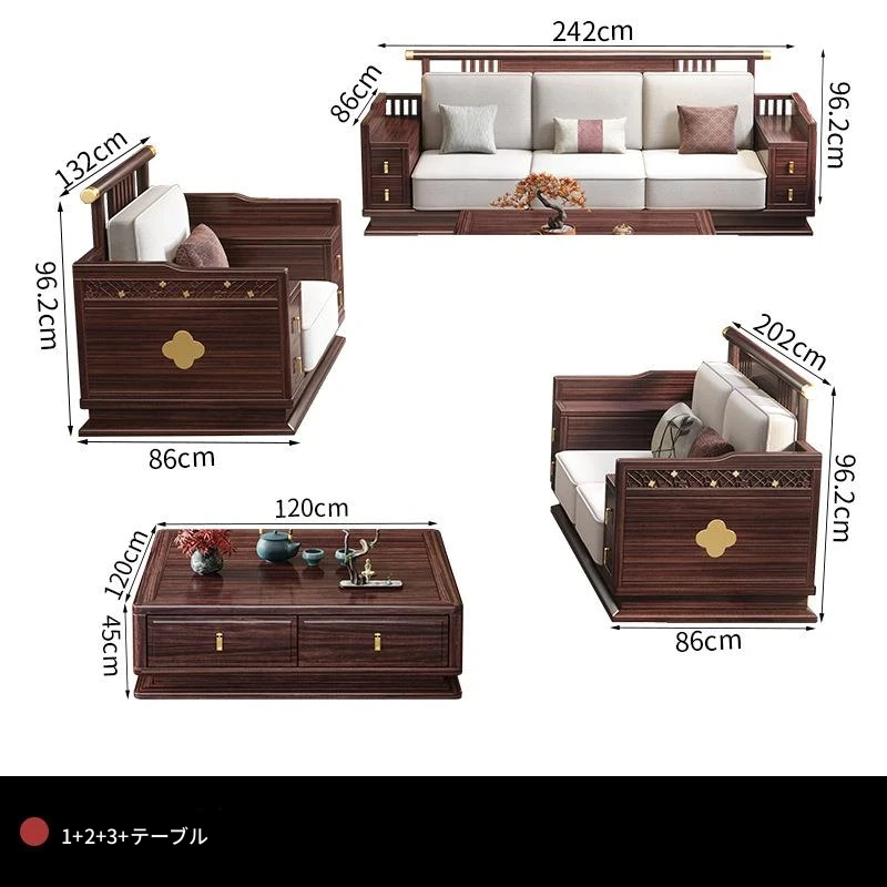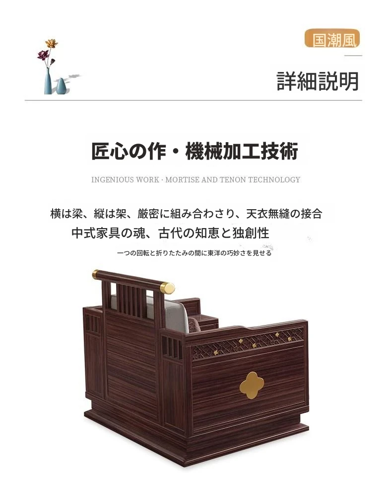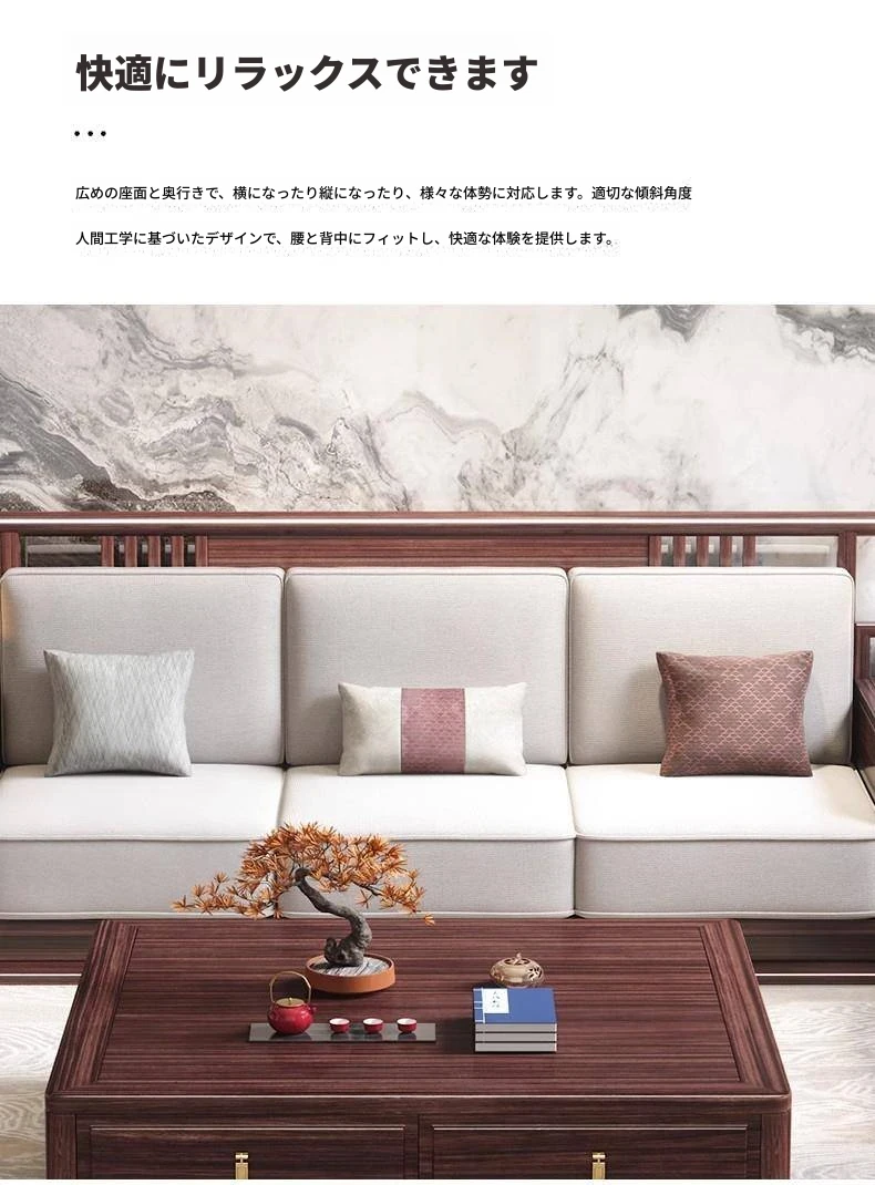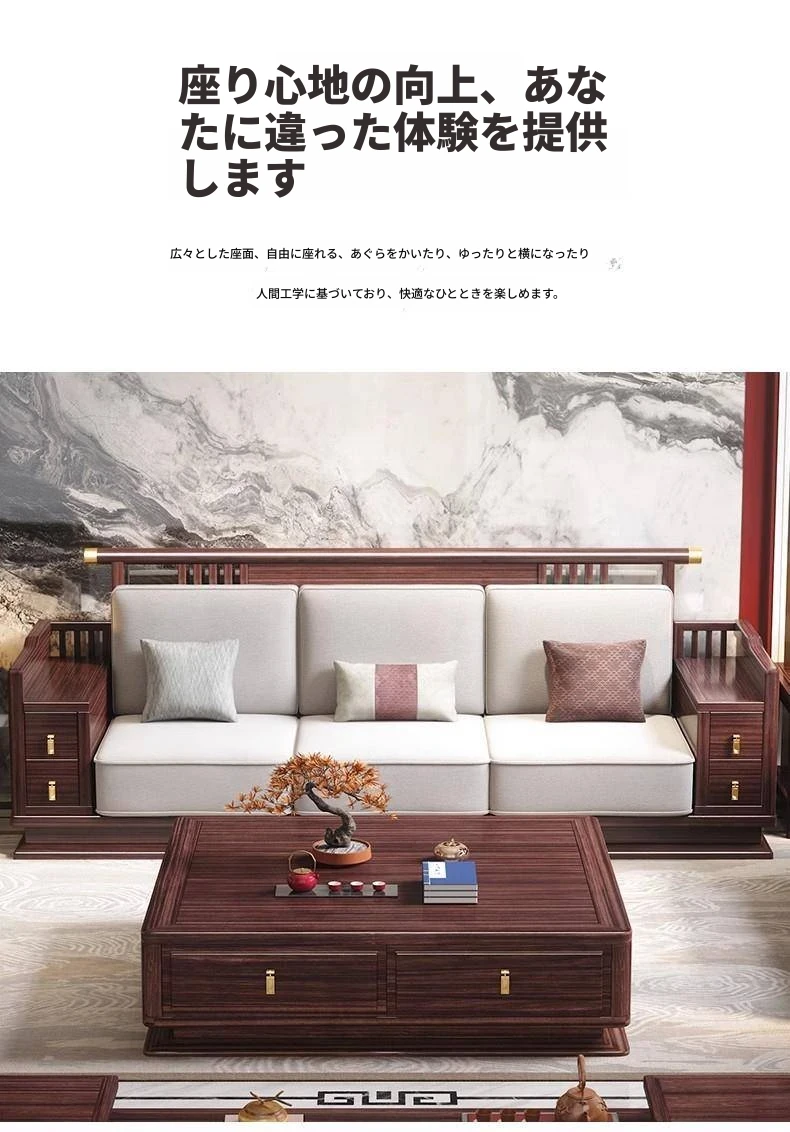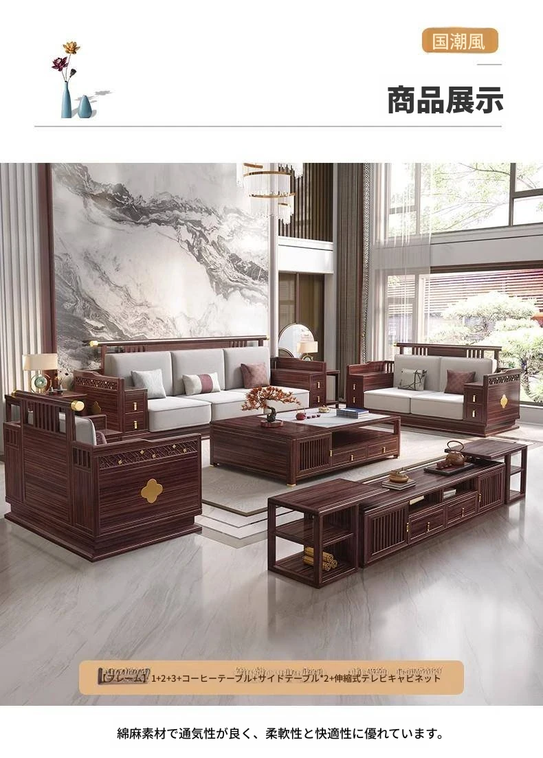 新中式スタイルの無垢材ソファセット - 高級ウッディー仕上げ、シンプルで洗練されたデザイン!大きなリビングルームや別荘にぴったりの家具です。快適なひとときを提供します!
