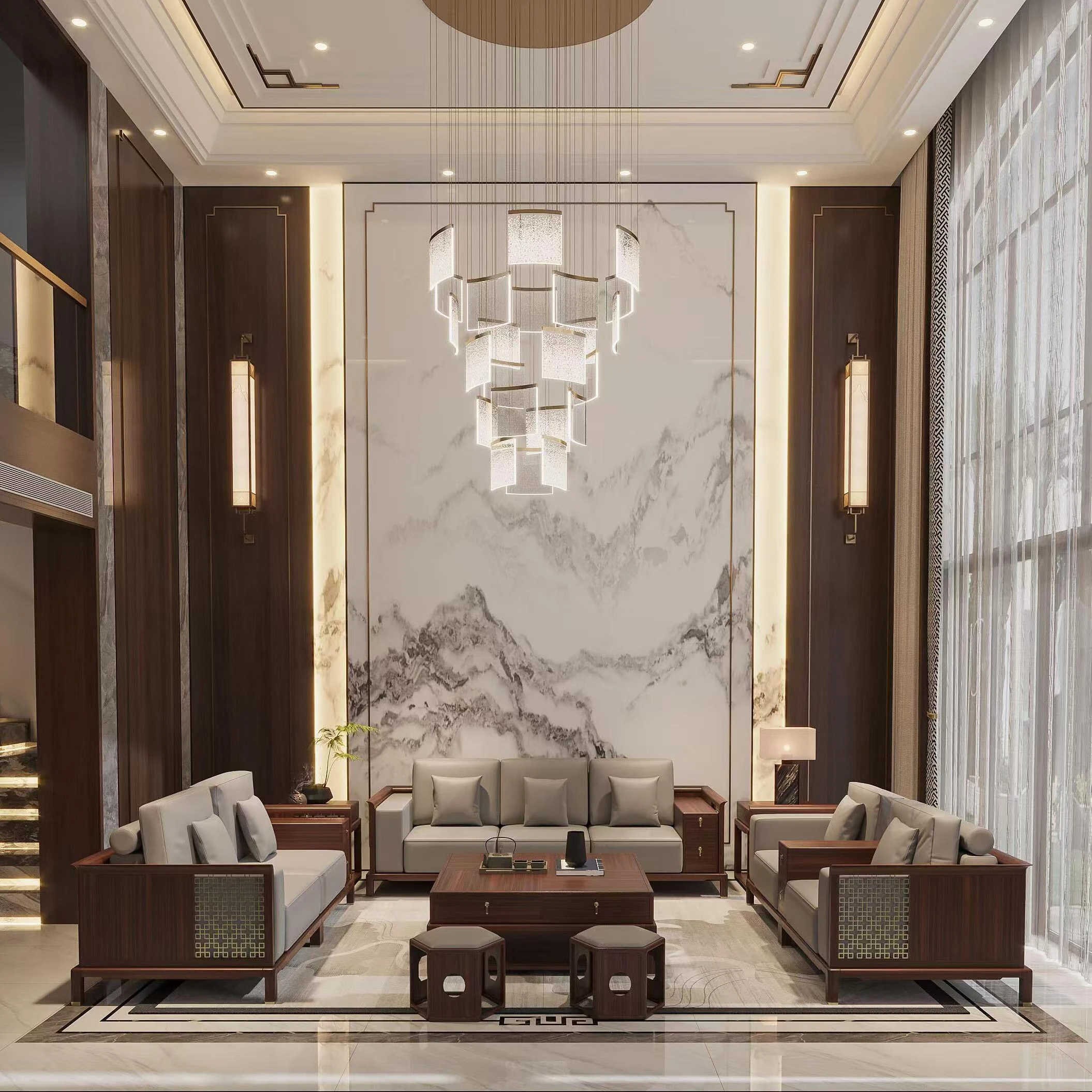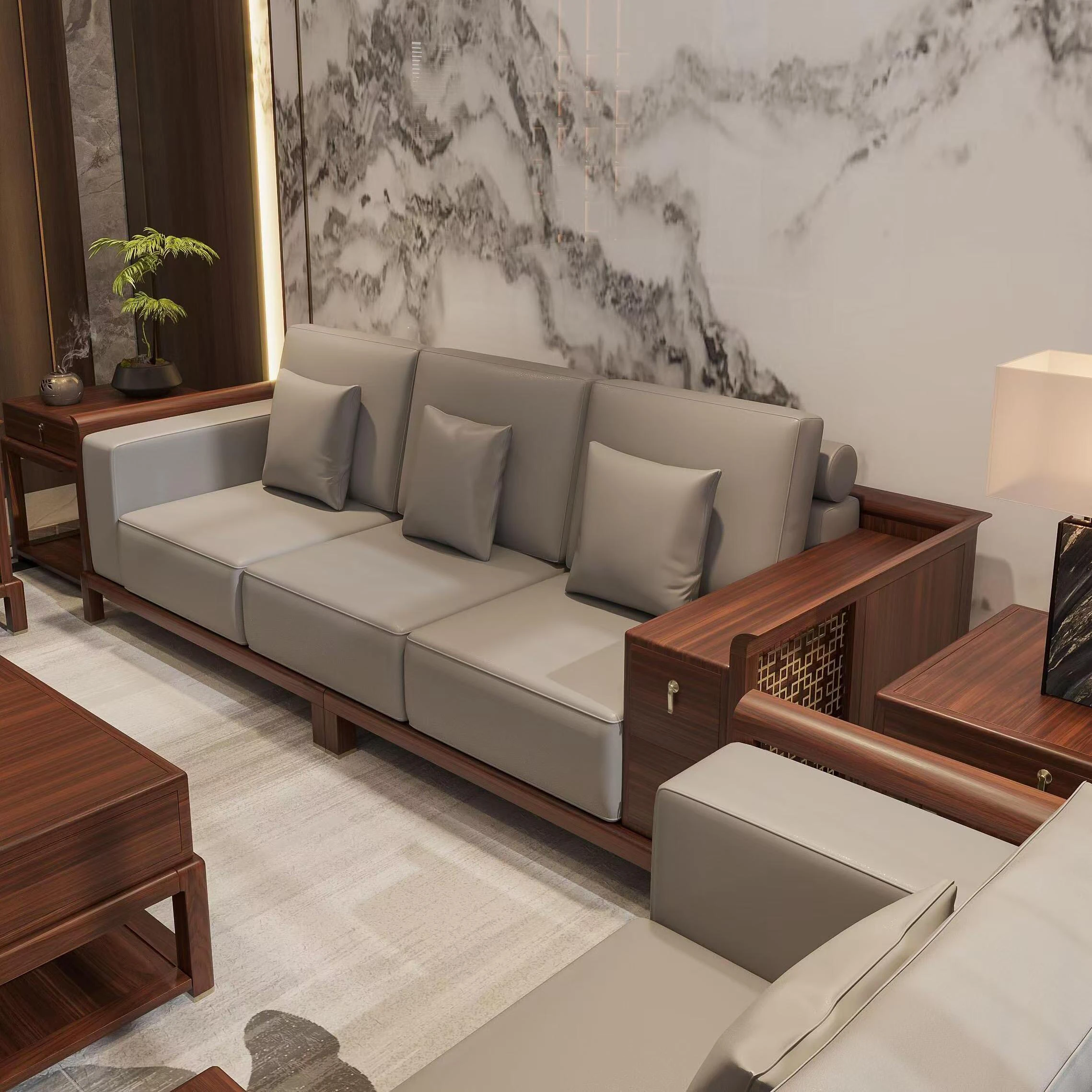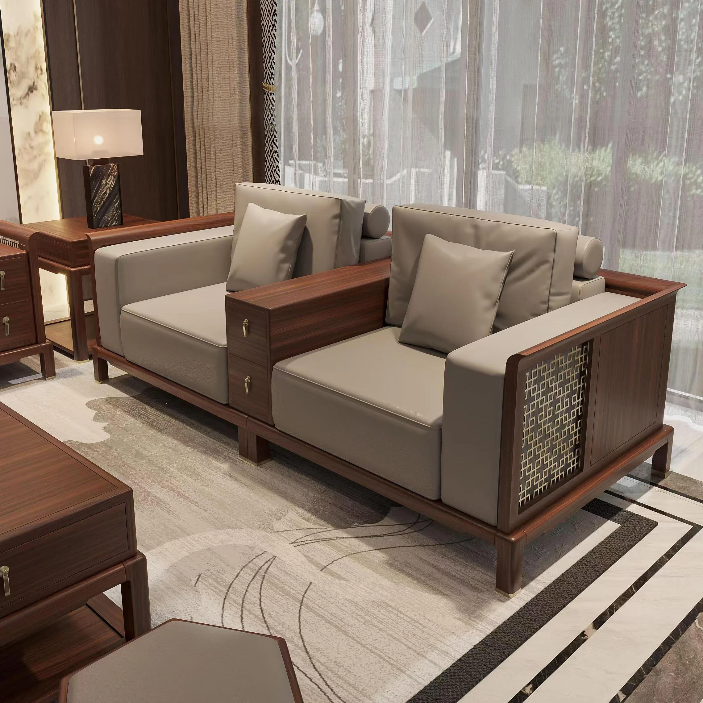 新中式スタイルの無垢材ソファセット - ヴィラや広々としたリビングに最適!シンプルで洗練されたデザイン、ウォールナット材を使用した高級感あふれるソファで、オフィスにも最適な空間を演出します。
