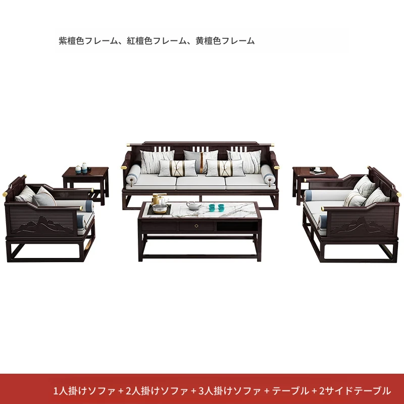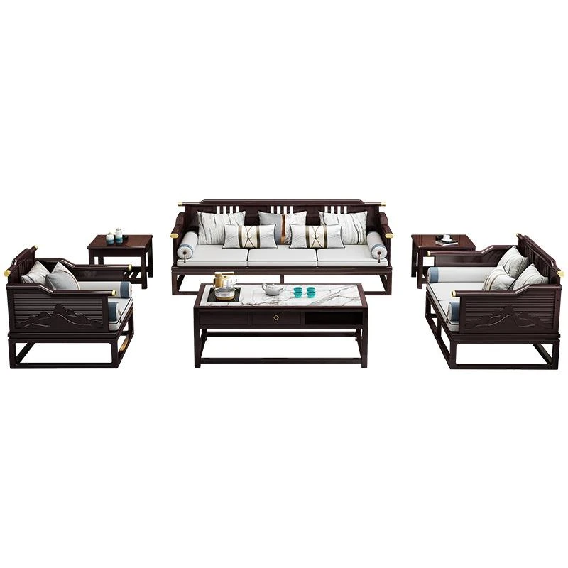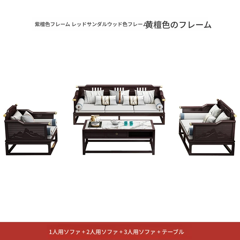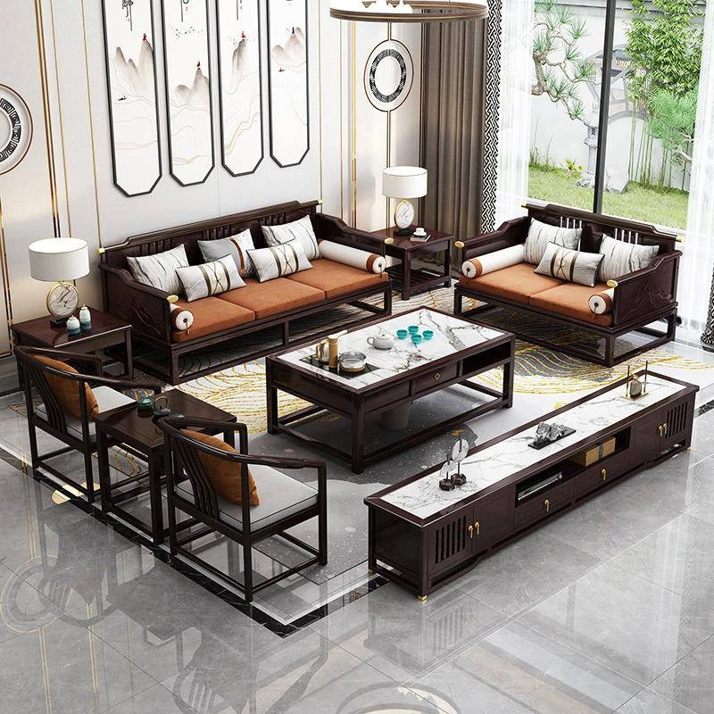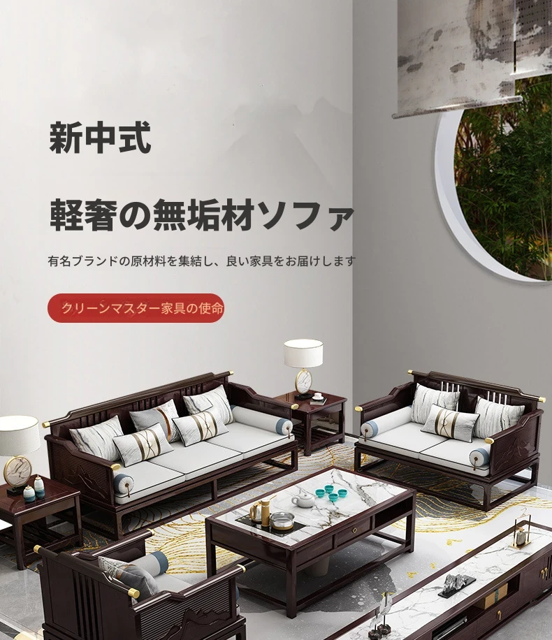 新中式全実木ソファセット - モダン&ミニマリスト、大型住宅向け、禅の趣を持つ軽奢華な別荘スタイル、中国風リビング家具。心地よい空間を演出し、あなたの生活に和の美を添えます!
