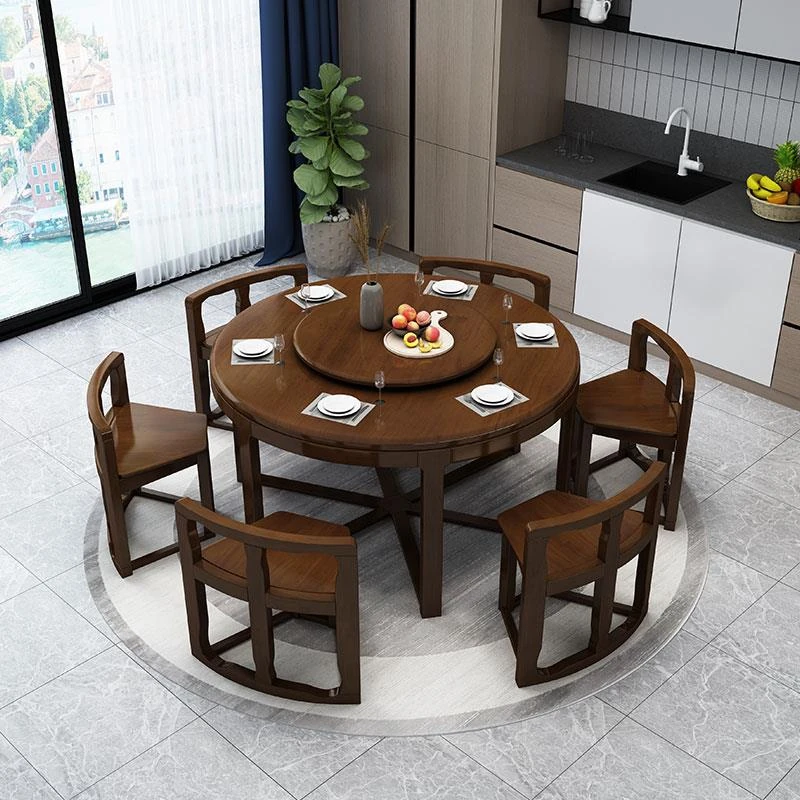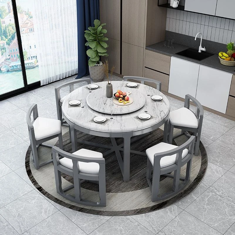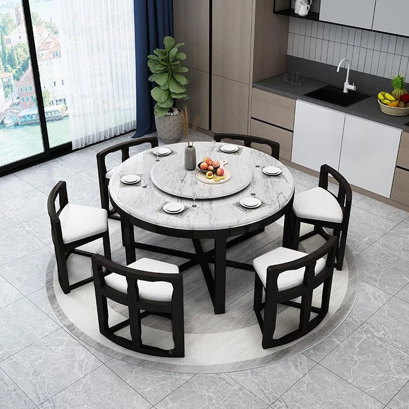 全実木製のダイニングテーブルセット - モダンでシンプルなデザイン、小型住宅に最適!隠れた円形デザインと回転式電磁炉付き、大理石風の美しい仕上げで、食卓を華やかに演出します。
