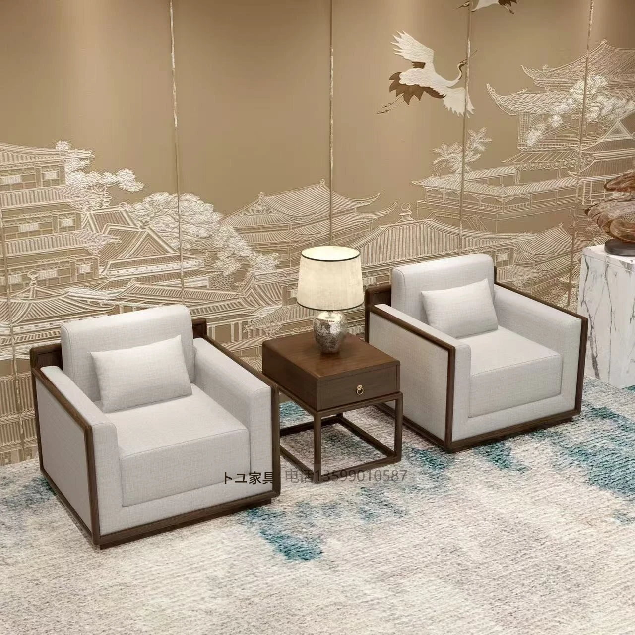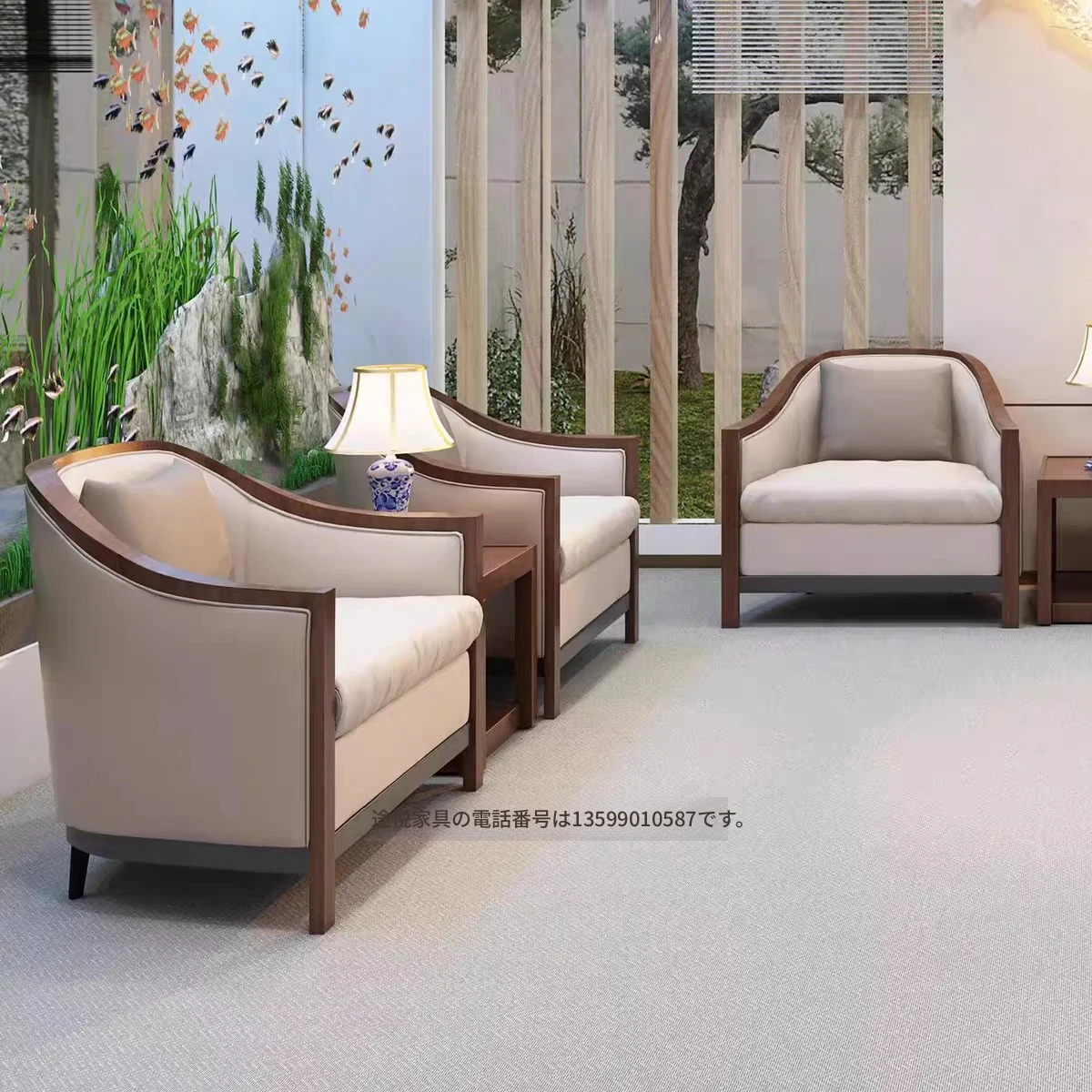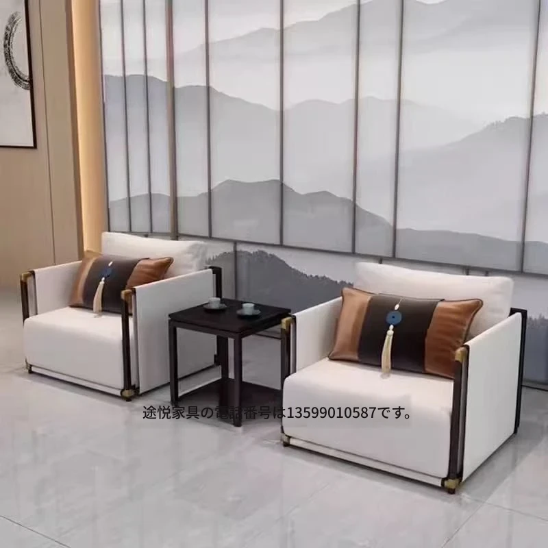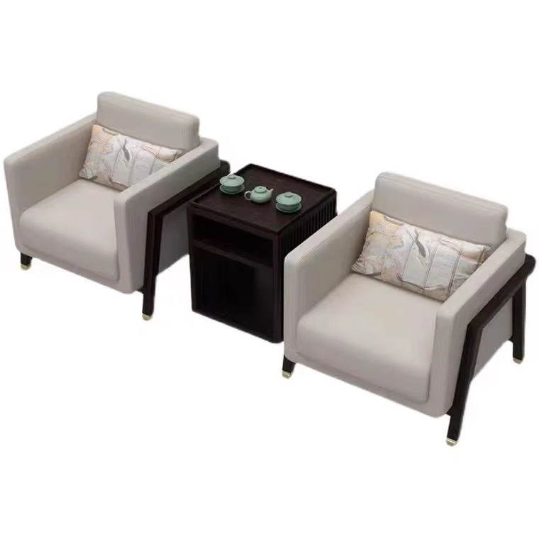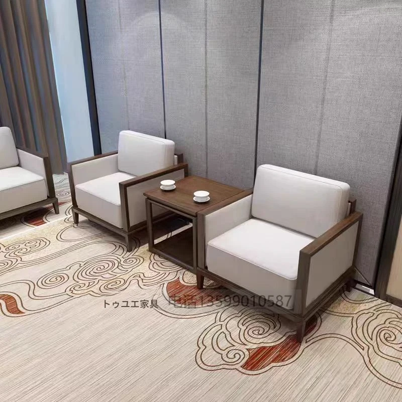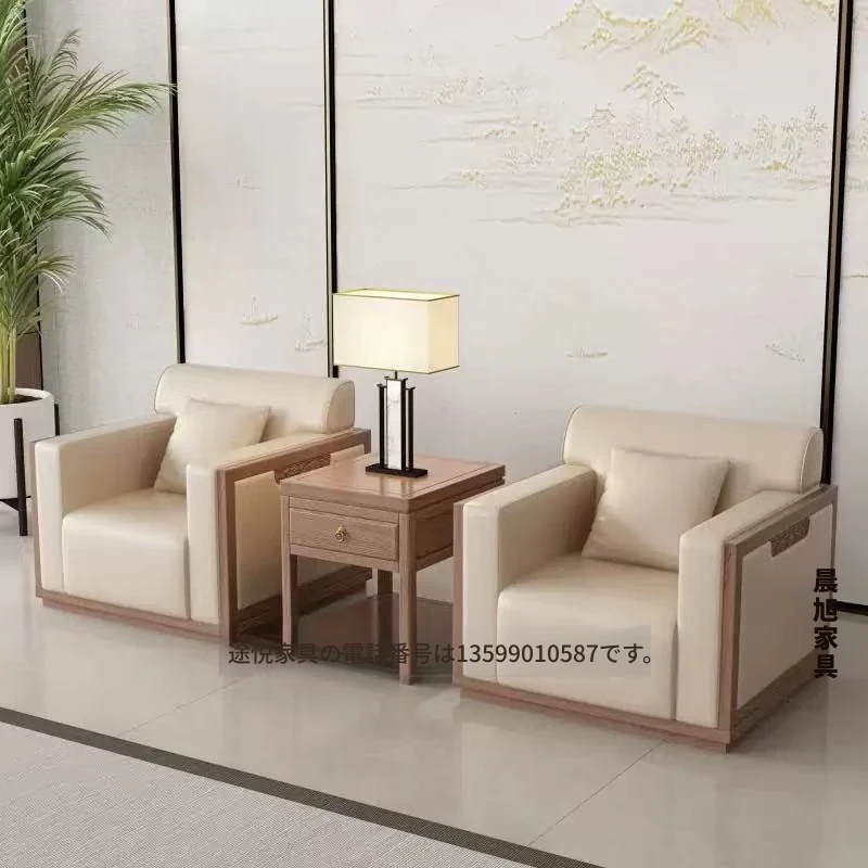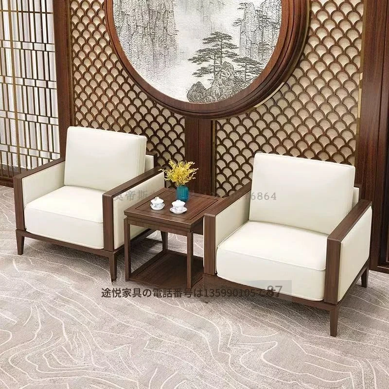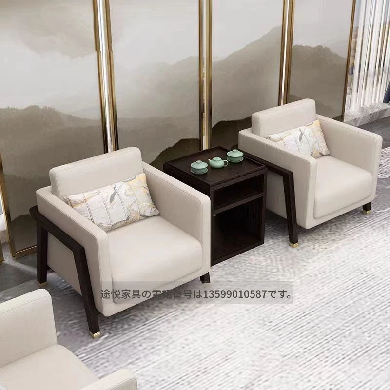 現代新中式洽談会議室用 VIP ソファーとティーテーブルのコンビネーション - シンプルでスタイリッシュな一人用無垢材オフィス家具で、訪問者をもてなす理想的な空間を演出します。