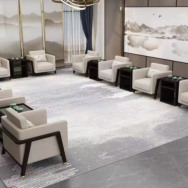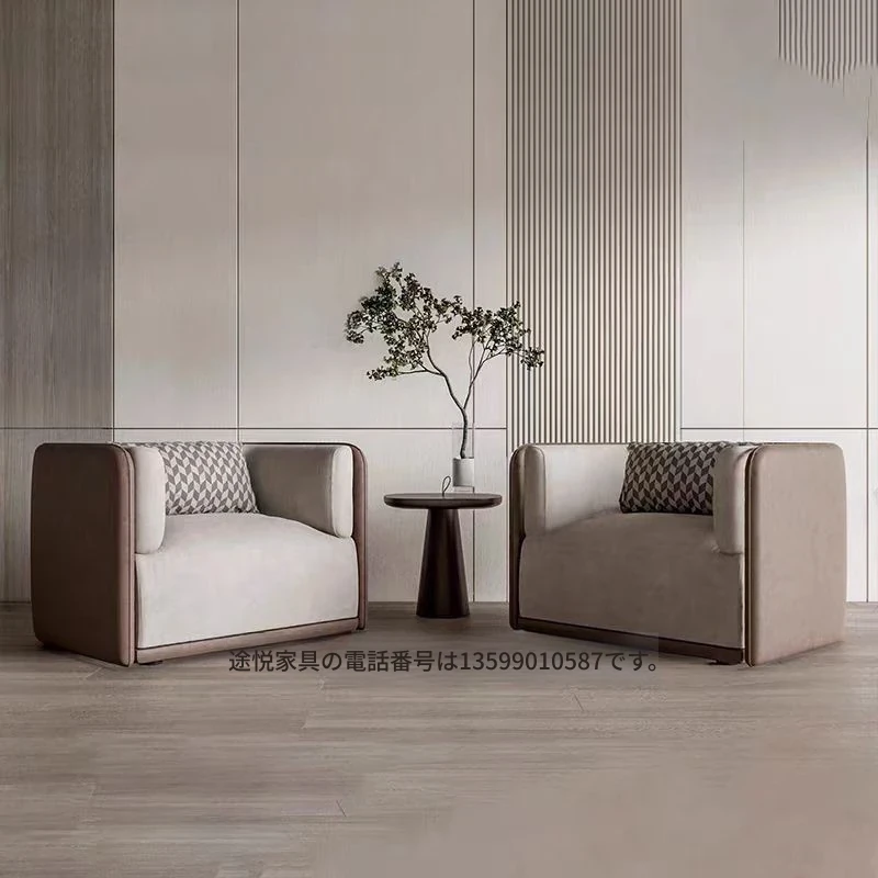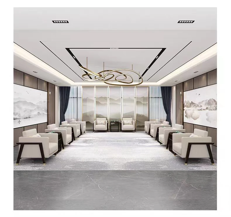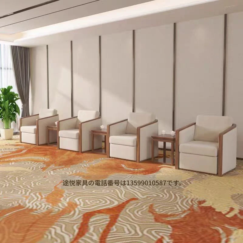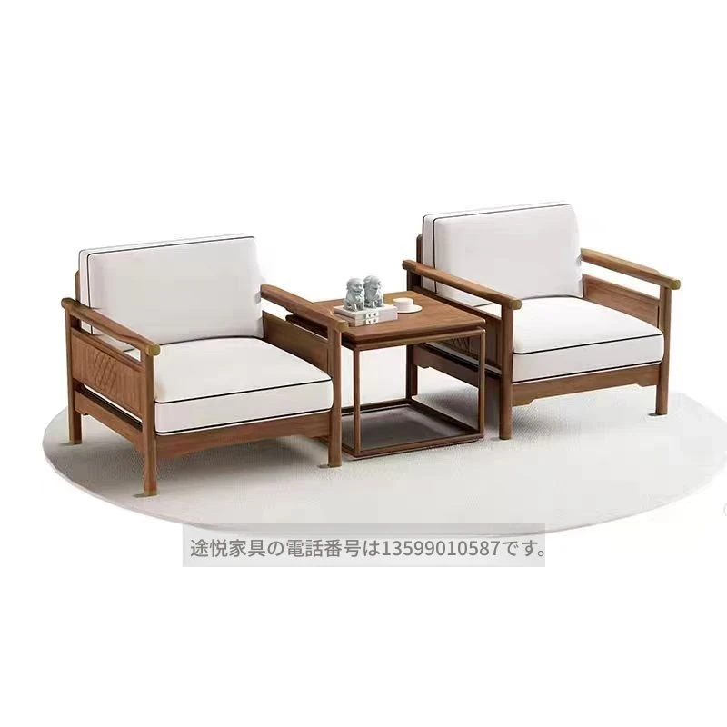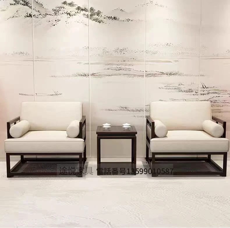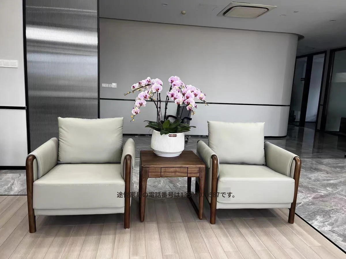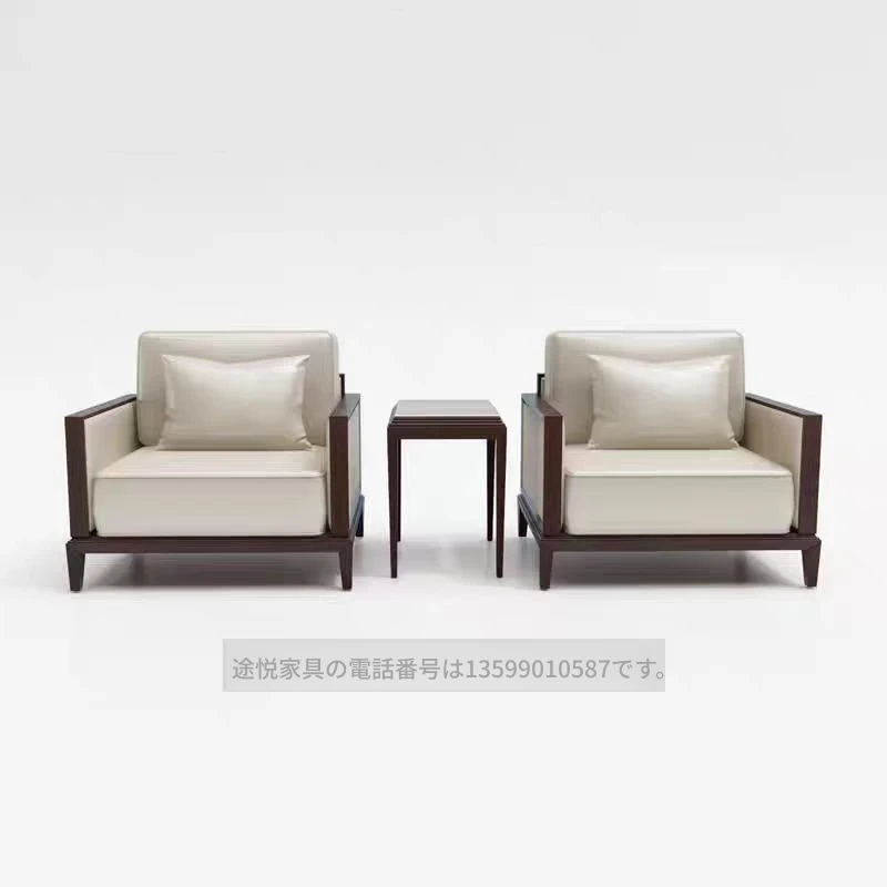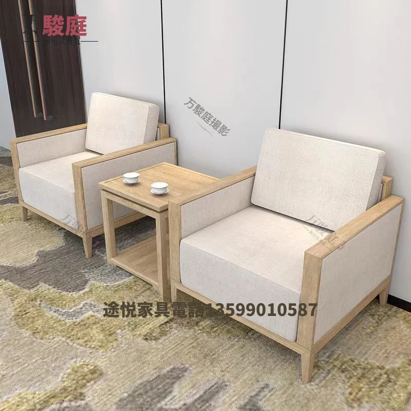 現代新中式洽談会議室用 VIP ソファーとティーテーブルのコンビネーション - シンプルでスタイリッシュな一人用無垢材オフィス家具で、訪問者をもてなす理想的な空間を演出します。