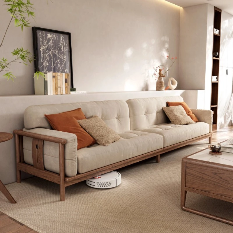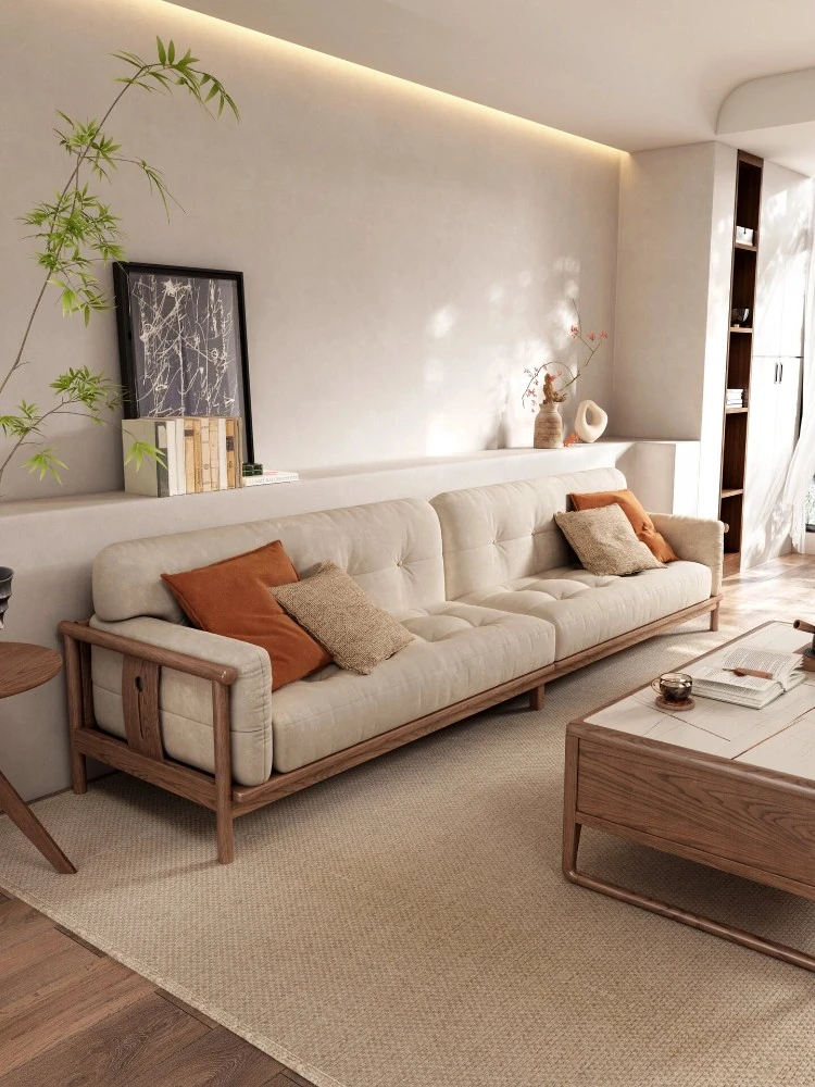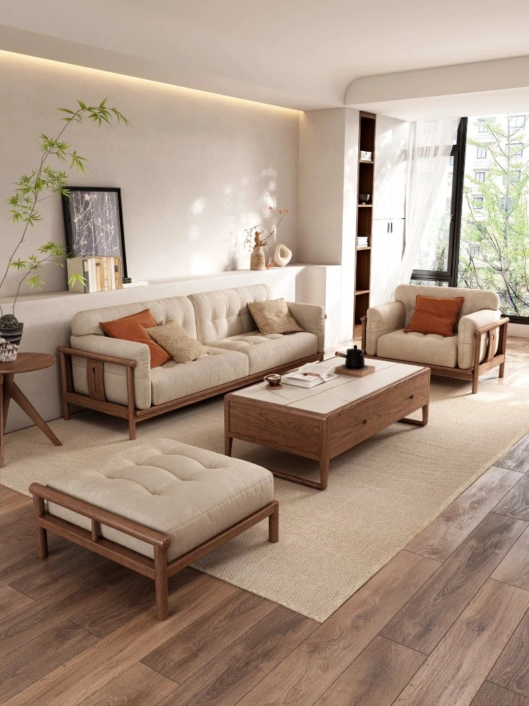 現代新中式デザインの実木ソファセット - 小型リビングに最適な木製カウチソファと布製クッションの組み合わせで、快適さとスタイルを両立。おしゃれな空間を演出する家具セット!