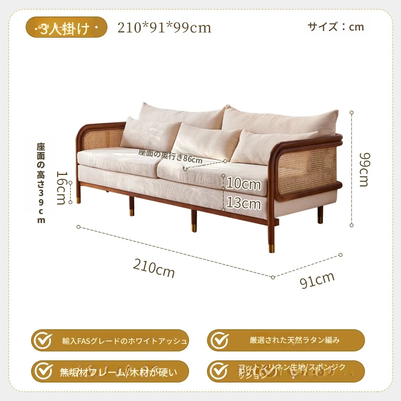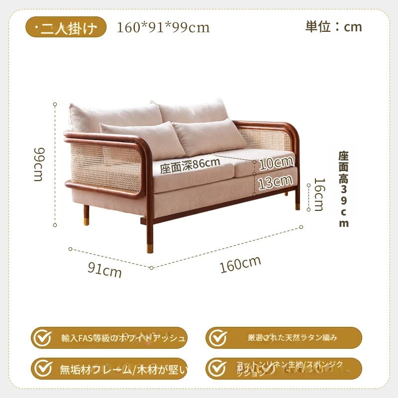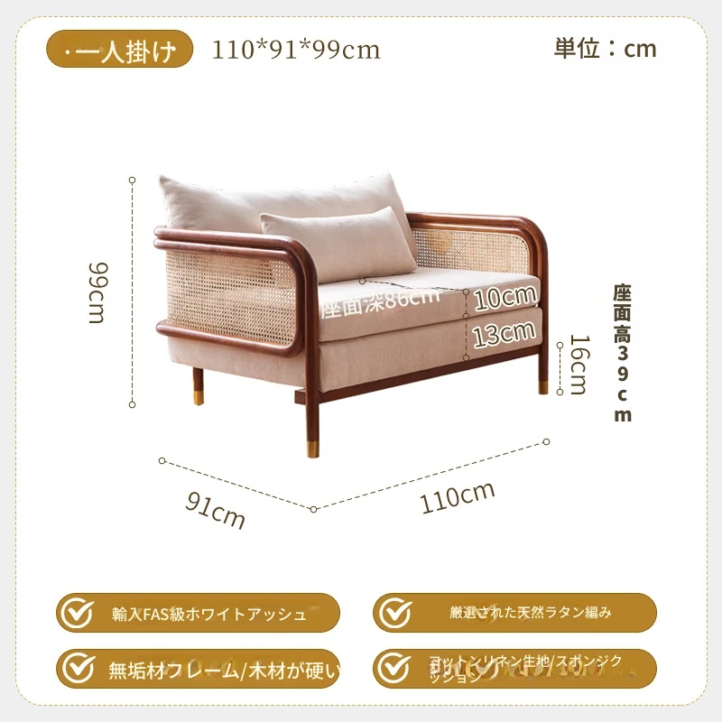 新中式風格のラタン編み無垢材ソファ - 侘び寂びの美しさを感じる、リビングにぴったりの布製ソファ。快適なスプリングとホワイトアッシュウッドのデザインで、1人用、2人用、3人用を揃えています!