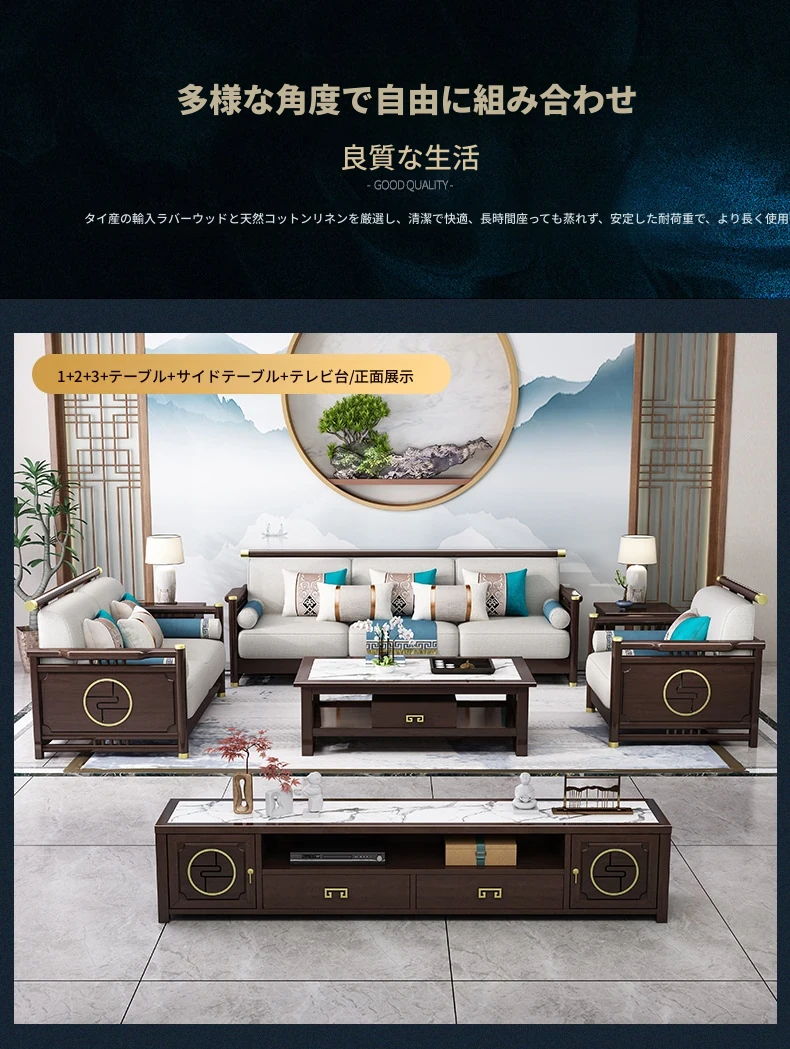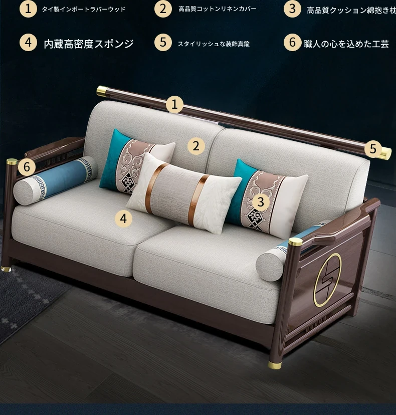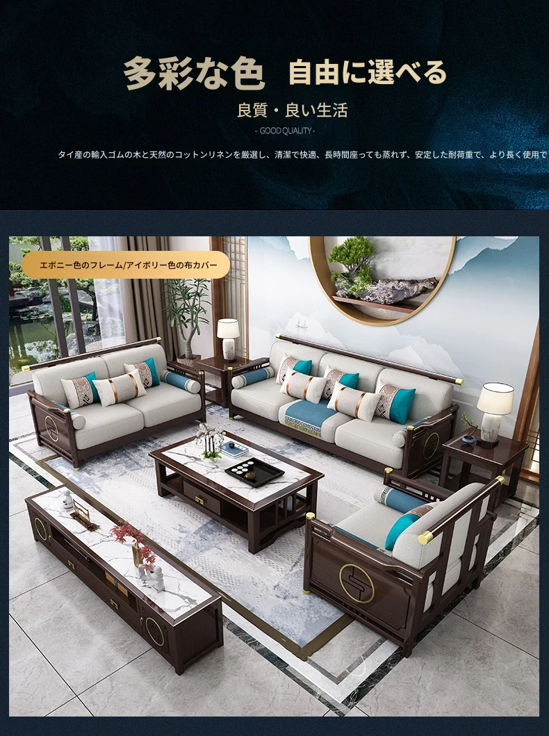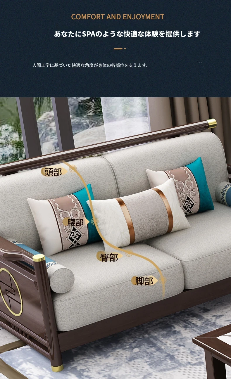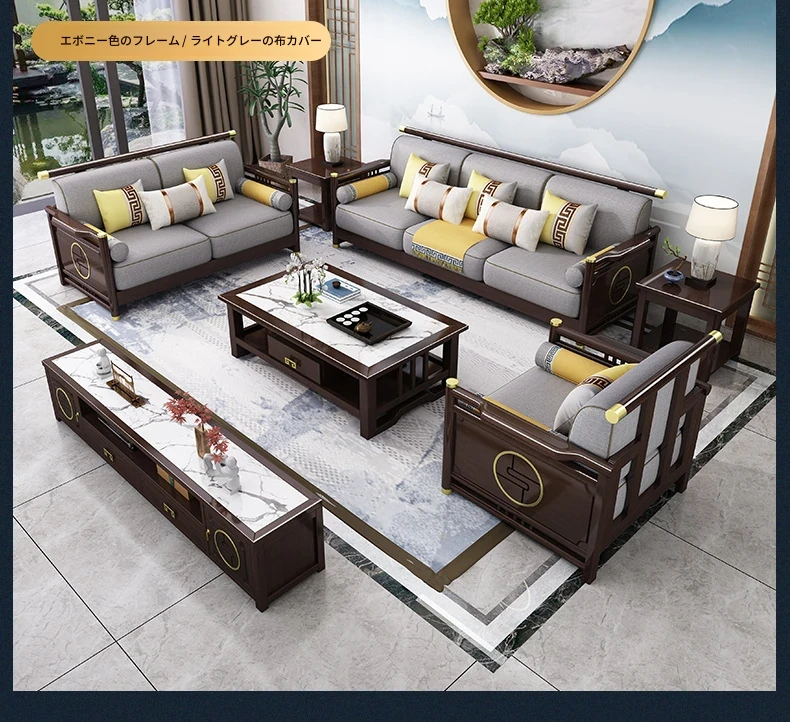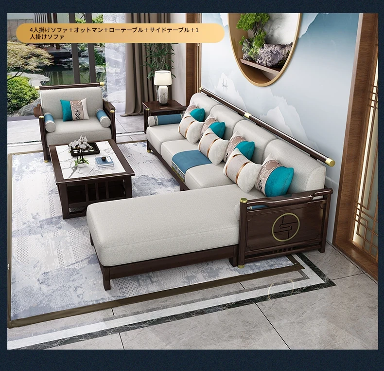 新中式スタイルの無垢材ソファセット - シンプルでおしゃれな小型住宅向け、ラバーウッド製のリビング用家具、優雅なカウチコーナー布製ソファで居心地の良い空間を演出!