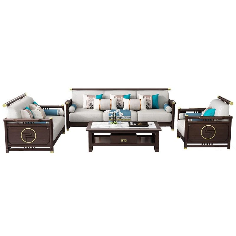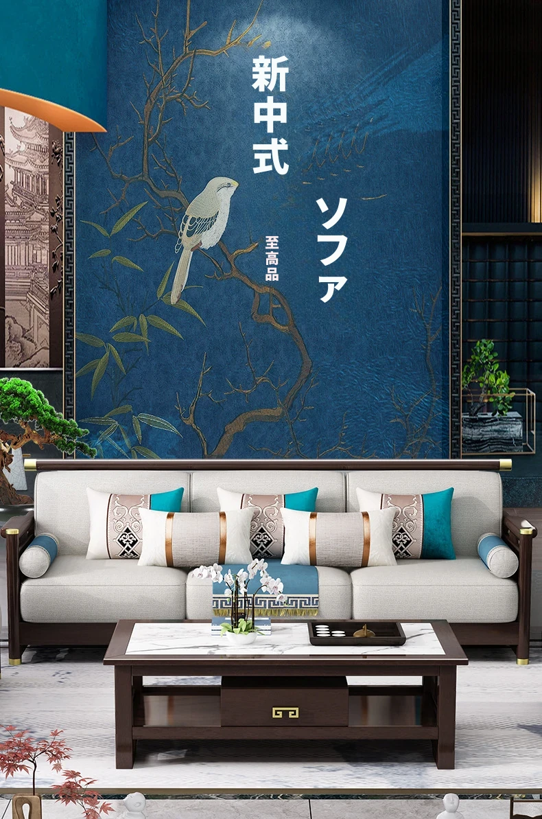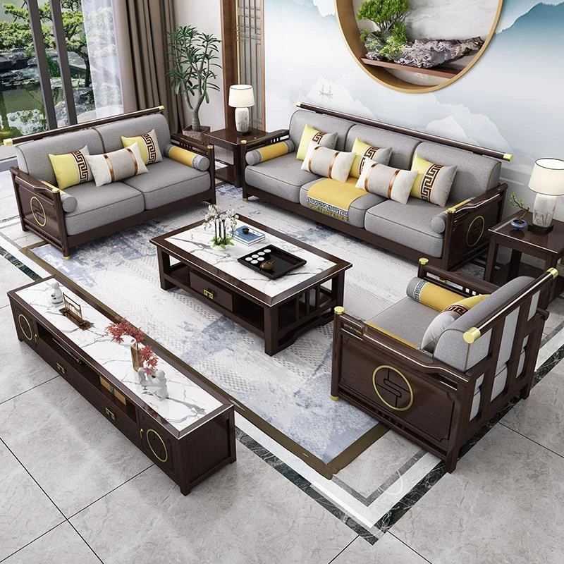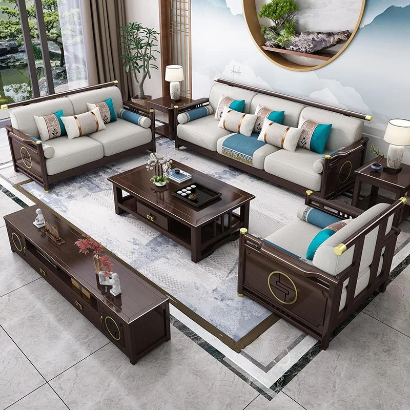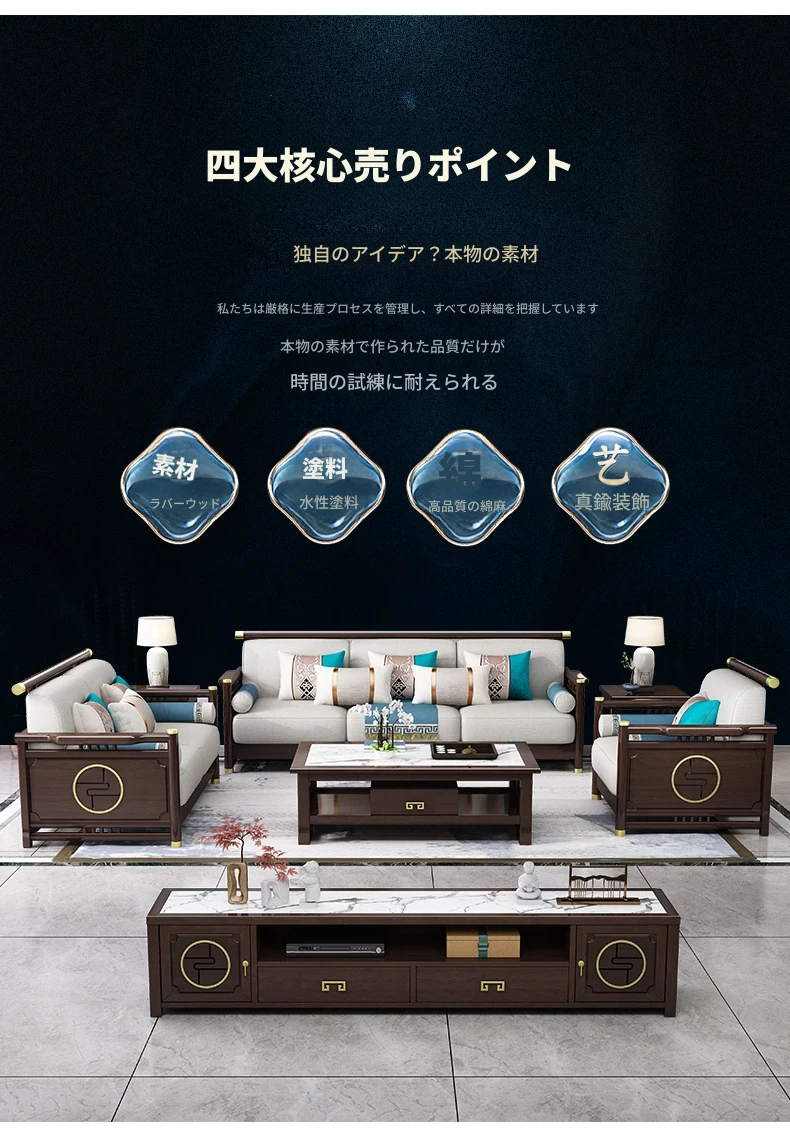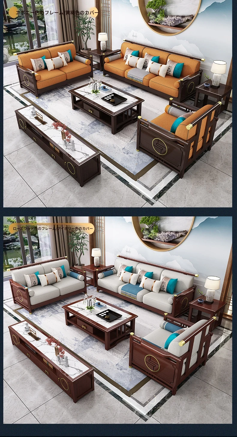 新中式スタイルの無垢材ソファセット - シンプルでおしゃれな小型住宅向け、ラバーウッド製のリビング用家具、優雅なカウチコーナー布製ソファで居心地の良い空間を演出!