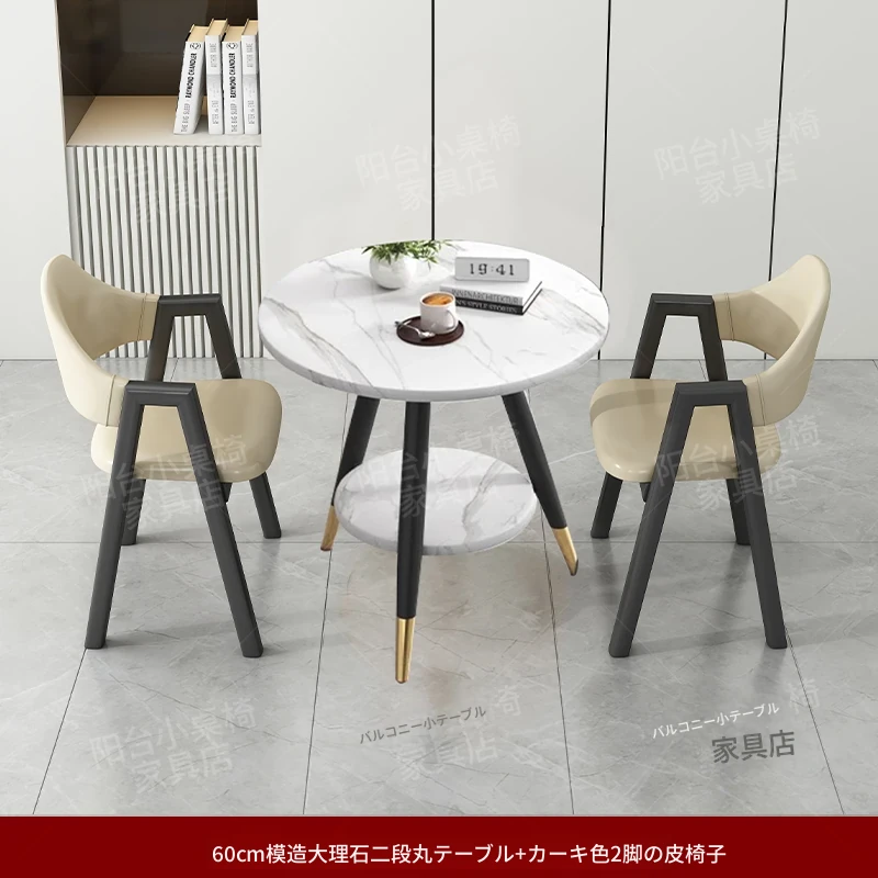 カーキ色2人用レザー椅子+60仿大理丸テーブル