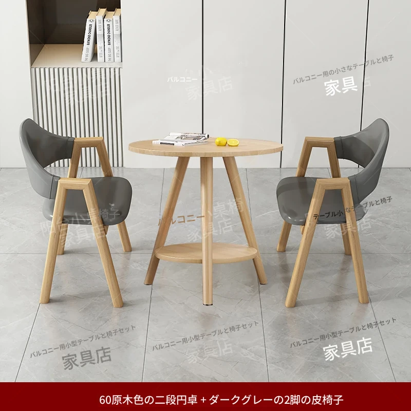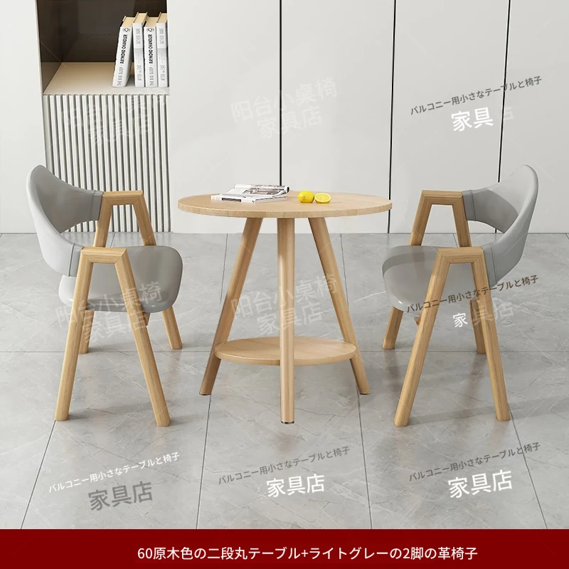 淡灰色2人用レザー椅子+60原木色丸テーブル