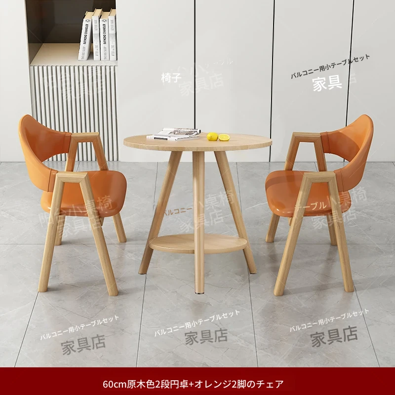 オレンジ色2人用レザー椅子+60原木色丸テーブル