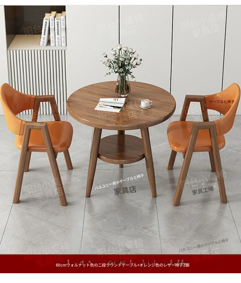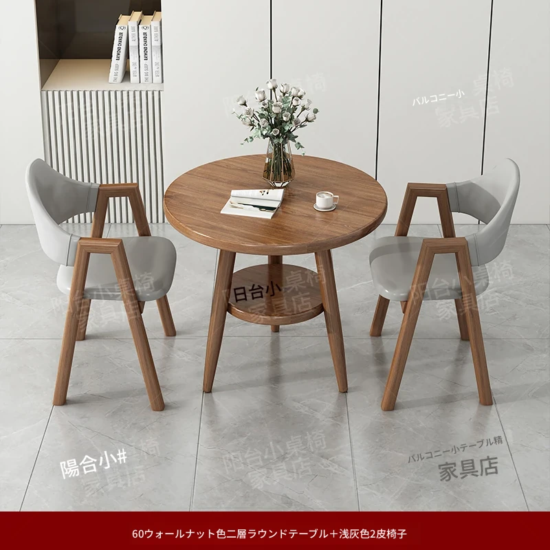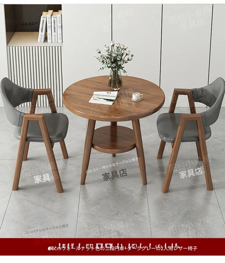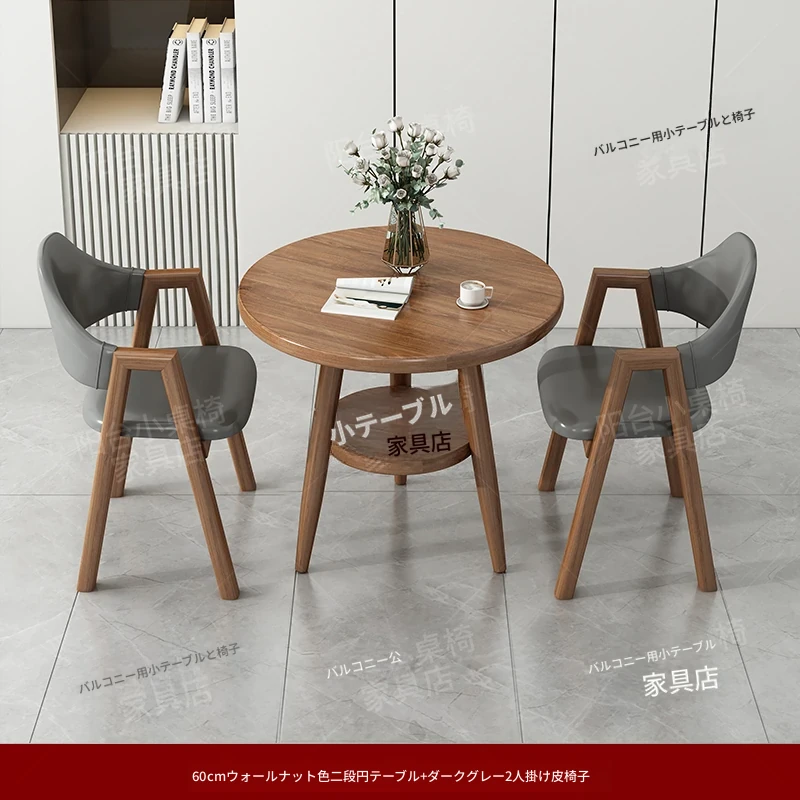 淡灰色2人用レザー椅子+60胡桃色丸テーブル