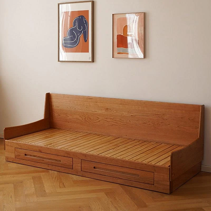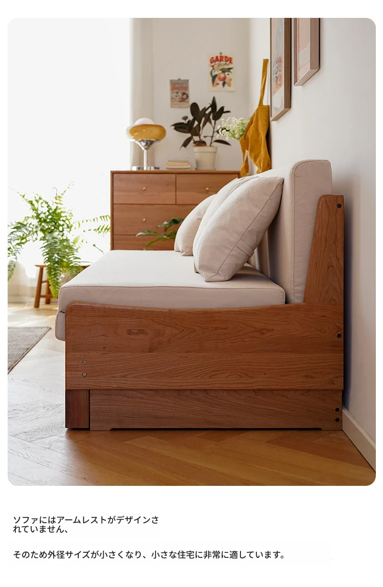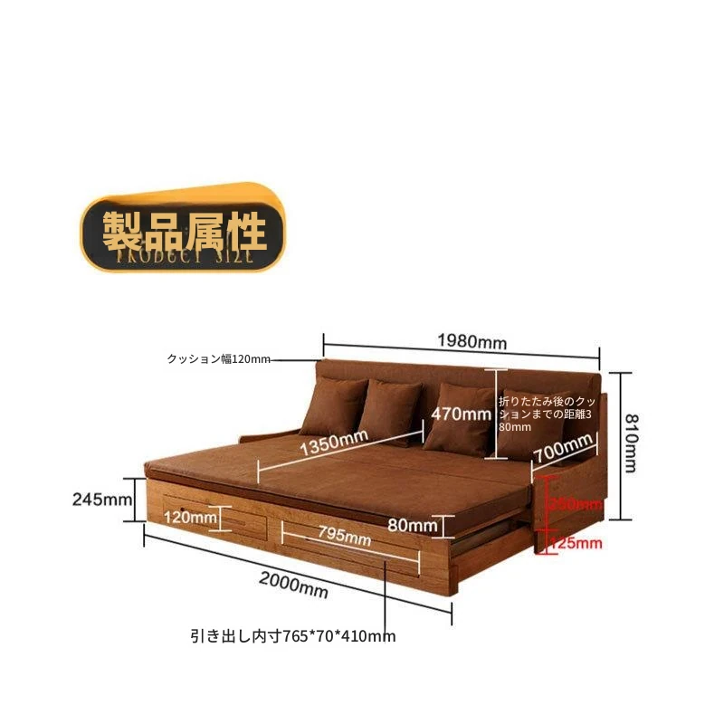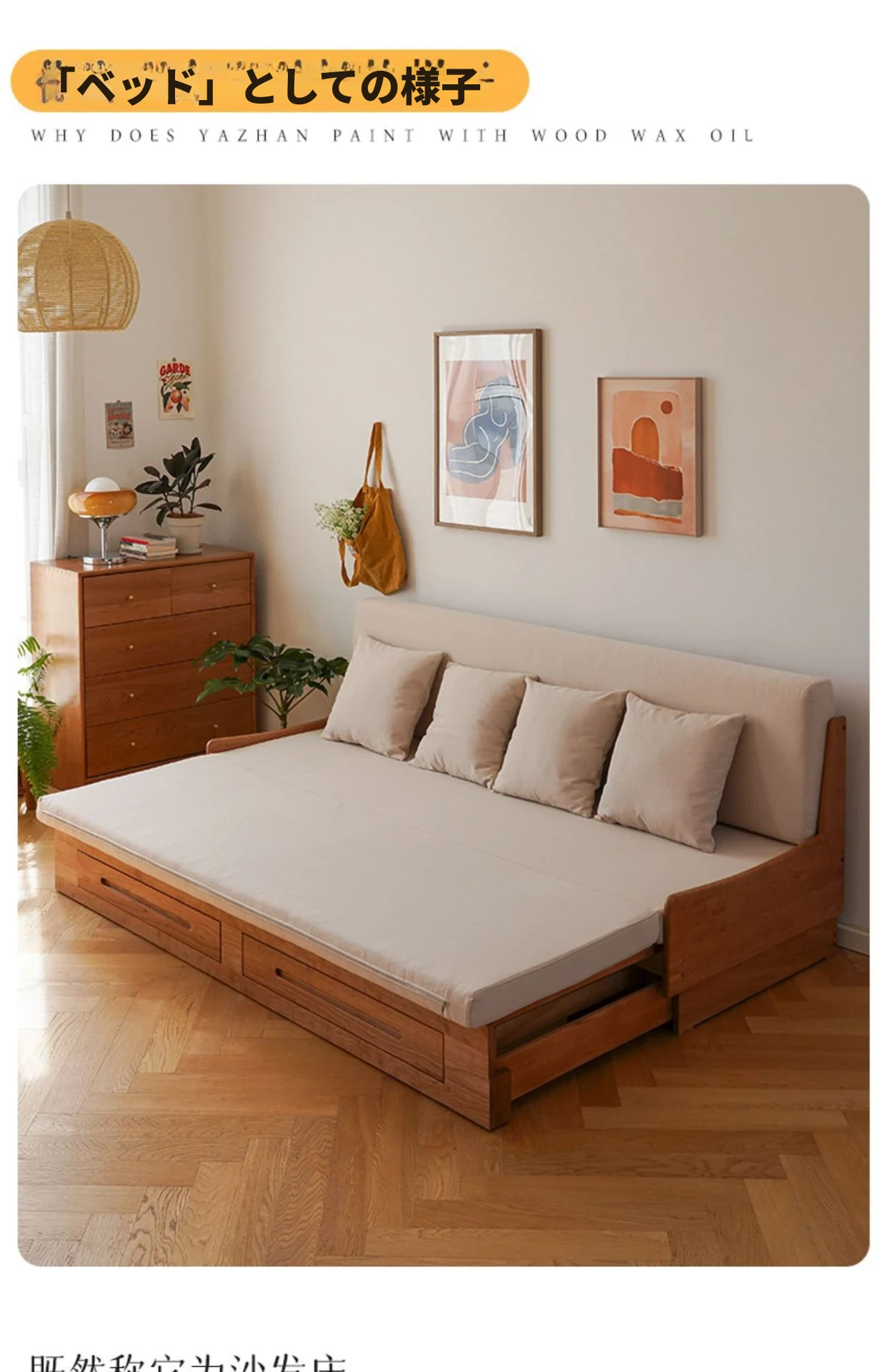 北米桜の木製ソファベッド、全実木の引き出し式収納付き!コンパクトな小型住宅に最適な伸縮式テクノロジー布ソファで、快適な座り心地とおしゃれなデザインを両立!